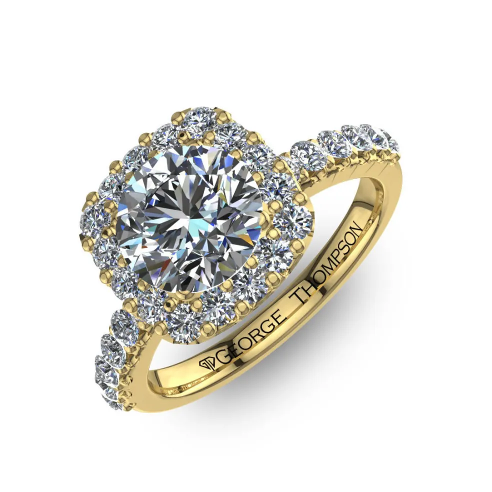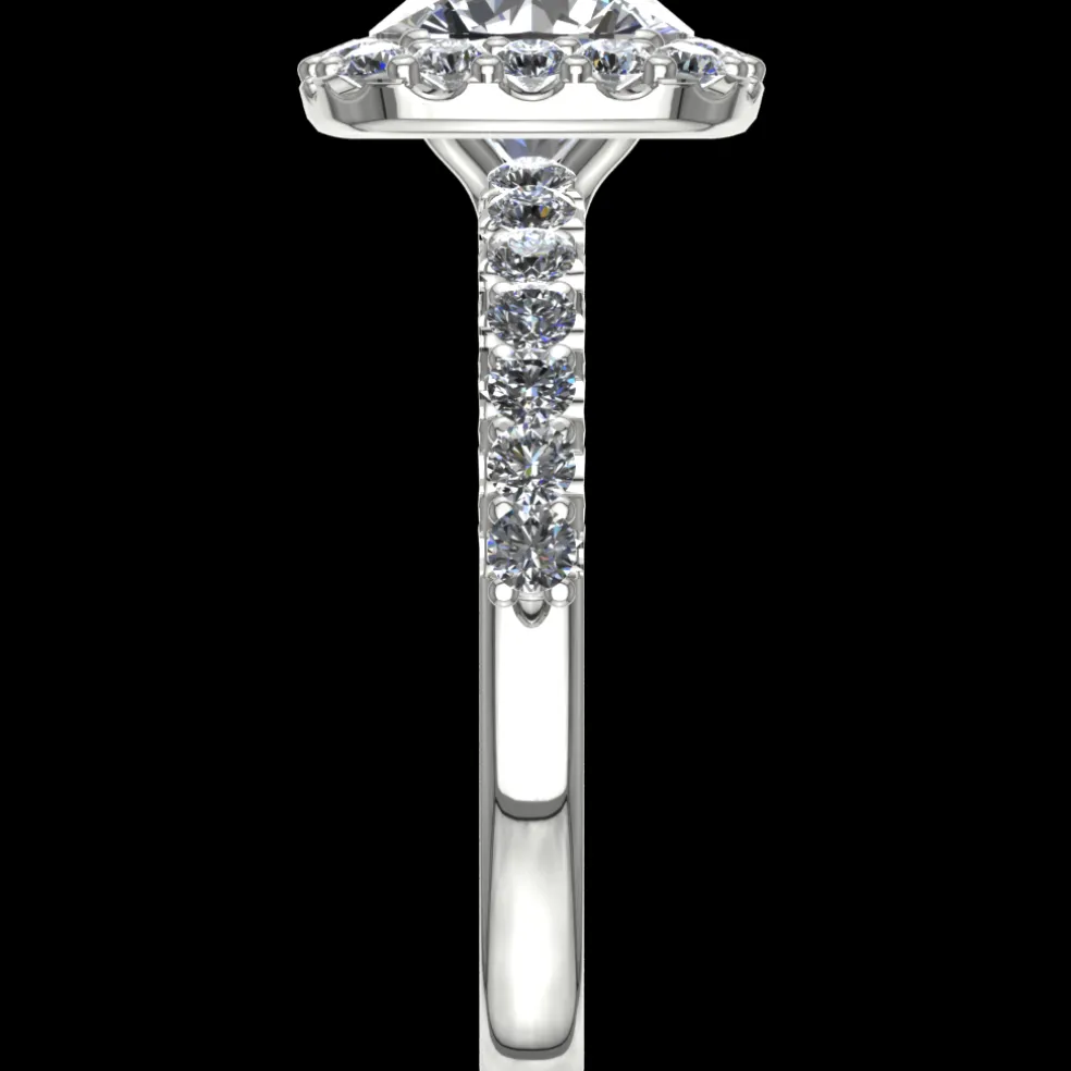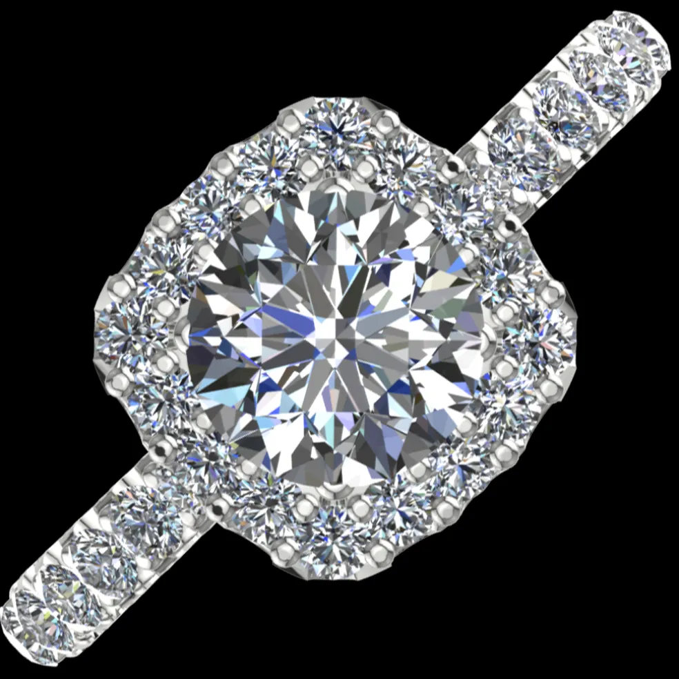 Behold the stunning Cesta, a breathtaking expression of love and commitment. This dazzling engagement ring features a center Round Brilliant Diamond of approximately 1.50ct, brilliantly accented by 30 Round Brilliant diamonds with an approximate total weight of 0.40cts. The total diamond weight of this ring is approximately 1.90cts, ensuring it glimmers from every angle. Crafted from the finest 14kt white gold, it weighs approximately 4.00 grams, ensuring both durability and comfort.