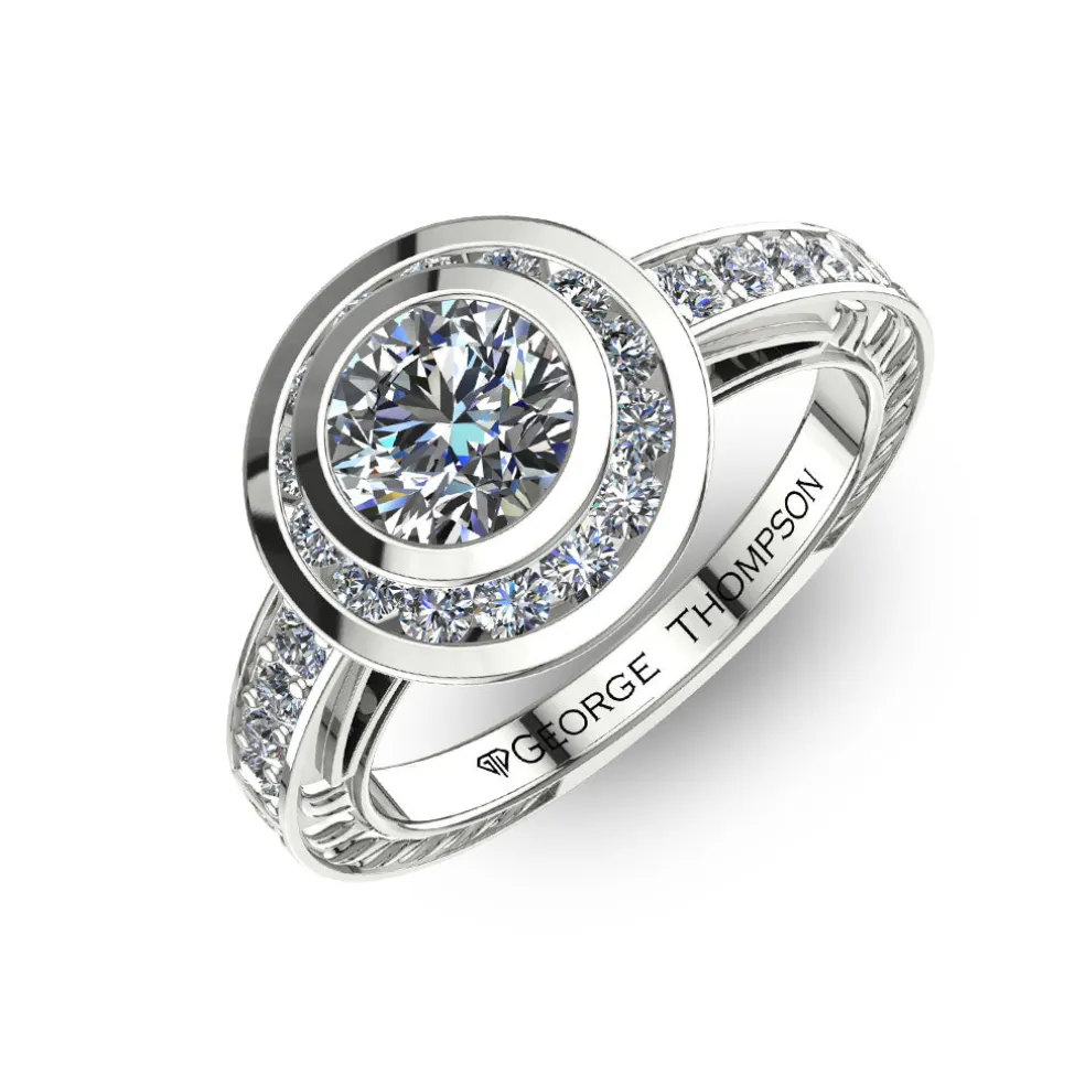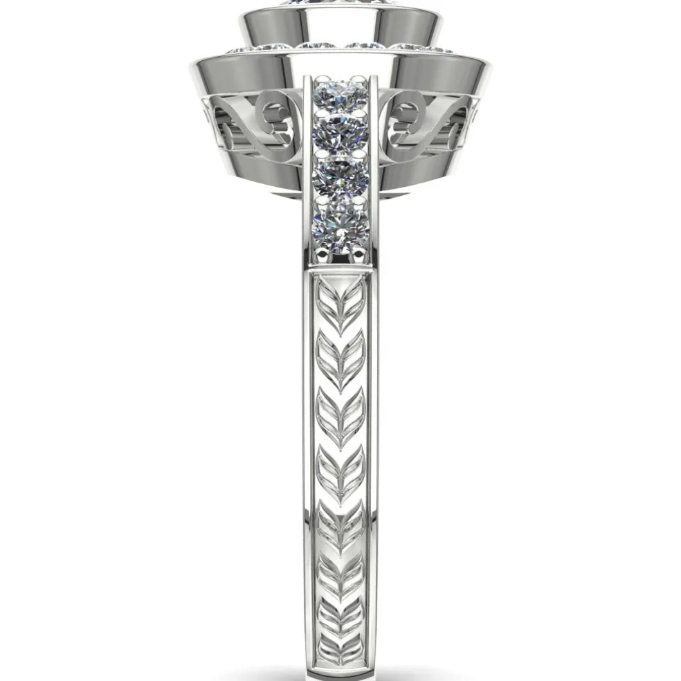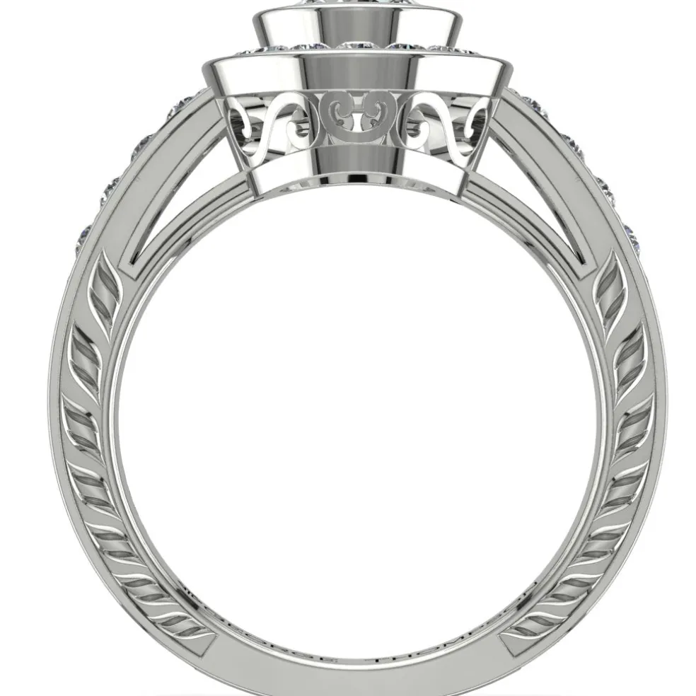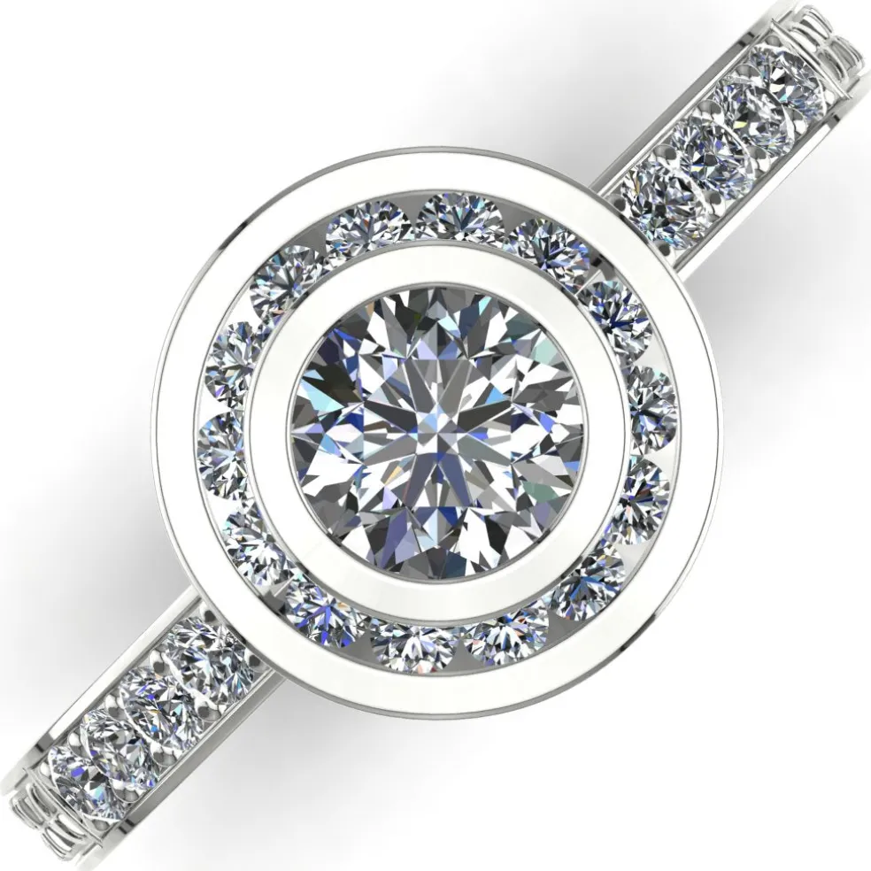 Behold the stunning Clemencia, an engagement ring that radiates exquisite beauty and luxury. This breathtaking ring features a brilliant round diamond at the center, weighing approximately 0.60ct. The center stone is surrounded by 22 round brilliant accent diamonds, adding an approximate total weight of 0.35cts. With a total diamond weight of approximately 0.95cts., the Clemencia is the perfect choice for the bride who wants to make a bold statement on her special day. Crafted in 14kt white gold, this ring weighs approximately 4.20 grams and is also available in Yellow Gold, Rose Gold, Palladium, and Platinum.