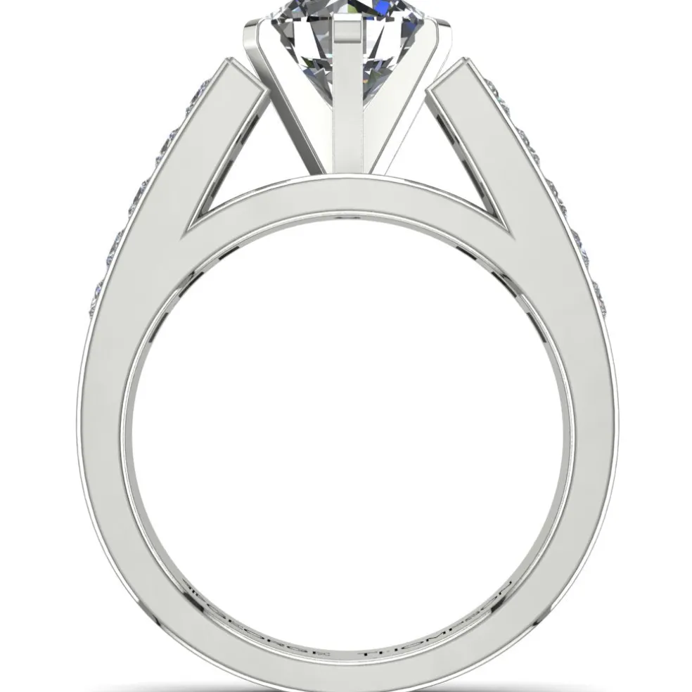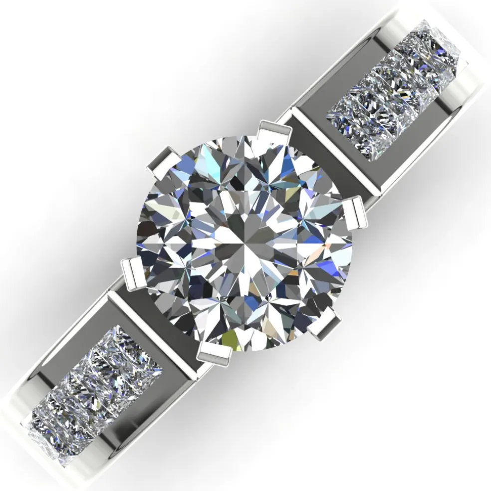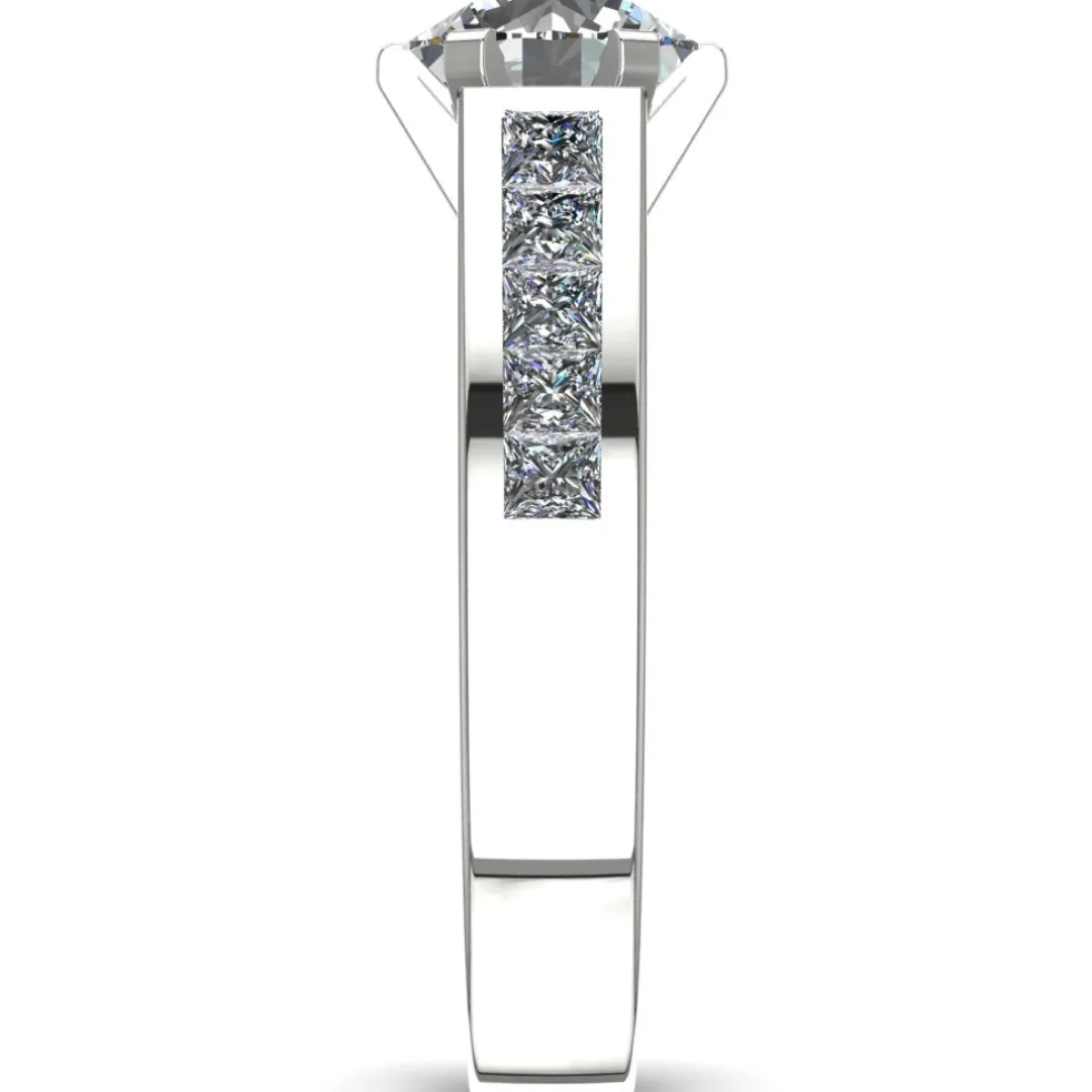 Say “I do” to the Damara, a charming and elegant engagement ring that will make your heart skip a beat! Featuring a stunning round brilliant diamond of approximately 1.50ct at the center, this ring is surrounded by 10 exquisite princess cut accent diamonds with an approximate total weight of 0.60cts. and a total diamond weight of approximately 2.10cts., creating a breathtaking display of brilliance and fire. Made of 14kt white gold, the Damara weighs approximately 5.15 grams, ensuring both comfort and durability for everyday wear. And, if white gold is not your preference, this ring is also available in yellow gold, rose gold, palladium, and platinum, so you can choose the perfect metal to match your style.