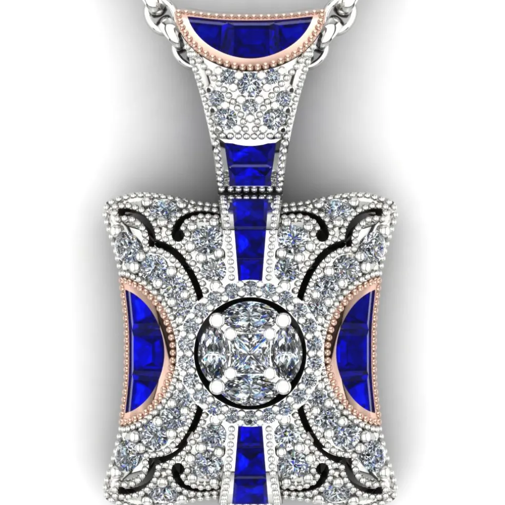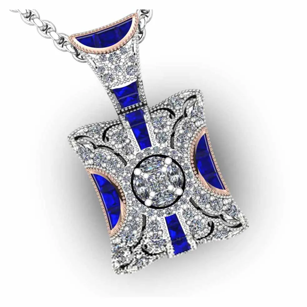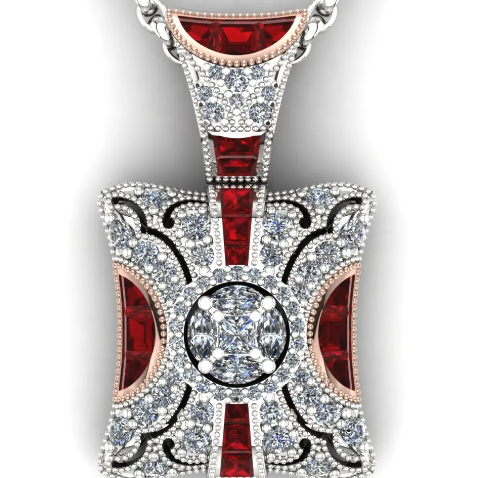 Behold the Dedra, a true work of art in white and rose gold with diamonds and rubies or sapphires. Featuring a unique marquise illusion head that houses a Princess Cut Diamond and 4 Marquise Cut Diamonds, this pendant is truly one of a kind. With 58 Round Brilliant Diamonds and 11 custom-cut baguette Rubies or Sapphires, this piece has an approximate total diamond weight of 0.70cts and an approximate total gemstone weight of 0.65cts.