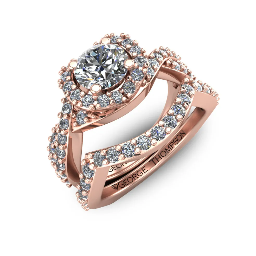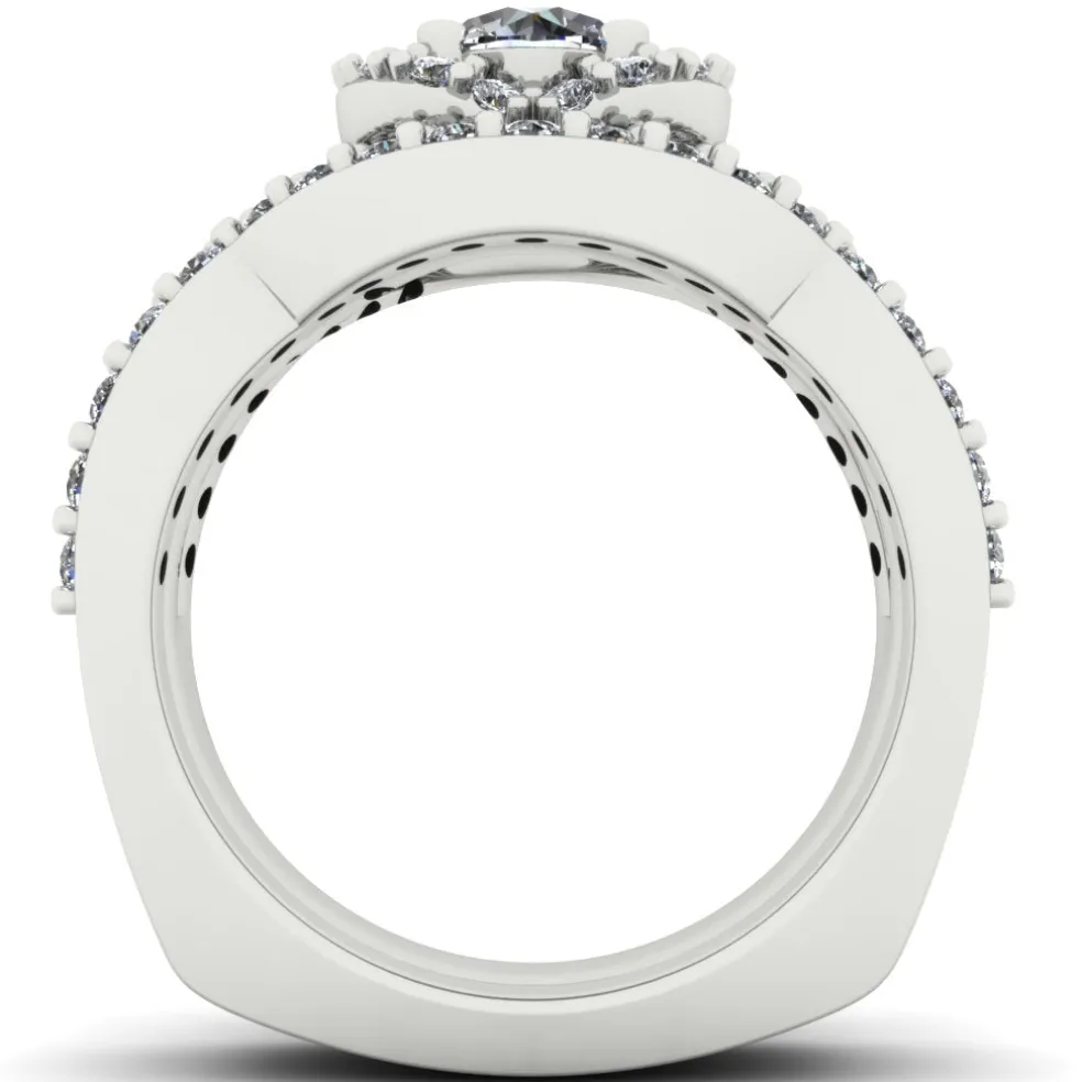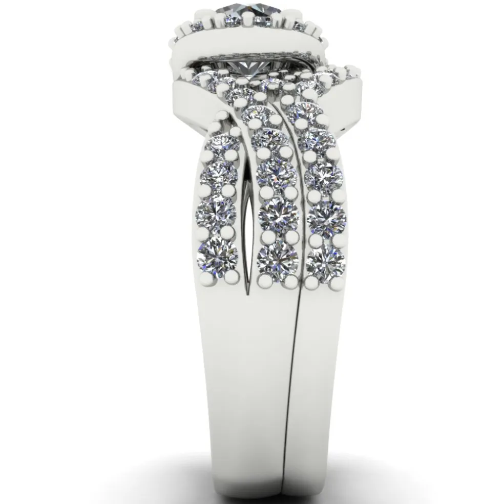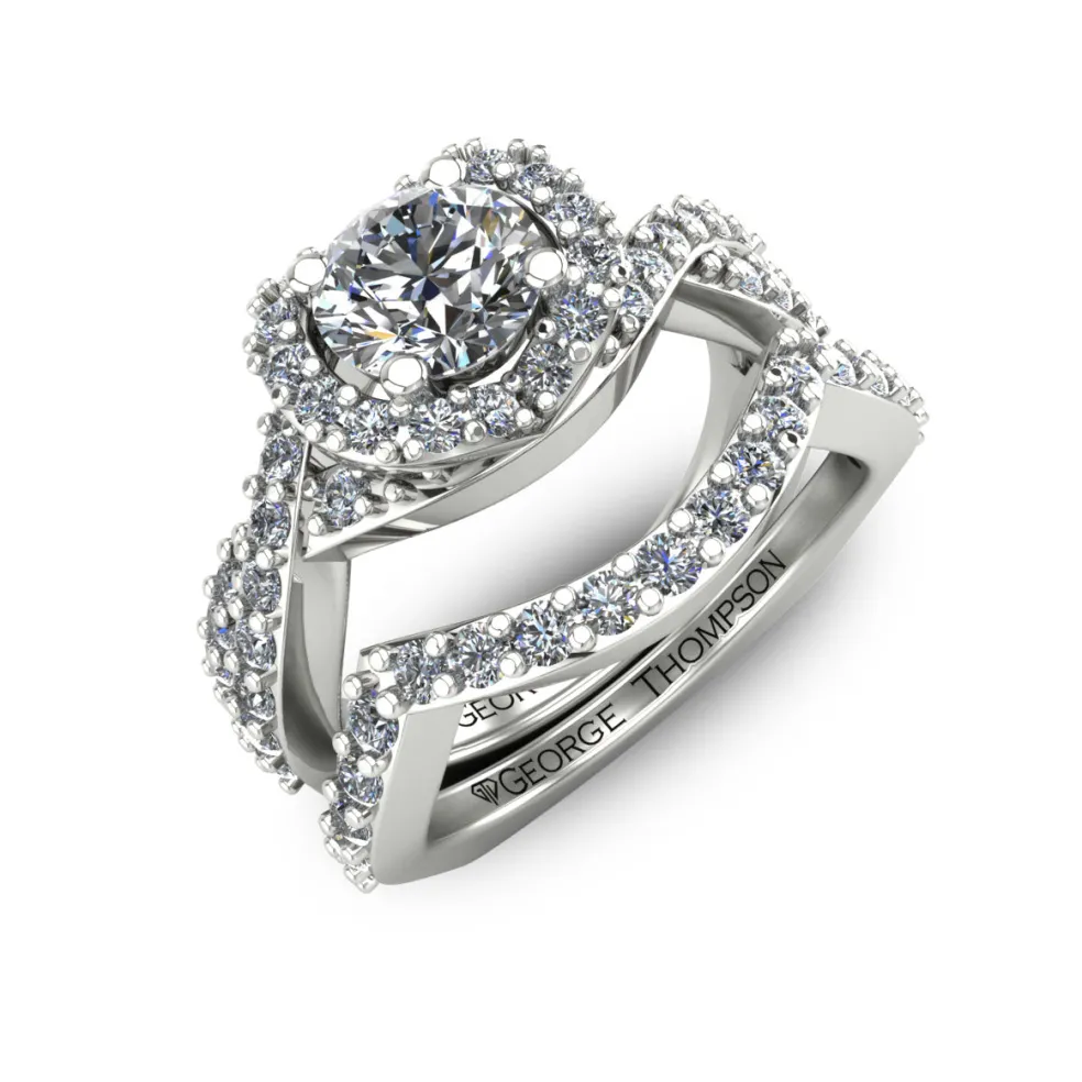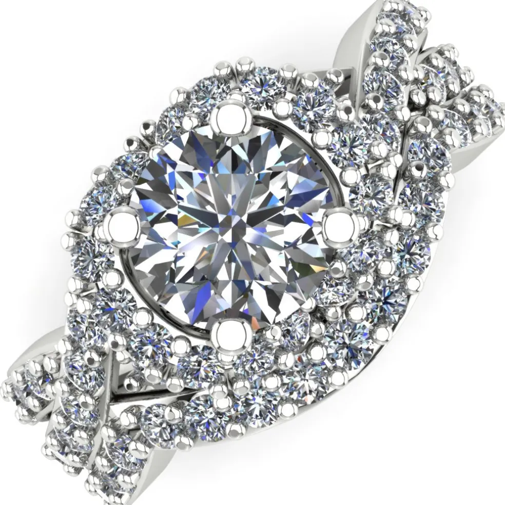Get ready to be mesmerize with the Deviara, a dazzling display of sophistication and elegance. With a center Round Brilliant Diamond of approximately 0.55 ct. and 61 Round Brilliant accent diamonds, the ring sparkles with an approximate total weight of 0.70 ct. The total diamond weight of the wedding set is approximately 1.25 cts., making it the perfect statement piece. The ring weighs approximately 8.5 grams in 14kt white gold, also available in Yellow Gold, Rose Gold, Palladium and Platinum.