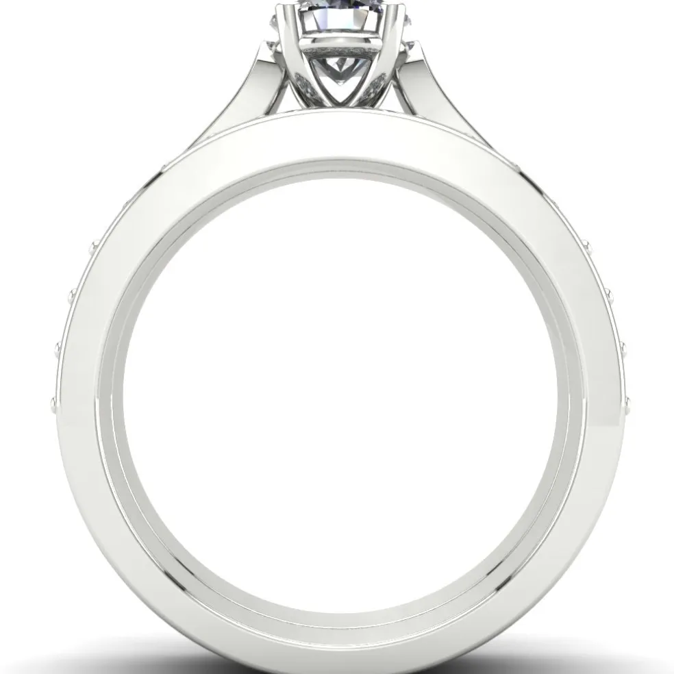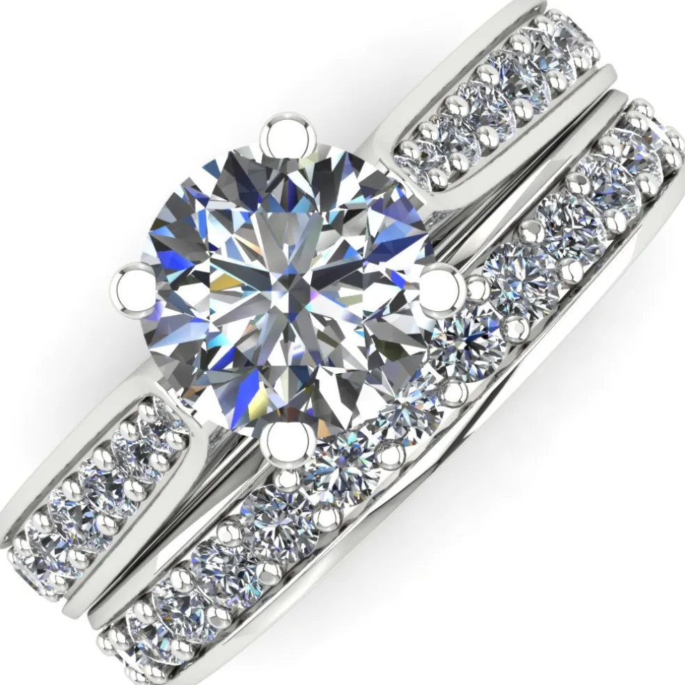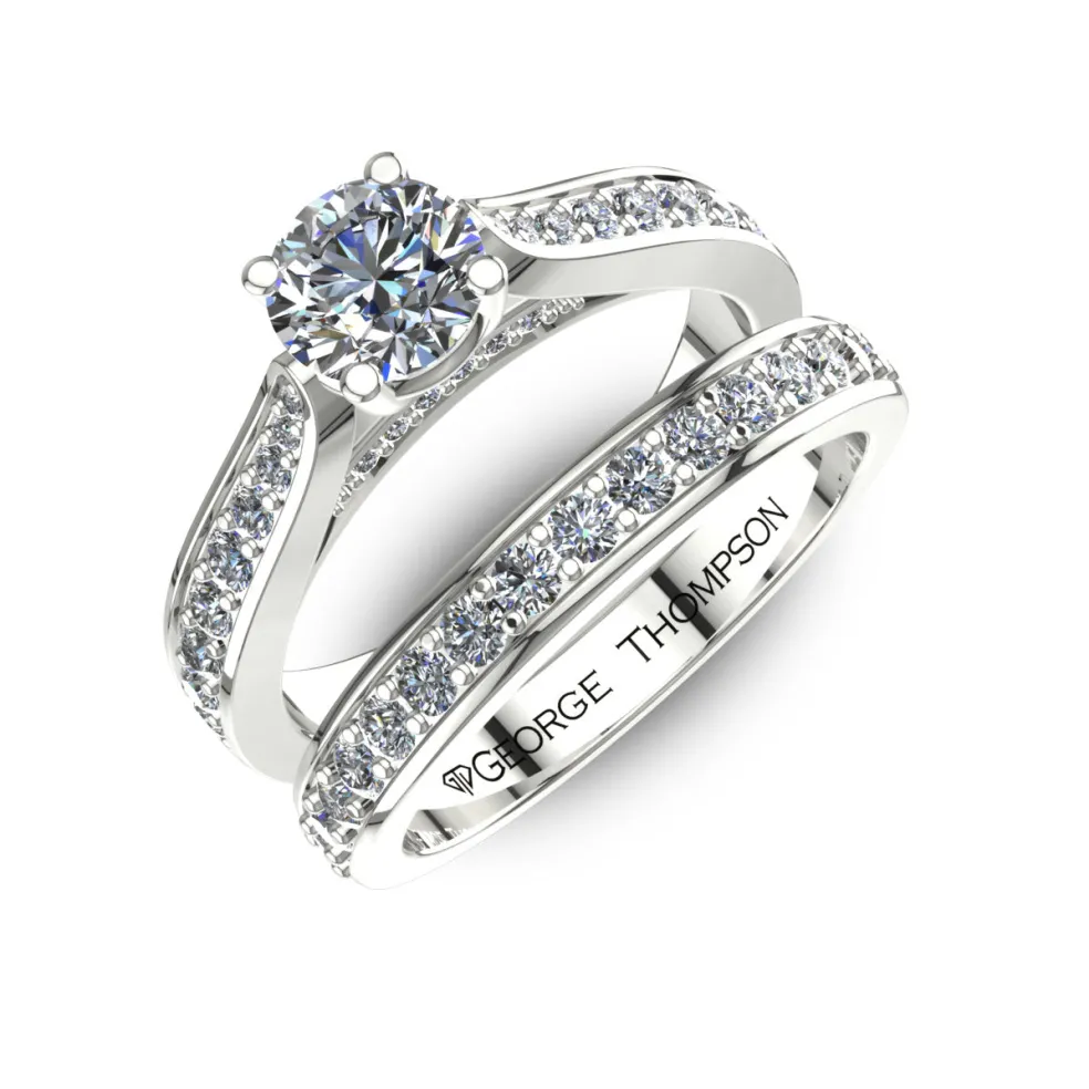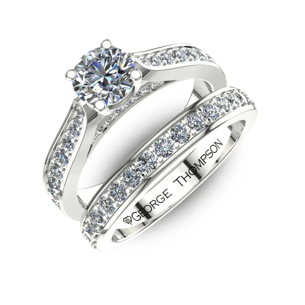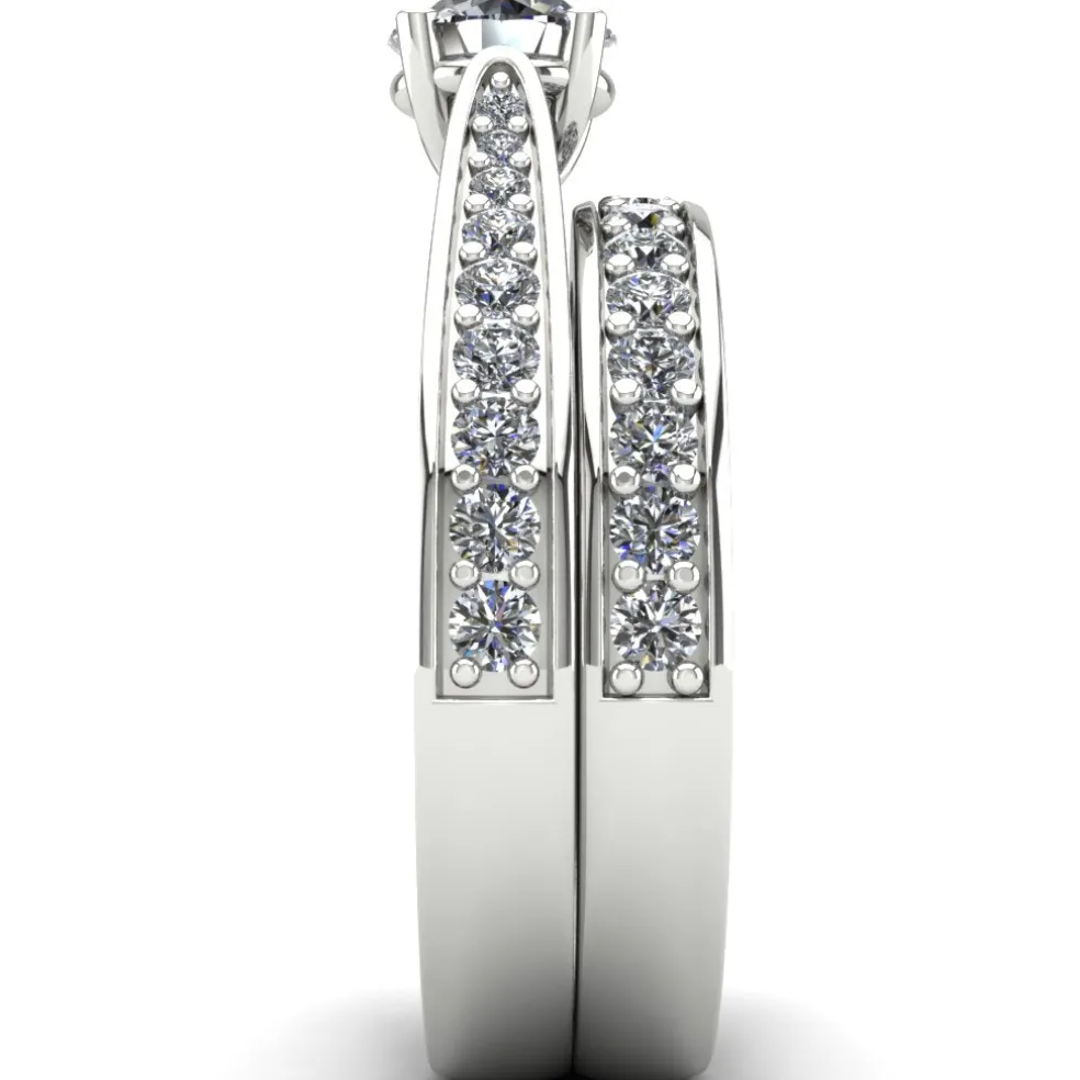 The Dotta, a White Gold and Diamond wedding set. A center Round Brillant Diamond of approximately 1/2ct., and 47 Round Brilliant accent diamonds with an approximate total weight of 0.75cts. This Wedding set has a total diamond weight of approximately 1.25cts. and weighs approximately 6.1 grams in 14kt white gold, also available in Yellow Gold, Rose Gold, Palladium and Platinum; and can be made to fit any size or shape center diamond.