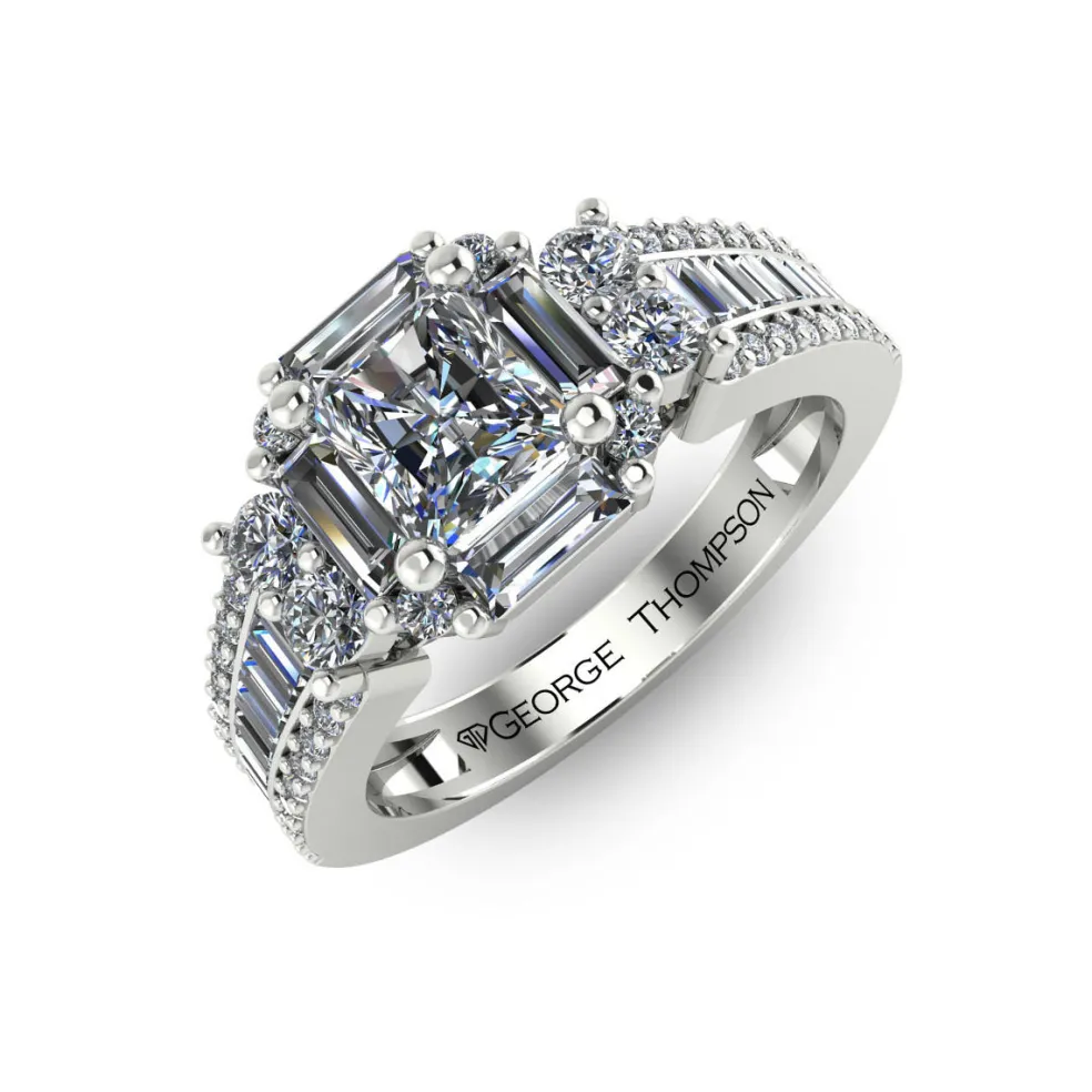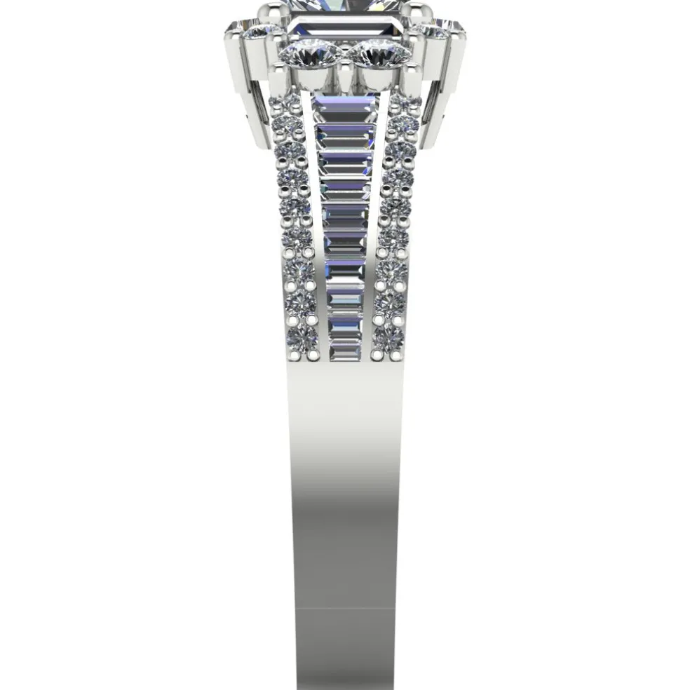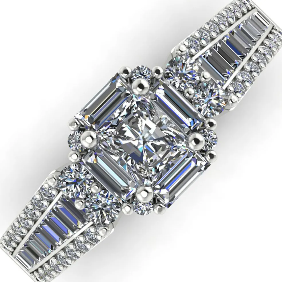 The Finella, a beautifully unique diamond engagement ring that is sure to capture your heart. This exquisite piece is crafted from gleaming white gold and features a center princess cut diamond, weighing approximately 0.45ct, that is surrounded by 24 baguette cut accent diamonds and 44 round brilliant accent diamonds, with an approximate total weight of 1.05cts. The combination of these diamond cuts creates a mesmerizing and one-of-a-kind look that is both elegant and sophisticated. With a total diamond weight of approximately 1.50cts, The Finella is a true masterpiece that is perfect for those who want a ring that is both classic and contemporary.