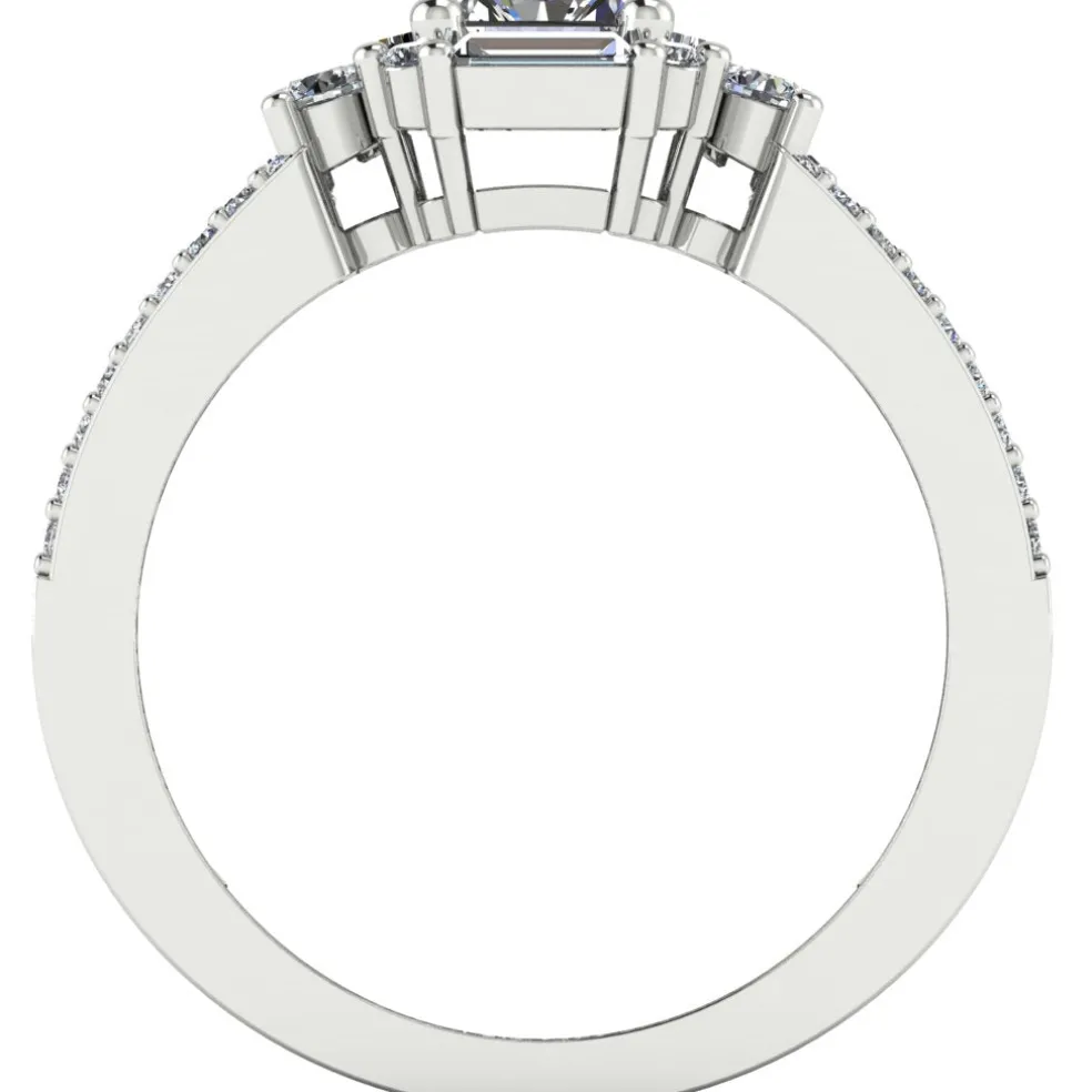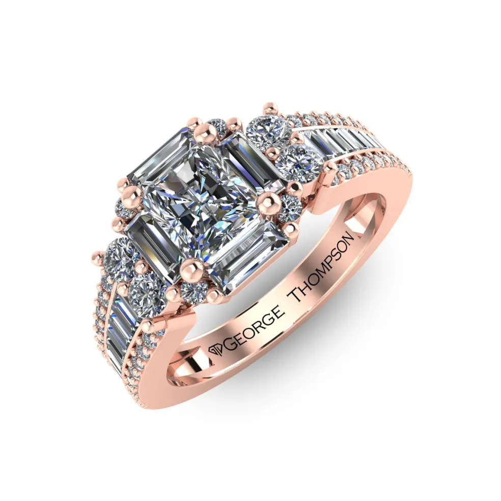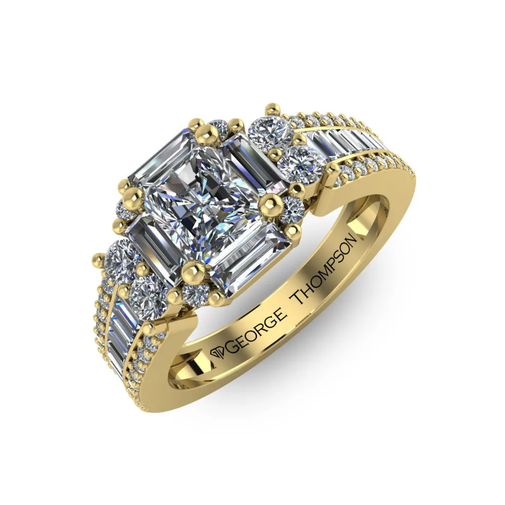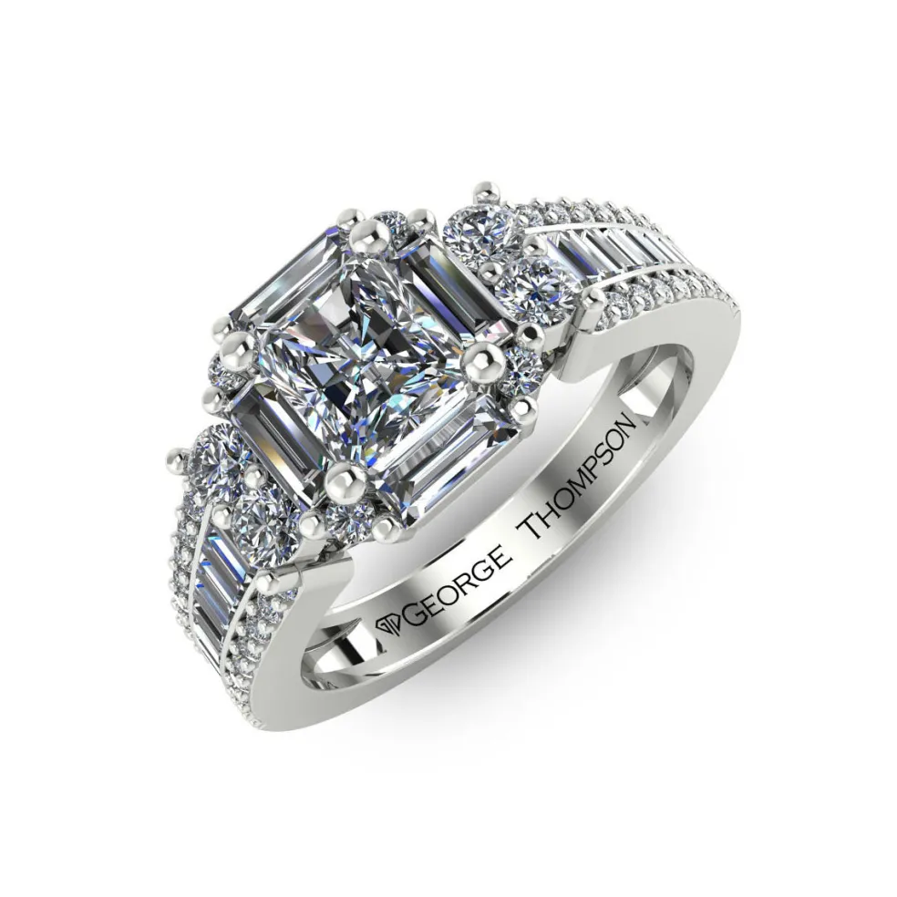 The Finella, a beautifully unique diamond engagement ring that is sure to capture your heart. This exquisite piece is crafted from gleaming white gold and features a center princess cut diamond, weighing approximately 0.45ct, that is surrounded by 24 baguette cut accent diamonds and 44 round brilliant accent diamonds, with an approximate total weight of 1.05cts. The combination of these diamond cuts creates a mesmerizing and one-of-a-kind look that is both elegant and sophisticated. With a total diamond weight of approximately 1.50cts, The Finella is a true masterpiece that is perfect for those who want a ring that is both classic and contemporary.
