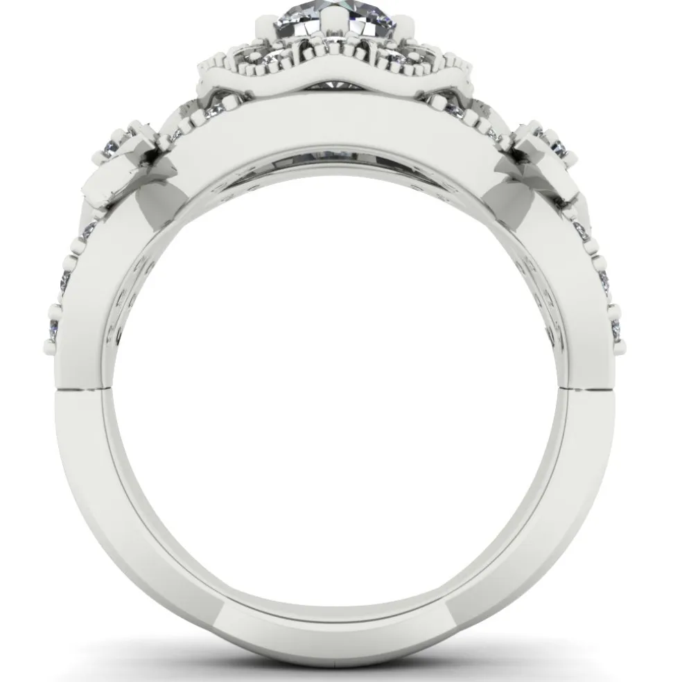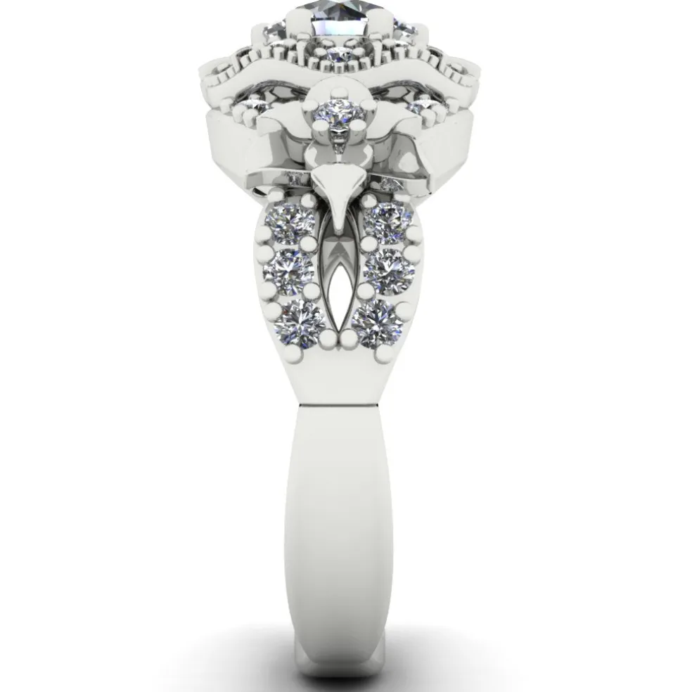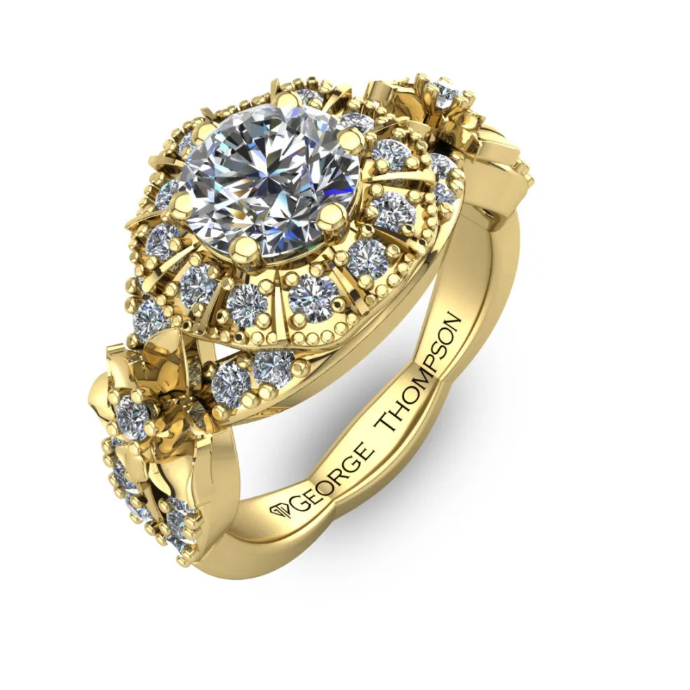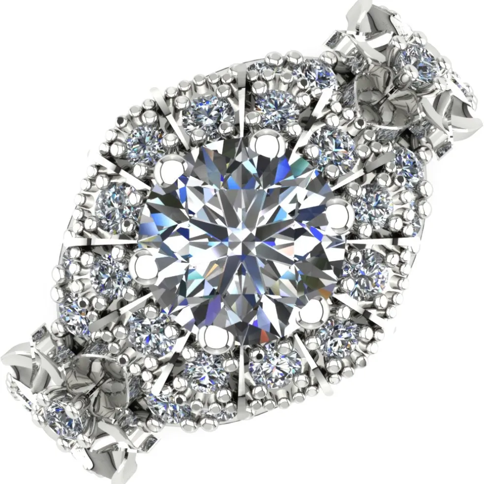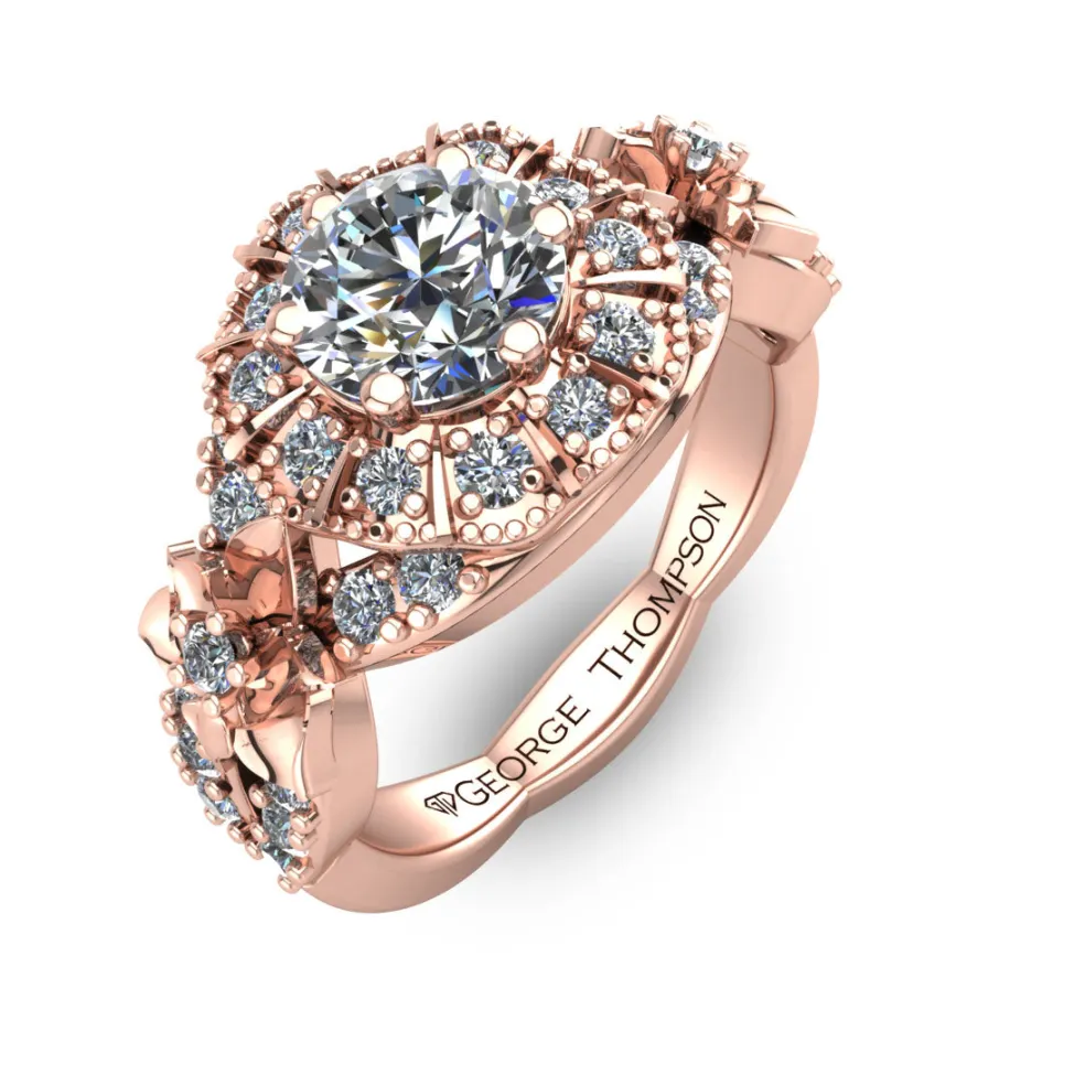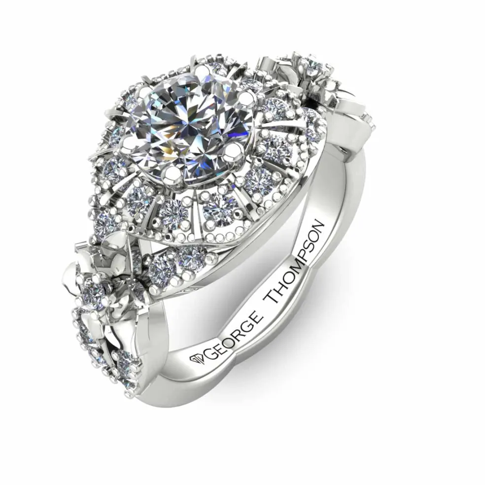 Fall in love with the Flora, a stunning engagement ring that exudes femininity and style. This gorgeous piece features a center round brilliant diamond, approximately 2/3ct in weight, that radiates with beauty and grace. The Flora is further enhanced with 34 round brilliant accent diamonds, with an approximate total weight of 0.40cts, that dance and shimmer with every movement.