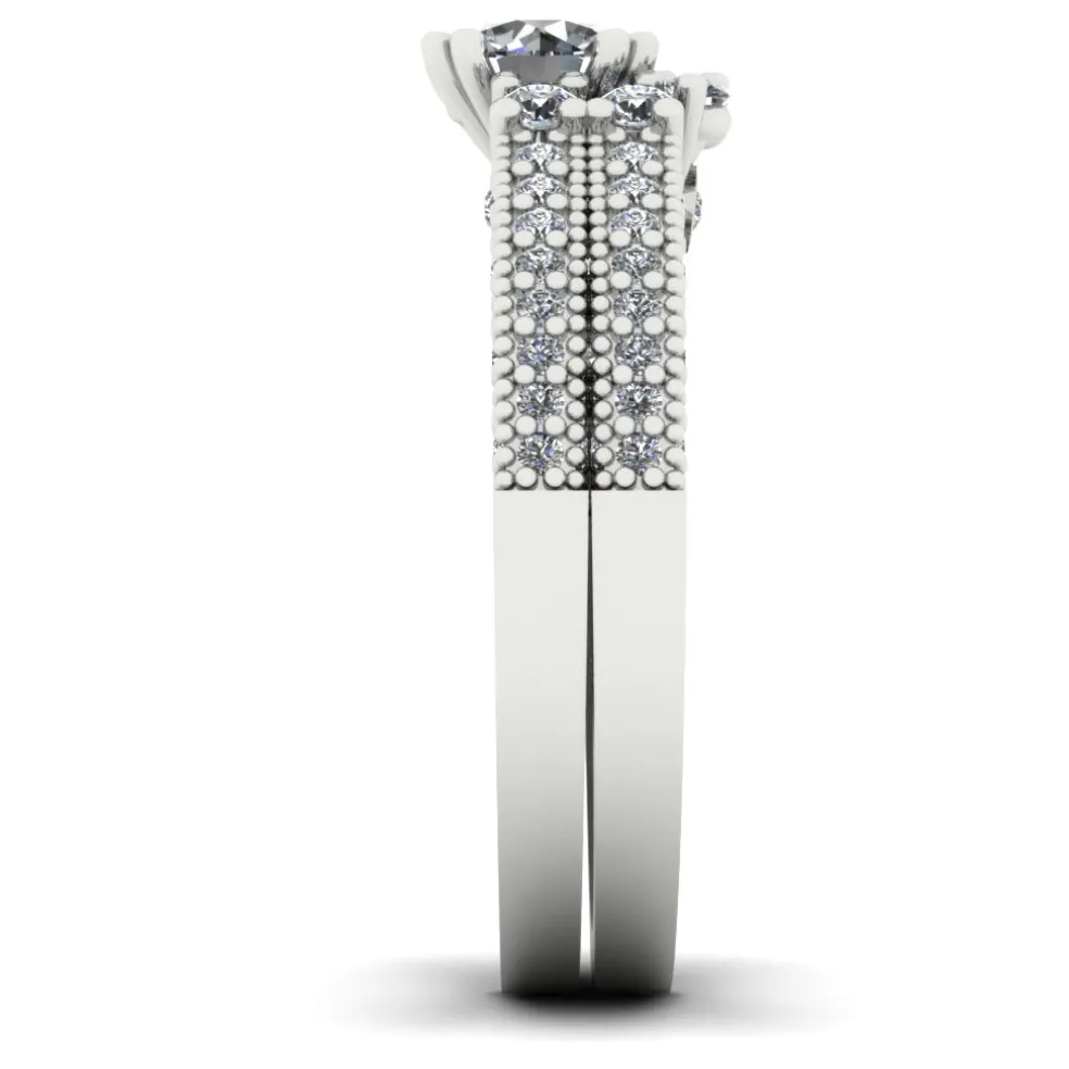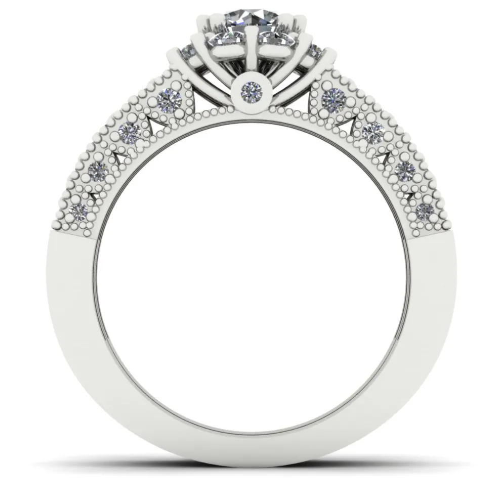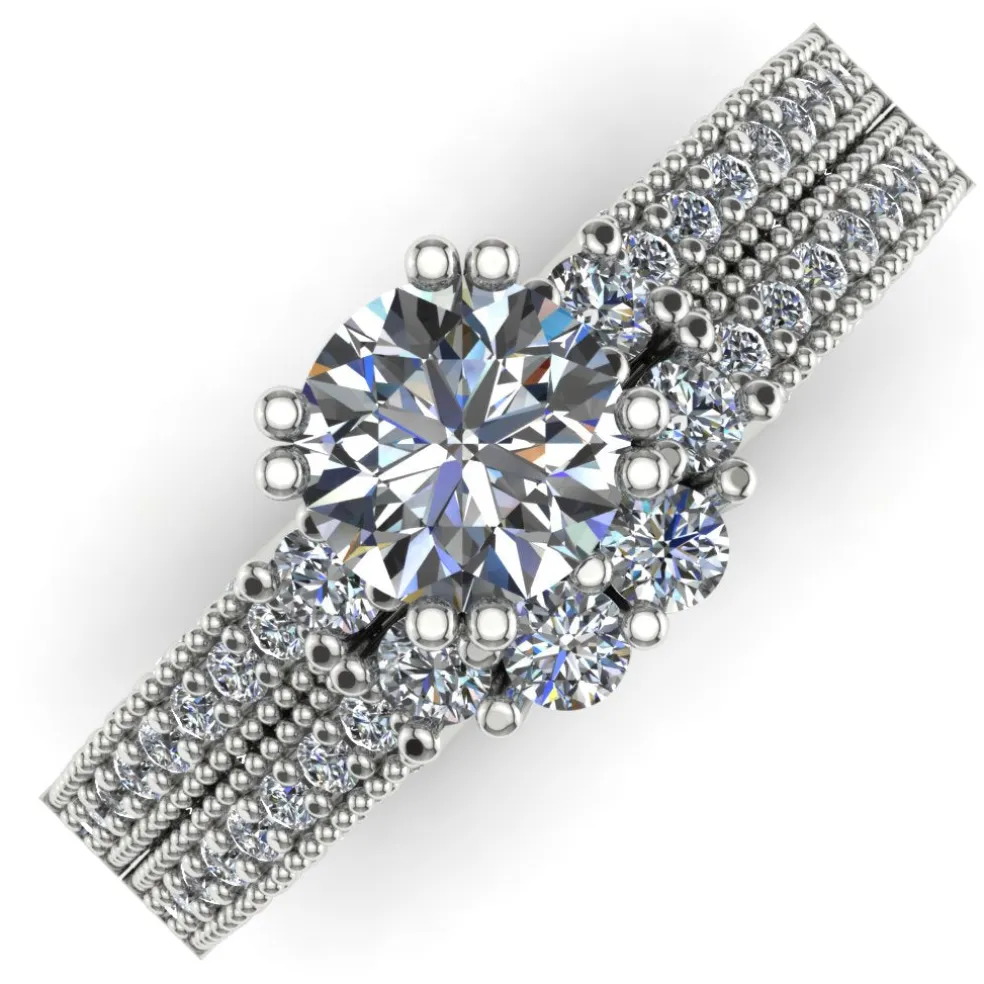A masterpiece with a perfect balance of simplicity and elegance, the Fretta. The center round brilliant diamond of approximately 2/3ct is surrounded by 74 round brilliant accent diamonds of approximately 0.60cts, creating a mesmerizing sparkle that will take your breath away. The ring is crafted in white gold, giving it a modern and trendy look that is sure to turn heads. With a total diamond weight of 1.25cts, the Fretta is the perfect symbol of your everlasting love and commitment.