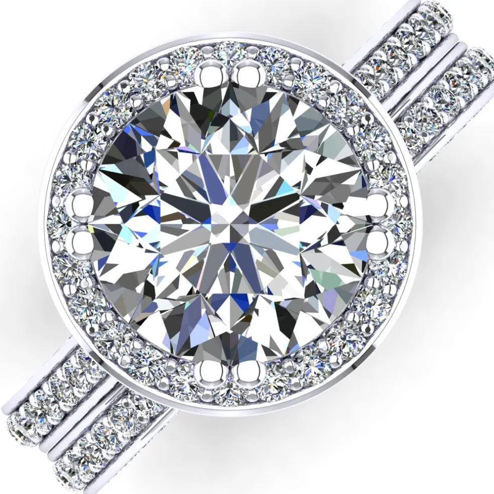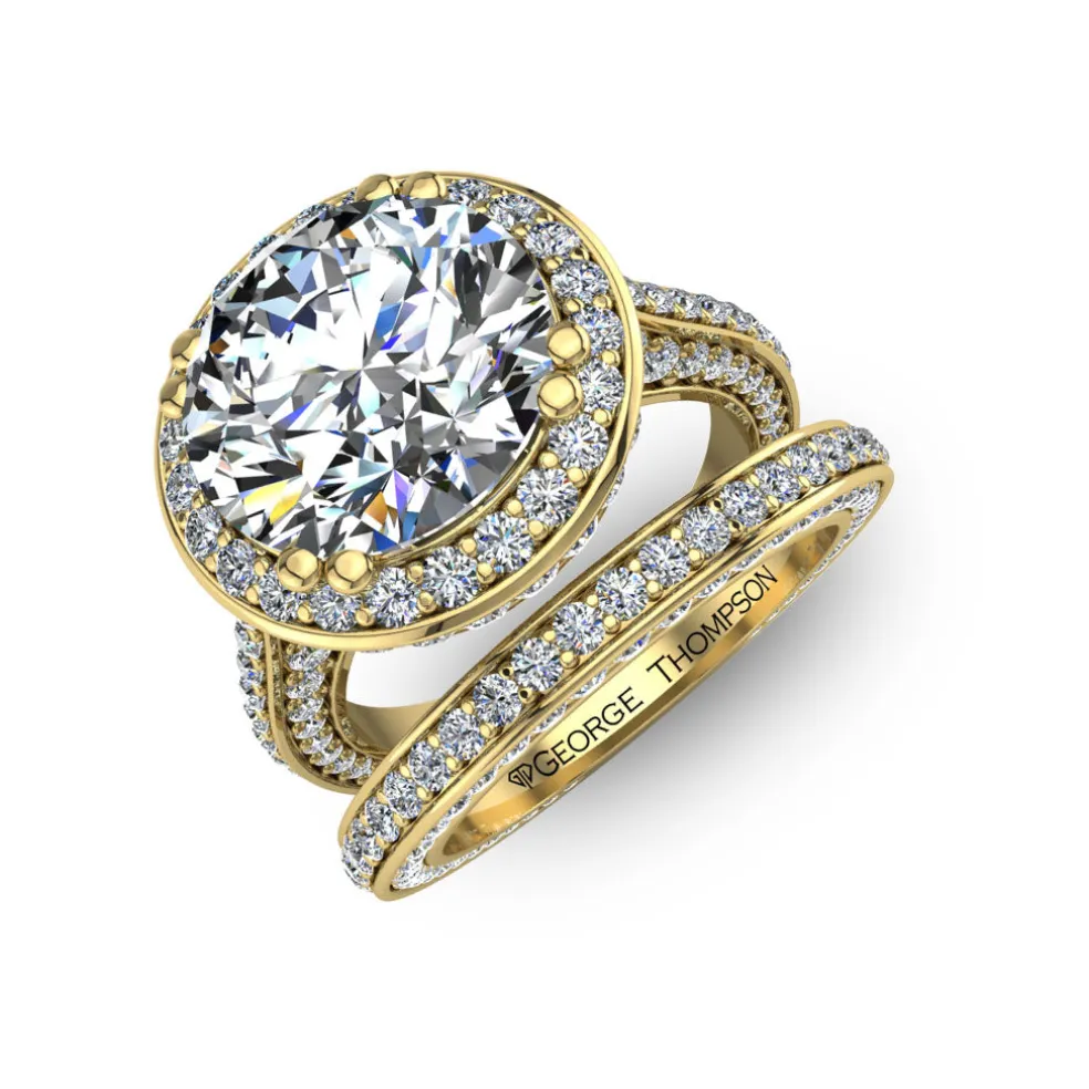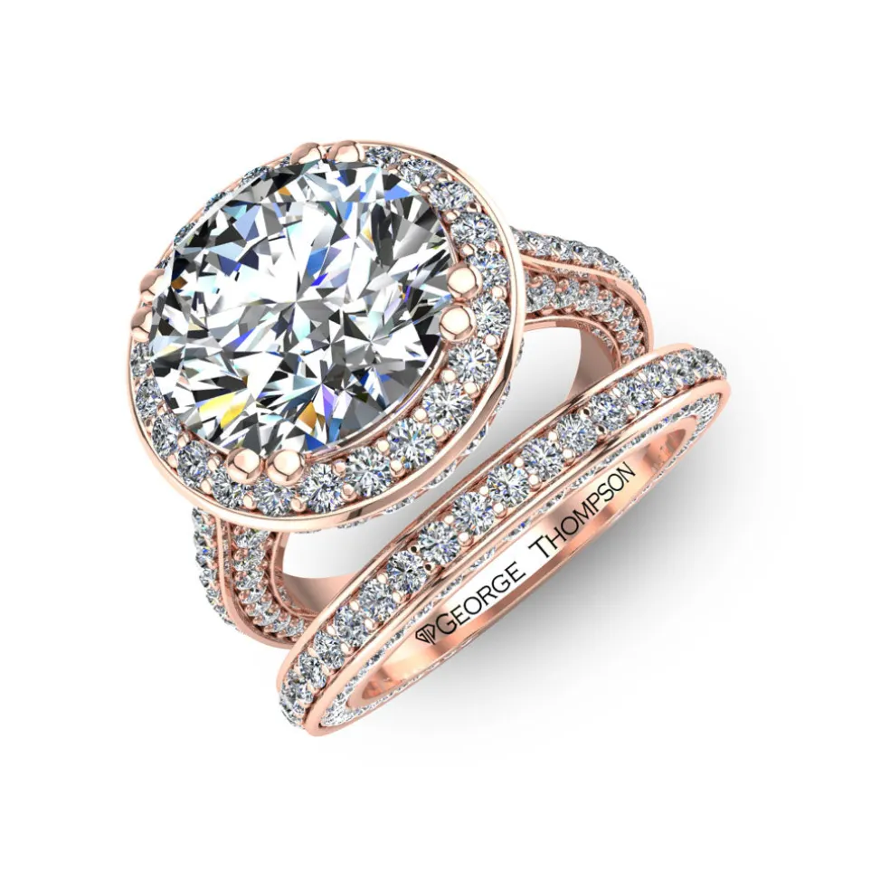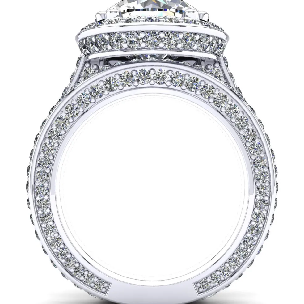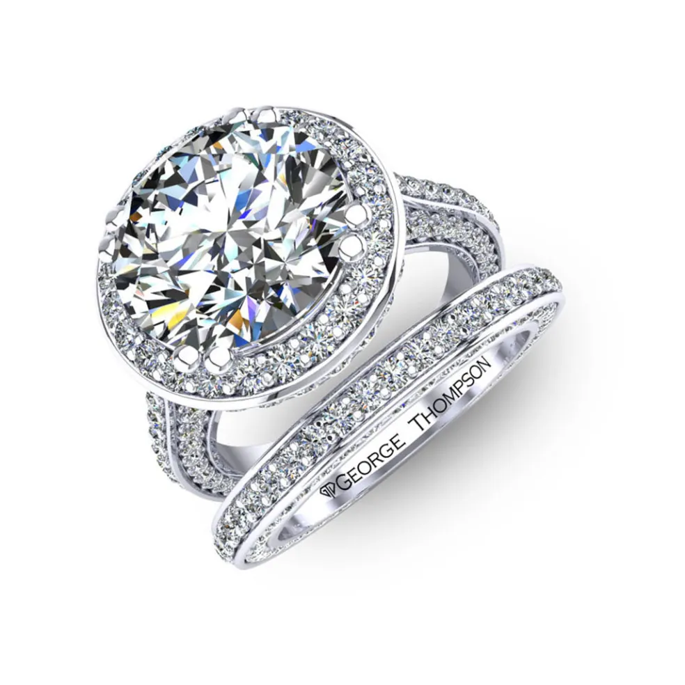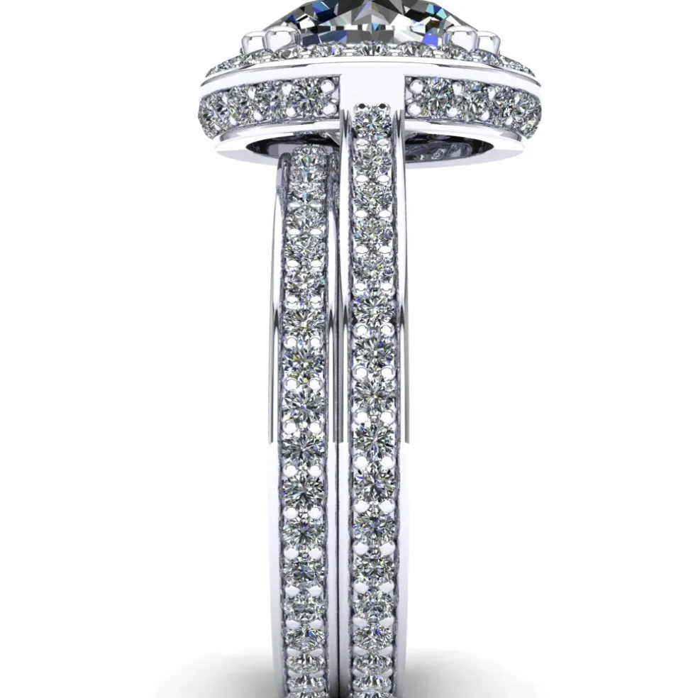 The Isola is a truly opulent diamond wedding set that will make any bride feel like royalty on her special day. The centerpiece of this set is a stunning Round Brilliant Diamond that boasts a sizeable 3.00 carats, making it a true showstopper. The center stone is accented by 299 Round Brilliant Diamonds with an approximate total weight of 1.95 carats, which beautifully enhance the center stone’s brilliance and fire. The Wedding Set has a total diamond weight of approximately 4.95 carats, which makes it a statement piece that will surely turn heads.
