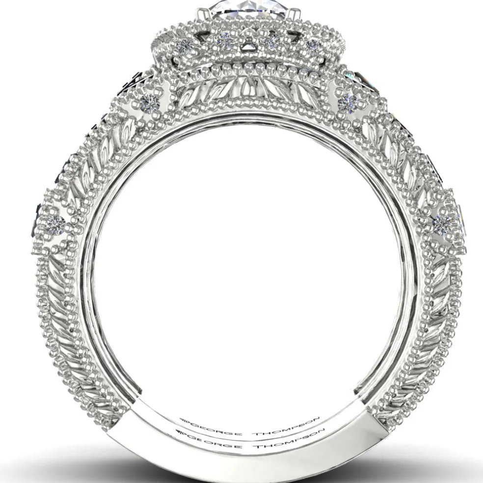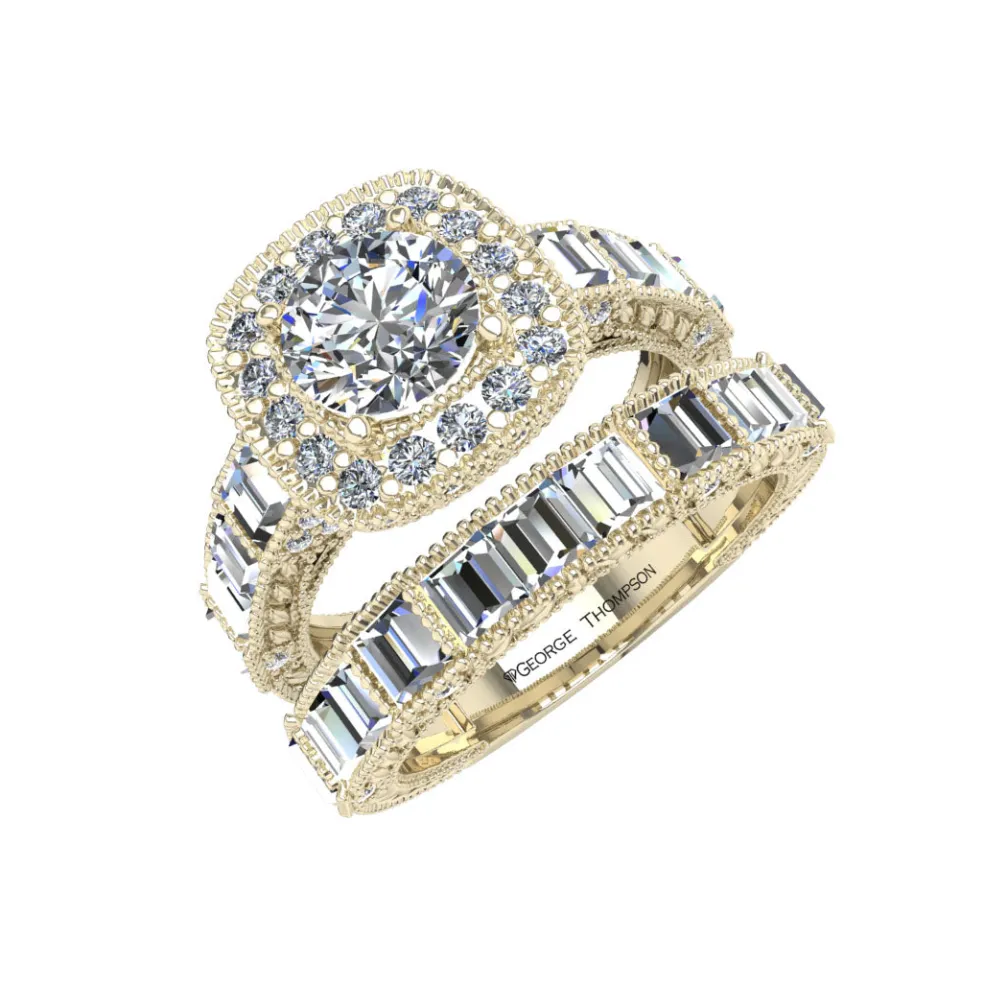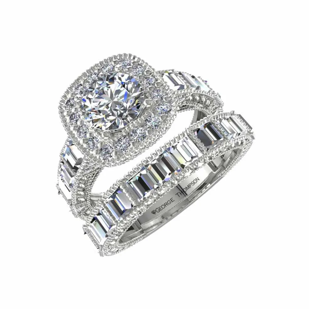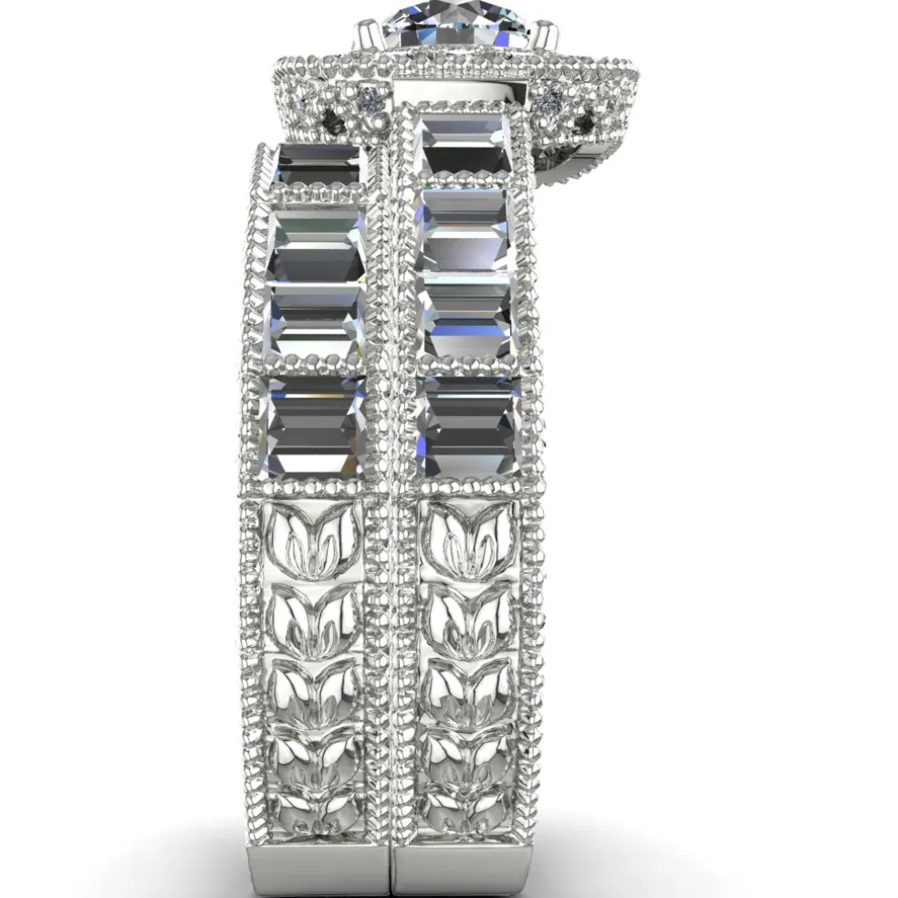 Say “yes” to the Laisha, a true masterpiece that is sure to leave you breathless. The ring features a center Round Brilliant Diamond of approximately 0.70ct., expertly set in a white gold band that radiates elegance and sophistication. The band is further accentuated with 19 Baguette cut diamonds and 52 Round Brilliant accent diamonds with an approximate total weight of 2.05cts, creating a stunning and unique look that is both exceptional and exquisite. With a total diamond weight of approximately 2.75cts, the Laisha is the perfect symbol of your everlasting love and commitment. Weighing approximately 8.30 grams in 14kt white gold, this enchanting piece is also available in Yellow Gold, Rose Gold, Palladium, and Platinum, giving you the freedom to choose the perfect metal to match your style.