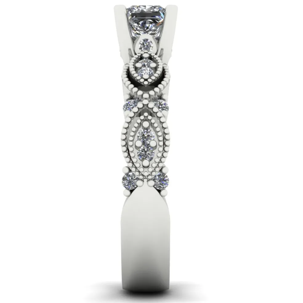 Be enticed to the beauty of the Mira, a diamond engagement ring that’s twisted, intricate, and oh-so-sassy. Crafted with 14kt white gold, this stunning ring is a true masterpiece. Featuring a center princess cut diamond of approximately 2/3ct and 24 round brilliant diamonds with an approximate total weight of 0.25cts, the Mira is a show-stopping piece that will turn heads wherever you go. With a total diamond weight of 0.85cts and a weight of 6.23g, this ring is both substantial and comfortable to wear.
