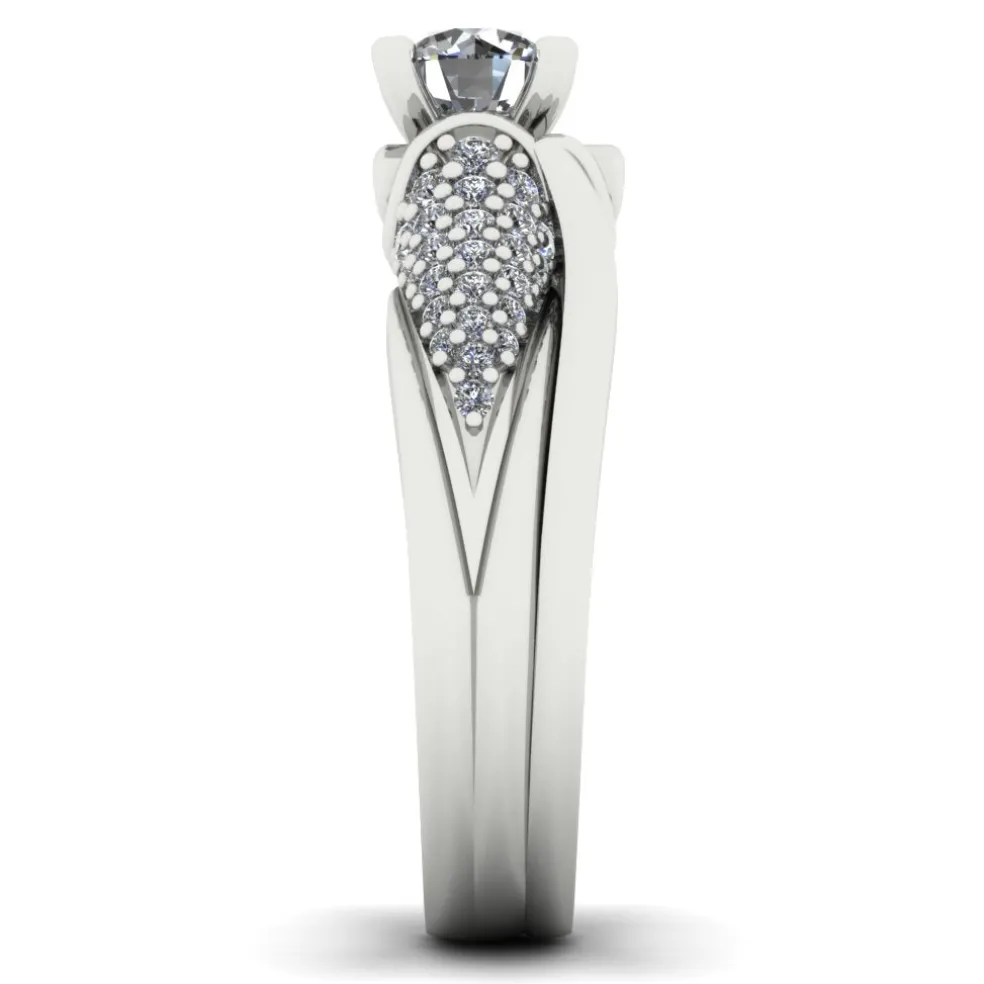Behold the magnificent Montona, a stunning symbol of eternal love and commitment! Crafted from 14kt white gold, this exquisite wedding set boasts a dazzling center round brilliant diamond of approximately 1/2ct, accentuated with 52 round brilliant accent diamonds of approximately 0.20cts that add a touch of sparkle and glamour to its already opulent design. With a total diamond weight of 0.70cts, this ring is sure to leave a lasting impression on anyone who beholds its beauty. Weighing in at a delicate 5.2g, the Montona is a perfect blend of luxury and comfort, making it the ultimate choice for modern brides who seek both style and practicality.
