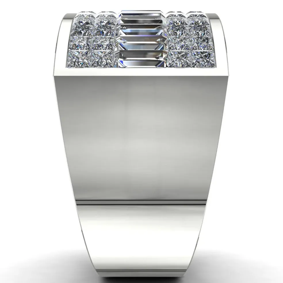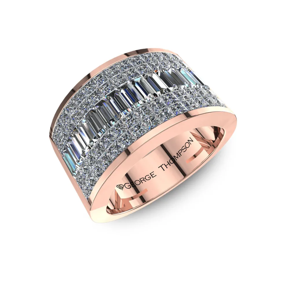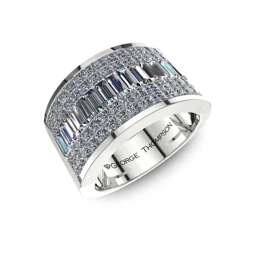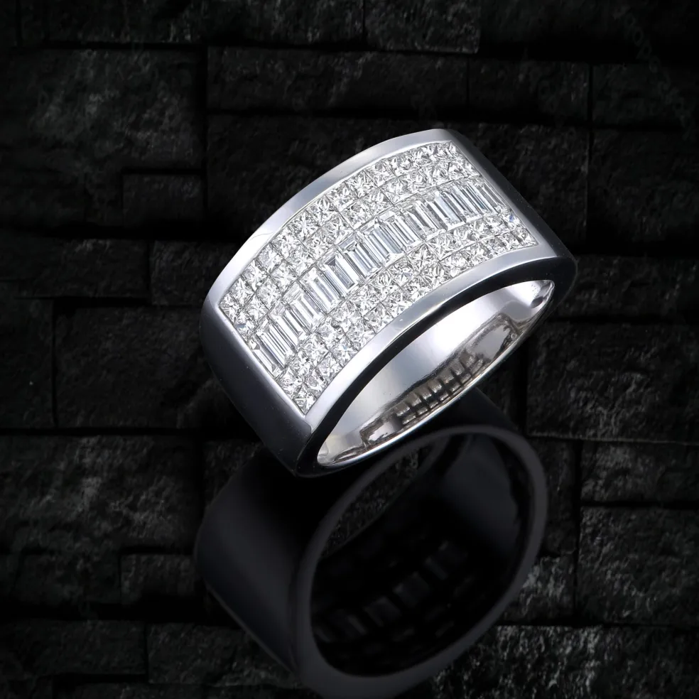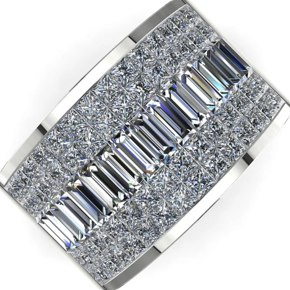 Crafted from 14kt white gold, this chunky band features 56 stunning Princess Cut accent diamonds and 7 Baguette cut accent diamonds with an approximate total weight of 2.10cts. With a total diamond weight of approximately 2.10cts, the Muretta band is an exceptional example of the luxurious beauty that can be achieved through bold design. The expertly placed diamonds create a stunning display of light and shine, making this band a true statement piece.