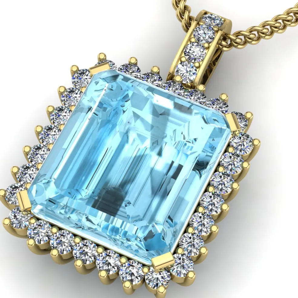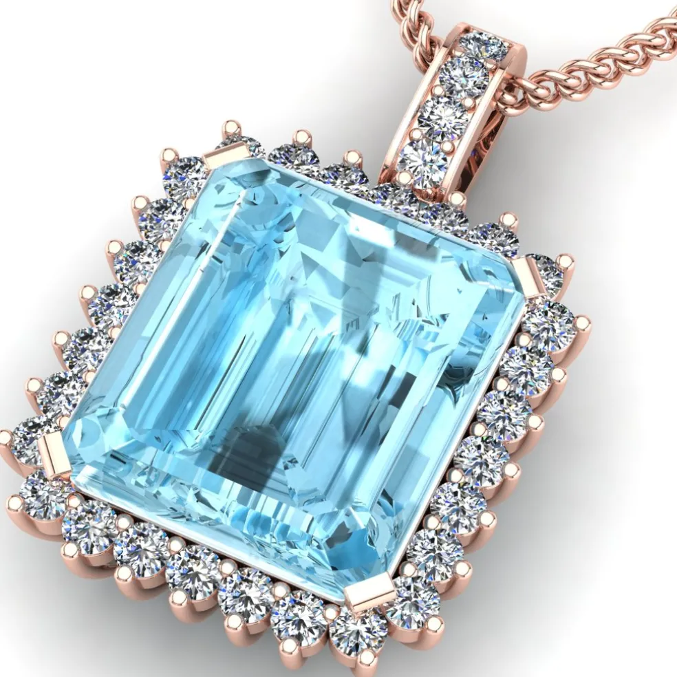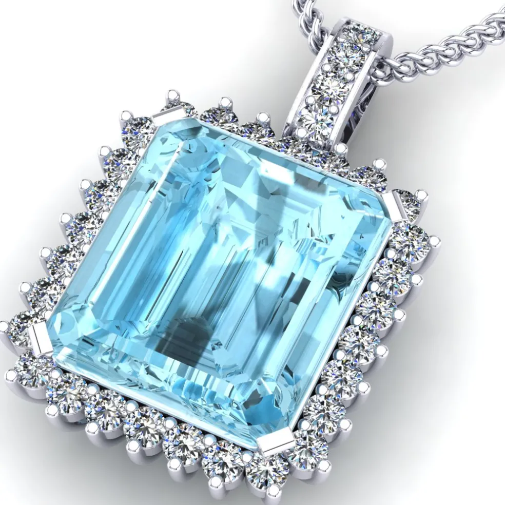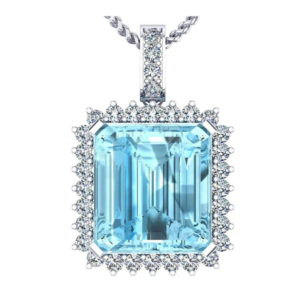 Elevate your look with the stunning Perfetta, featuring a captivating center Aquamarine Stone that weighs approximately 18.20ct. The gemstone is surrounded by 32 shimmering Round Brilliant Diamonds with a total weight of approximately 1.45cts, adding a touch of glamour to this already beautiful piece. The pendant weighs approximately 6.85 grams in 14kt White Gold, providing a perfect balance of weight and comfort.