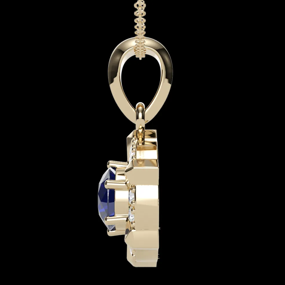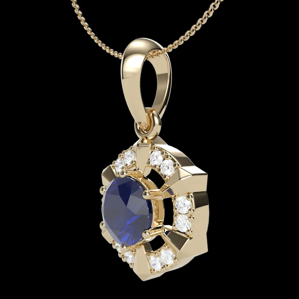 At the center of this enchanting piece, a round sapphire steals the show—a gemstone that echoes the depth of your emotions and the uniqueness of your love story, totaling 0.30 carats. Framing this precious centerpiece, 12 round diamonds on the sides, totaling 0.45 carats, add a sprinkle of celestial brilliance, creating a captivating dance of light.