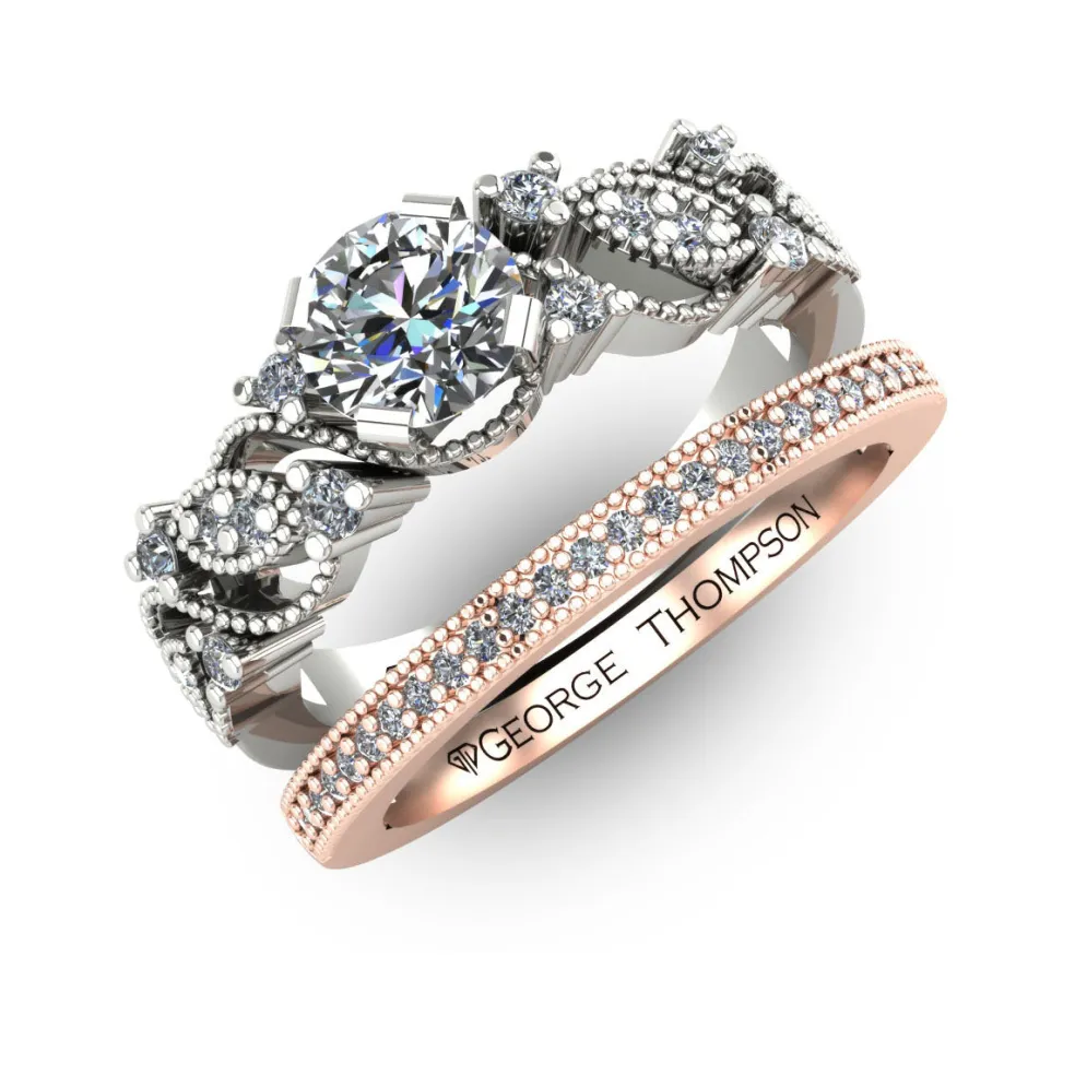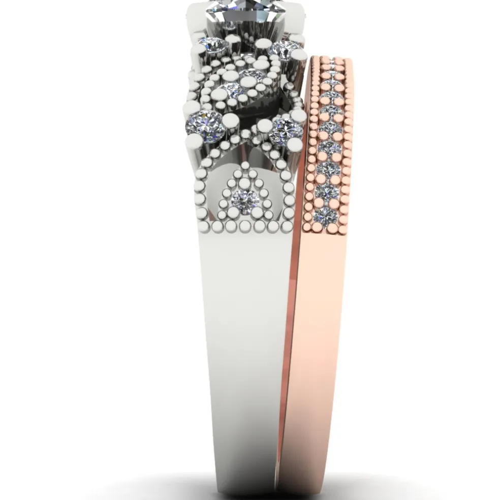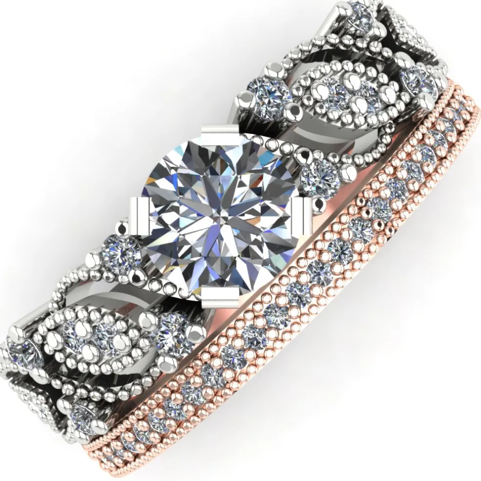 The Rosalbera White Gold, Rose Gold, and Diamond Wedding Set. A Center Round Brilliant Diamond of Approximately 2/3ct and 39 Round Brilliant Accent diamonds of approximately 0.15cts. The Wedding Set has a total diamond weight of approximately 0.90ct.