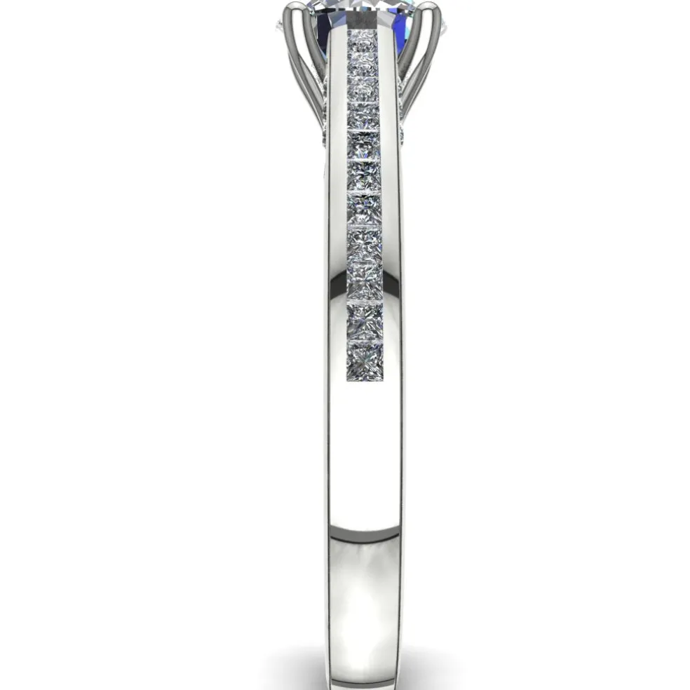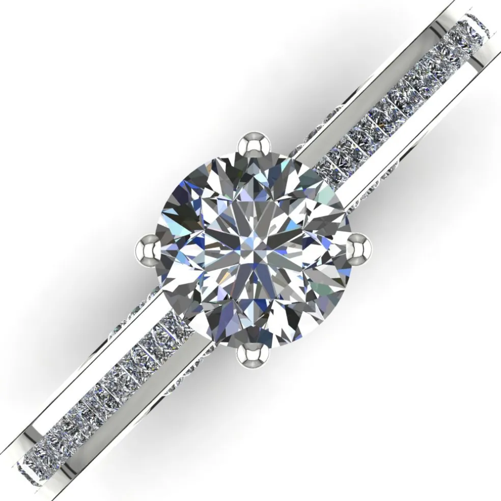 Behold the stunning Septima, a timeless classic with a modern twist! This stunning engagement ring features a breathtaking round brilliant diamond of approximately 0.85ct at the center, surrounded by 12 sparkling round diamonds and 22 exquisite princess cut diamonds with an approximate total weight of 0.40cts and a total diamond weight of approximately 1.25cts. The result is a stunning display of brilliance and fire that is sure to captivate everyone’s attention. Made of 14kt white gold, the Septima weighs approximately 3.75 grams, ensuring both comfort and durability for everyday wear. And, if white gold is not your preference, this ring is also available in yellow gold, rose gold, palladium, and platinum, so you can choose the perfect metal to match your style.