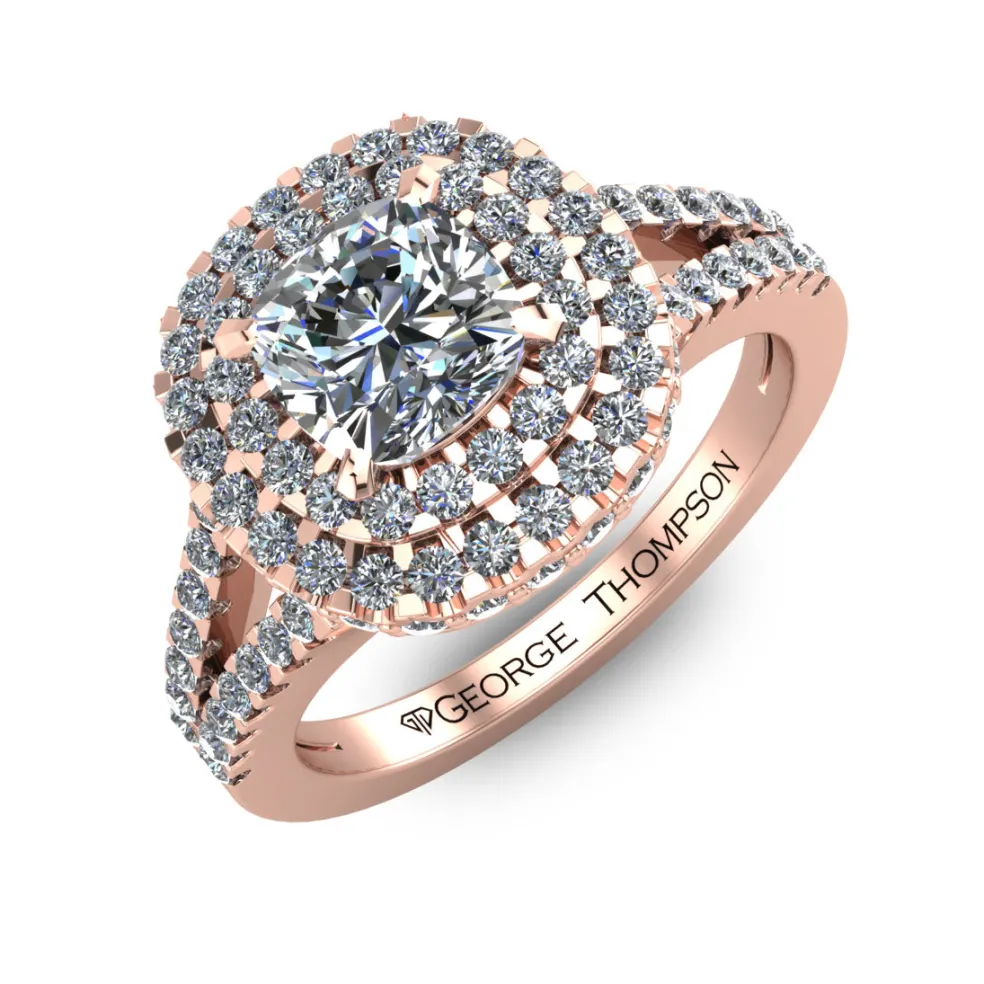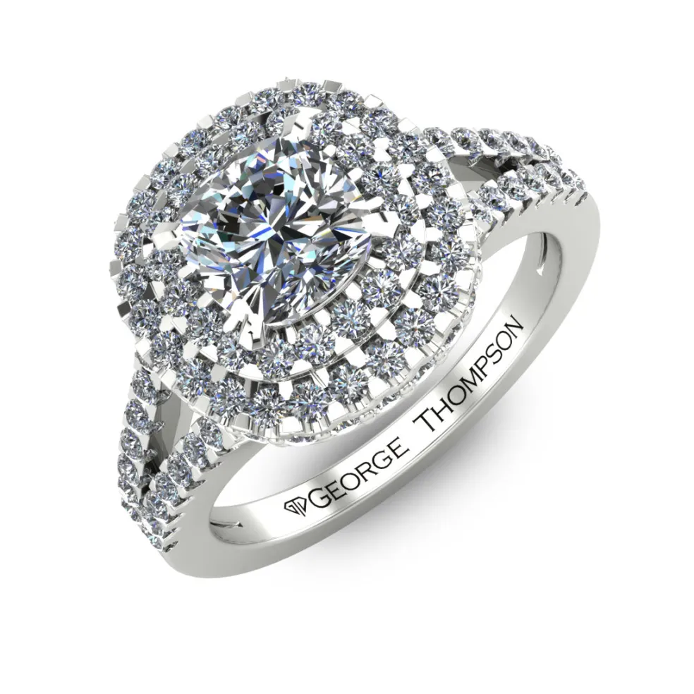 The Sultiana, a dazzling White Gold Diamond Engagement ring that exudes elegance and sophistication. This enchanting piece features a mesmerizing center Cushion Cut Diamond of approximately 0.90ct., perfectly complemented by 93 Round Brilliant accent diamonds with an approximate total weight of 0.60ct. This stunning ring has a total diamond weight of 1.50cts., making it a true showstopper.