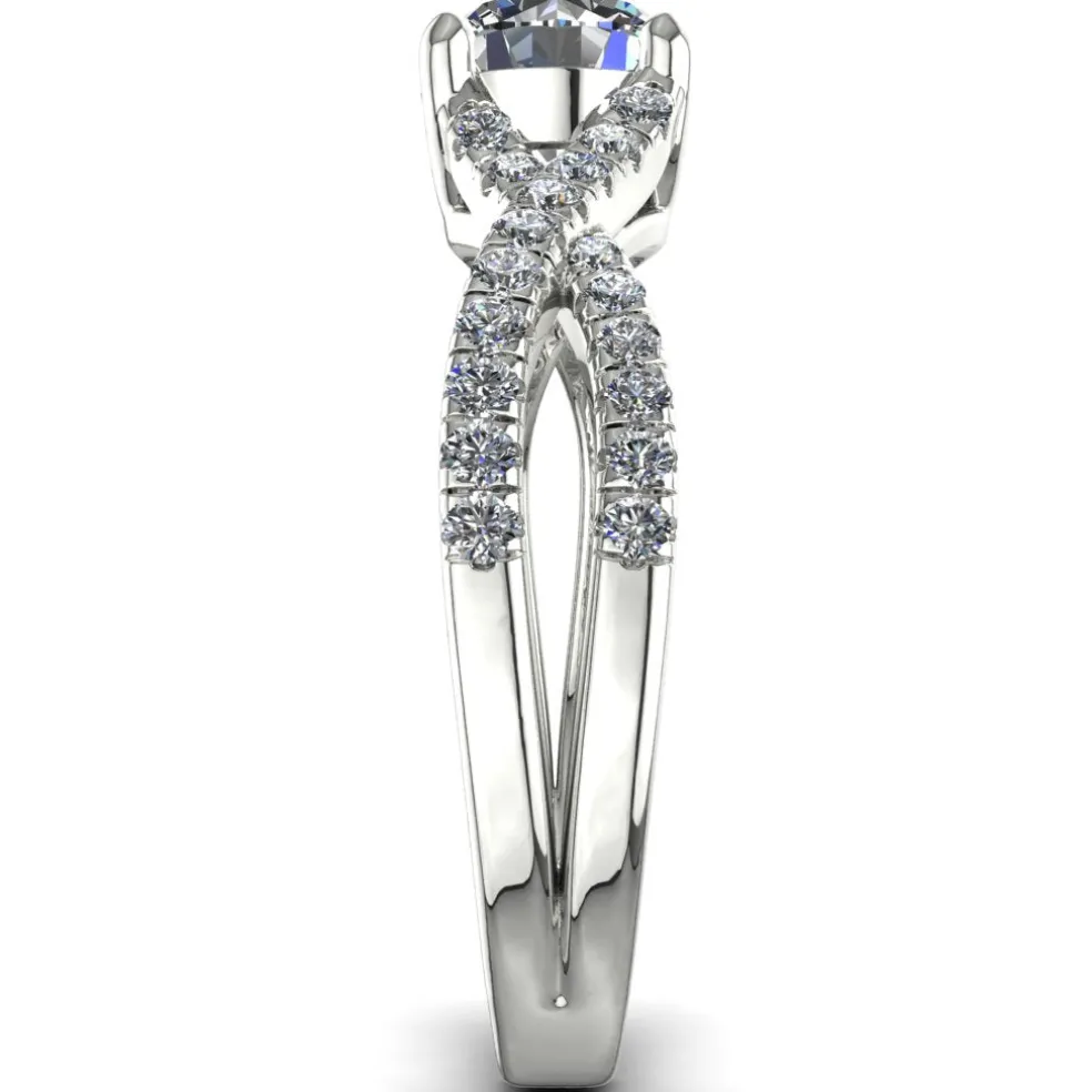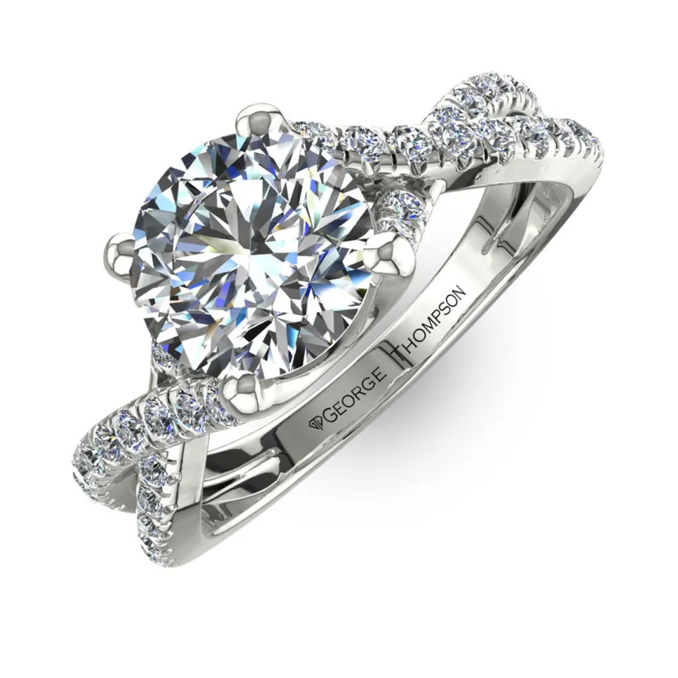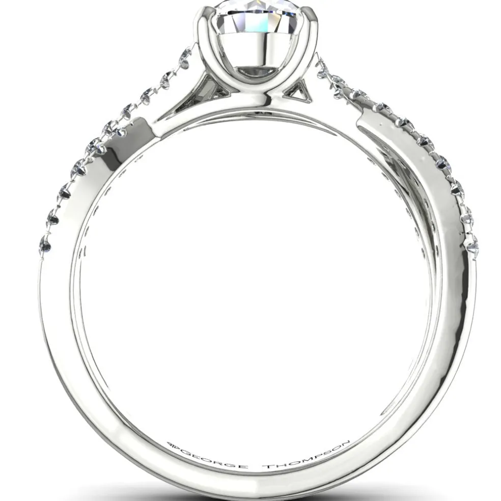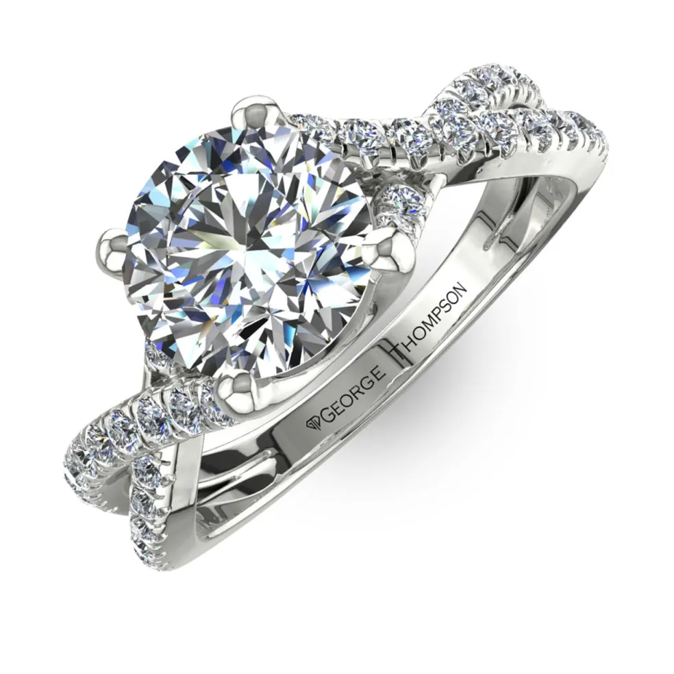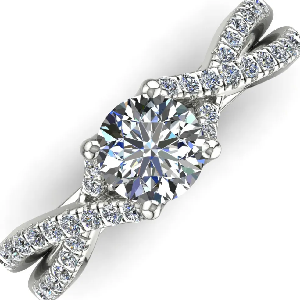 Look no further than The Tahiya! Featuring a sleek twist design and a stunning 0.90ct. center round brilliant diamond, this ring is accented by 36 Round Brilliant diamonds totaling approximately 0.20ct. With a total diamond weight of approximately 1.10cts. and weighing approximately 3.70 grams in 14kt white gold (also available in Yellow Gold, Rose Gold, Palladium, and Platinum).