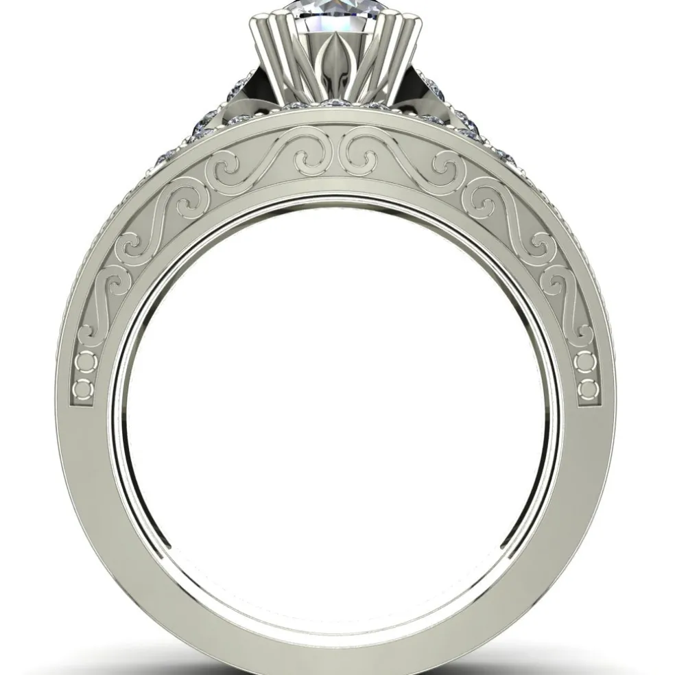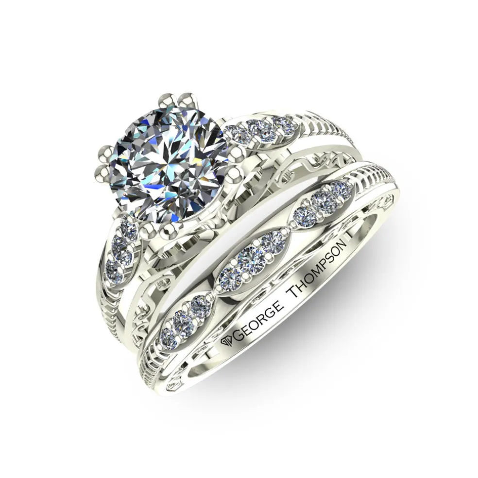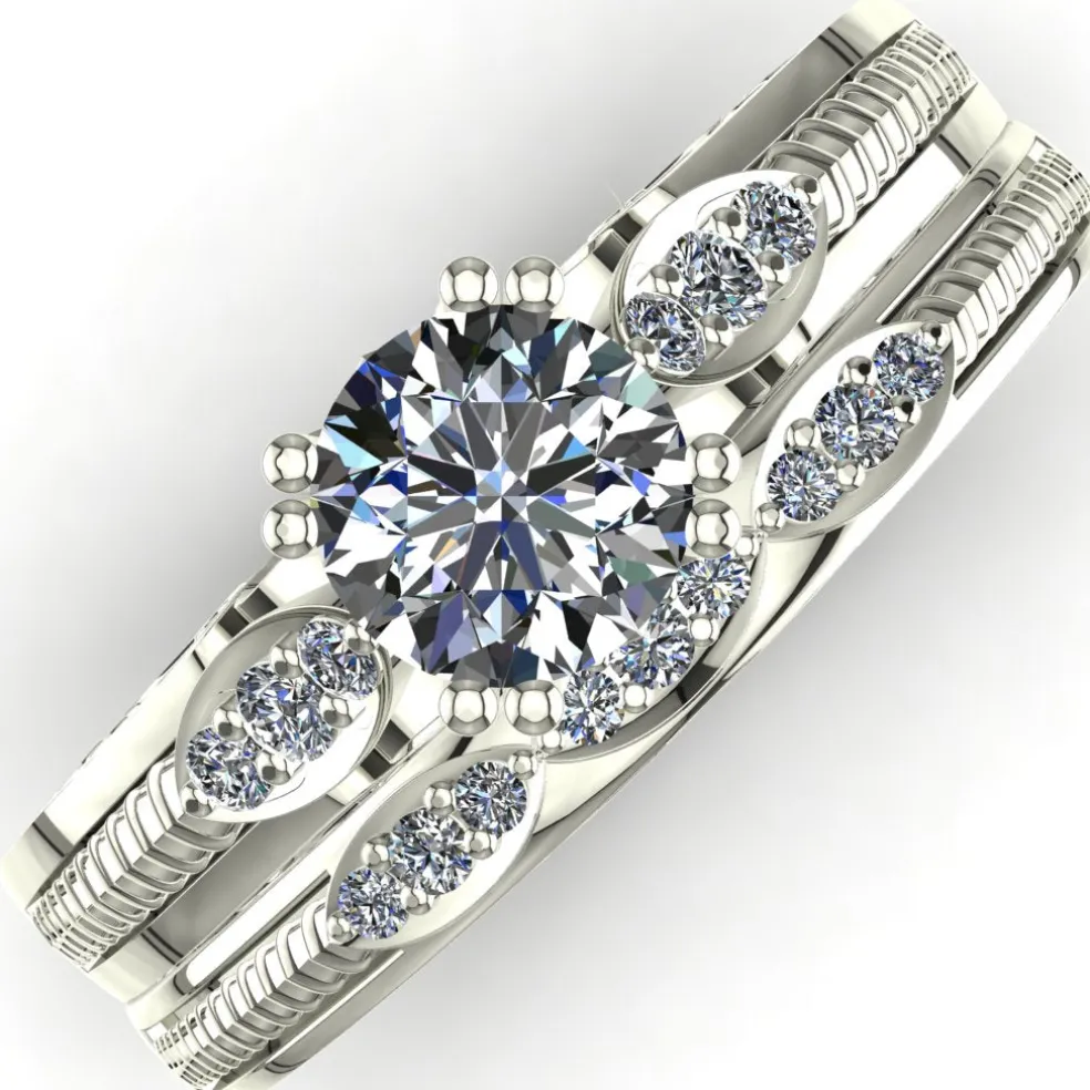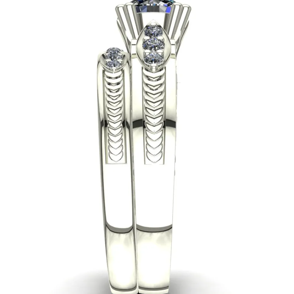 Meet the Agneta, a diamond wedding set that captures the essence of timeless beauty. With an intricate design and exquisite attention to detail, this ring features a center Round Brilliant Diamond that shines with a captivating brilliance of approximately 0.80 ct. Complemented by 15 Round Brilliant accent diamonds with an approximate total weight of 0.20 cts, this wedding set is a true masterpiece. With a total diamond weight of approximately 1.00 cts., this ring weighs approximately 9.50 grams in 14kt white gold, also available in Yellow Gold, Rose Gold, Palladium, and Platinum.