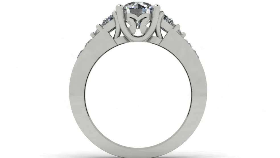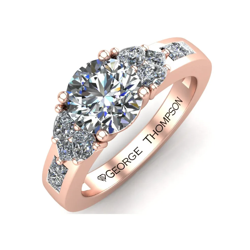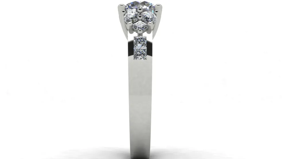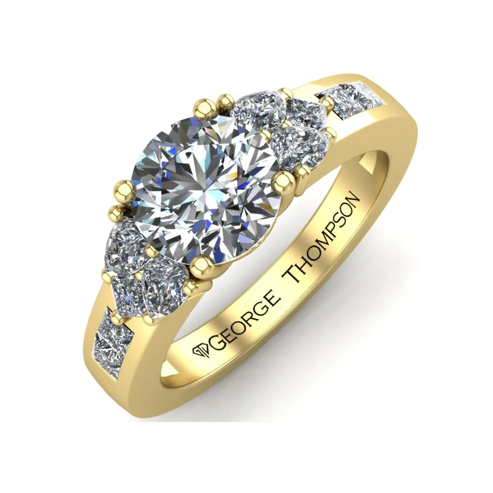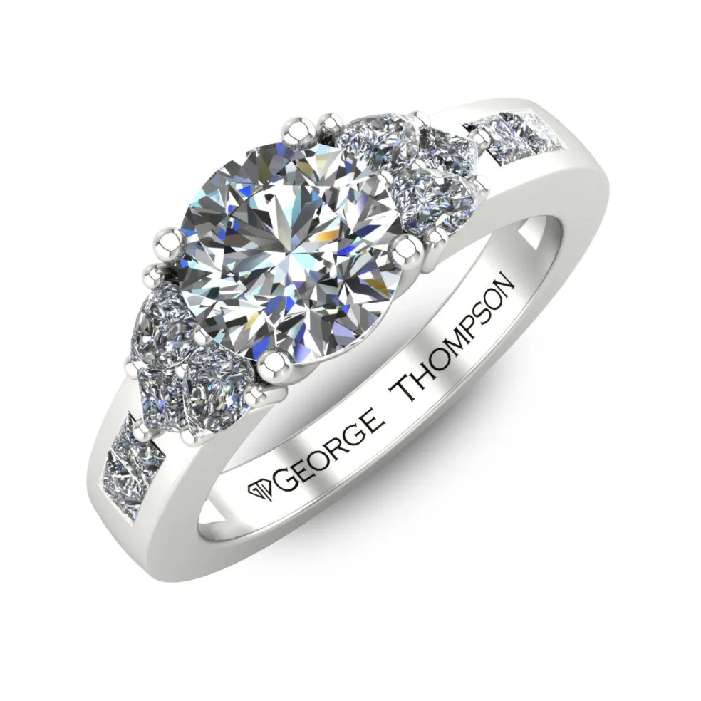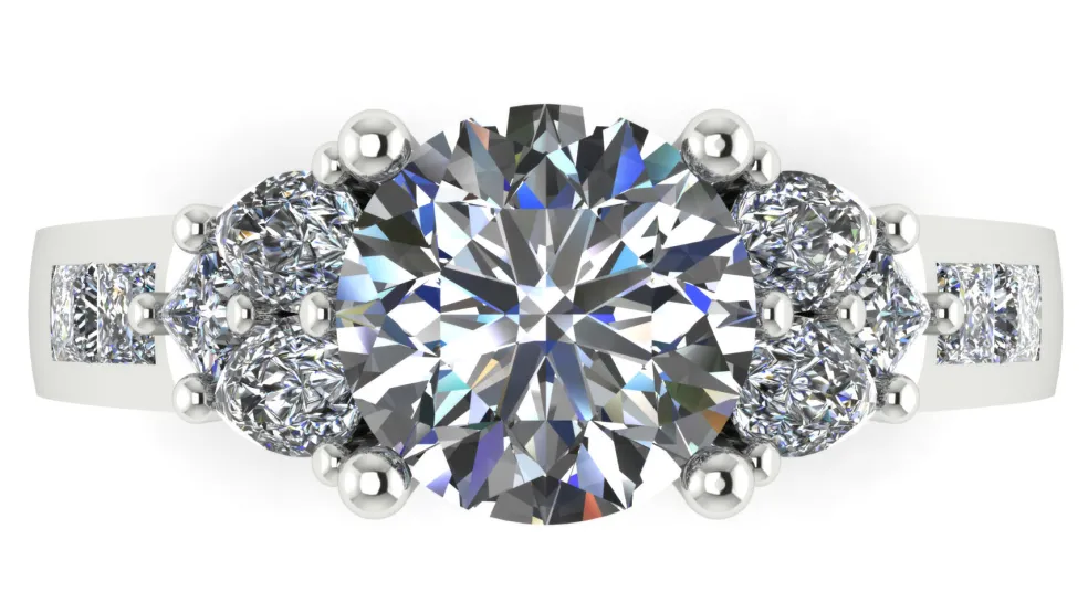 Introducing the ultimate symbol of style and sophistication, the Carlona. This stunning white gold ring is a masterpiece of elegance and charm. Featuring a center round brilliant diamond of approximately 1.25ct, and accented with 4 pear shape diamonds of approximately 0.30ct and 6 princess cut diamonds of approximately 0.30cts, this ring dazzles with a total diamond weight of 1.85cts and weighs 4.75g in 14kt gold.