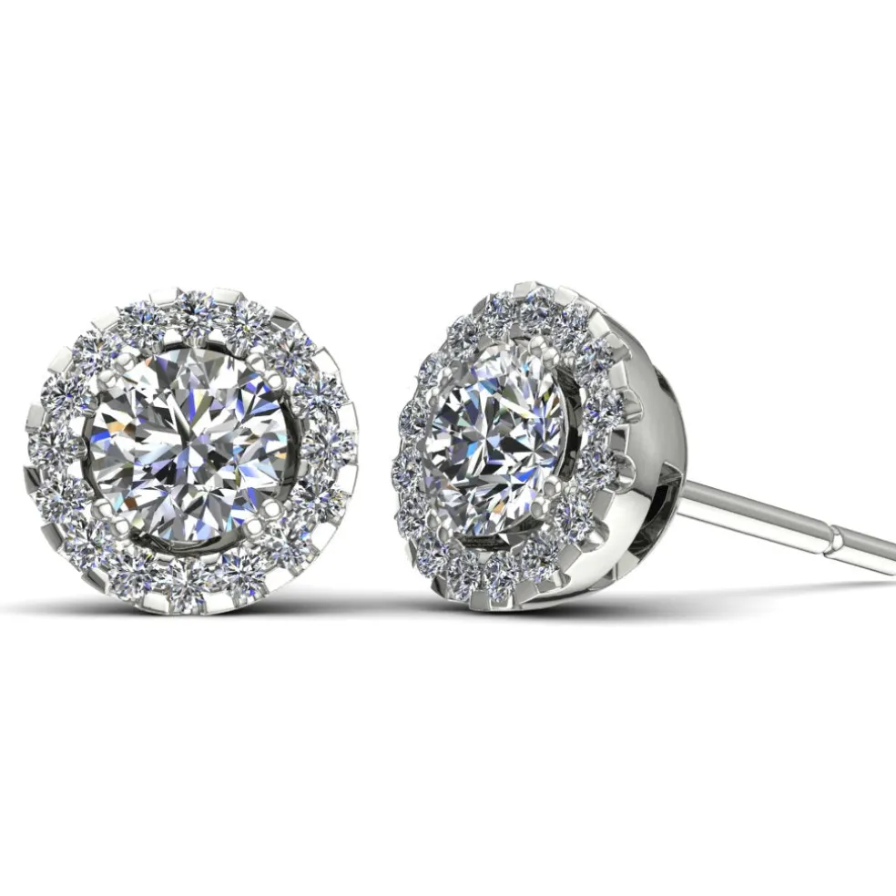 Behold the Chechiara, a dazzling addition to your jewelry collection. With a center Round Brilliant Diamond of approximately 0.80 ct. and 32 Round Brilliant accent diamonds totaling around 0.15 ct., these earrings have a total diamond weight of approximately 0.95ct.