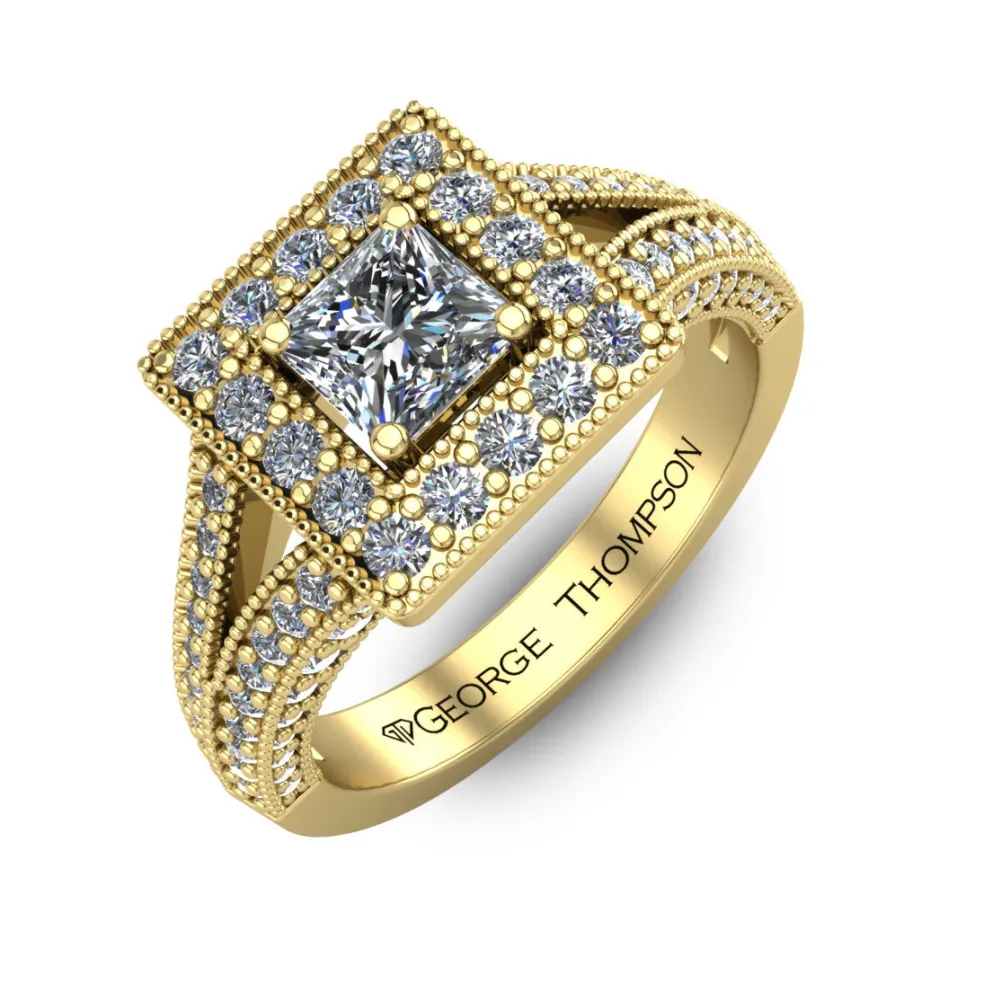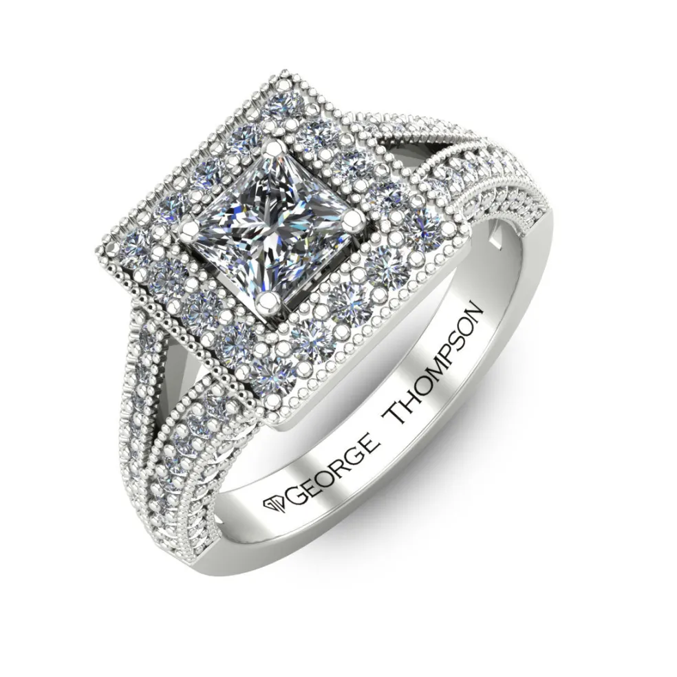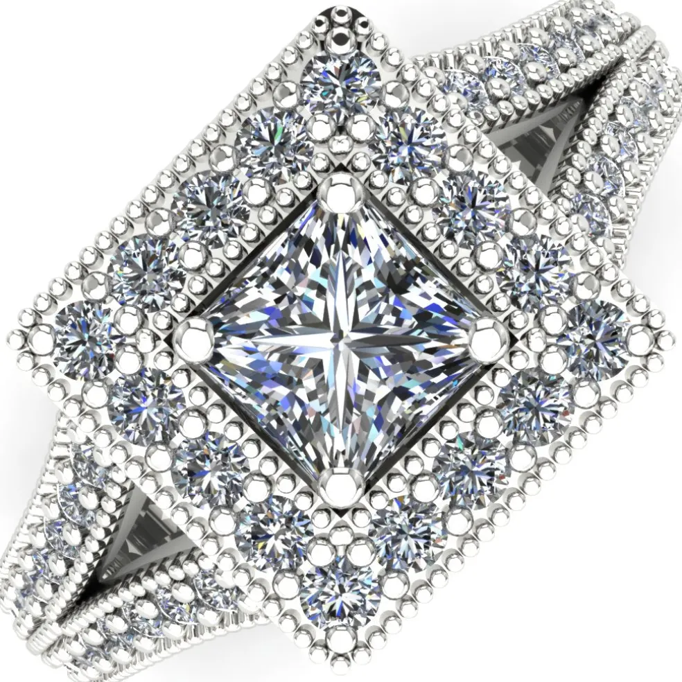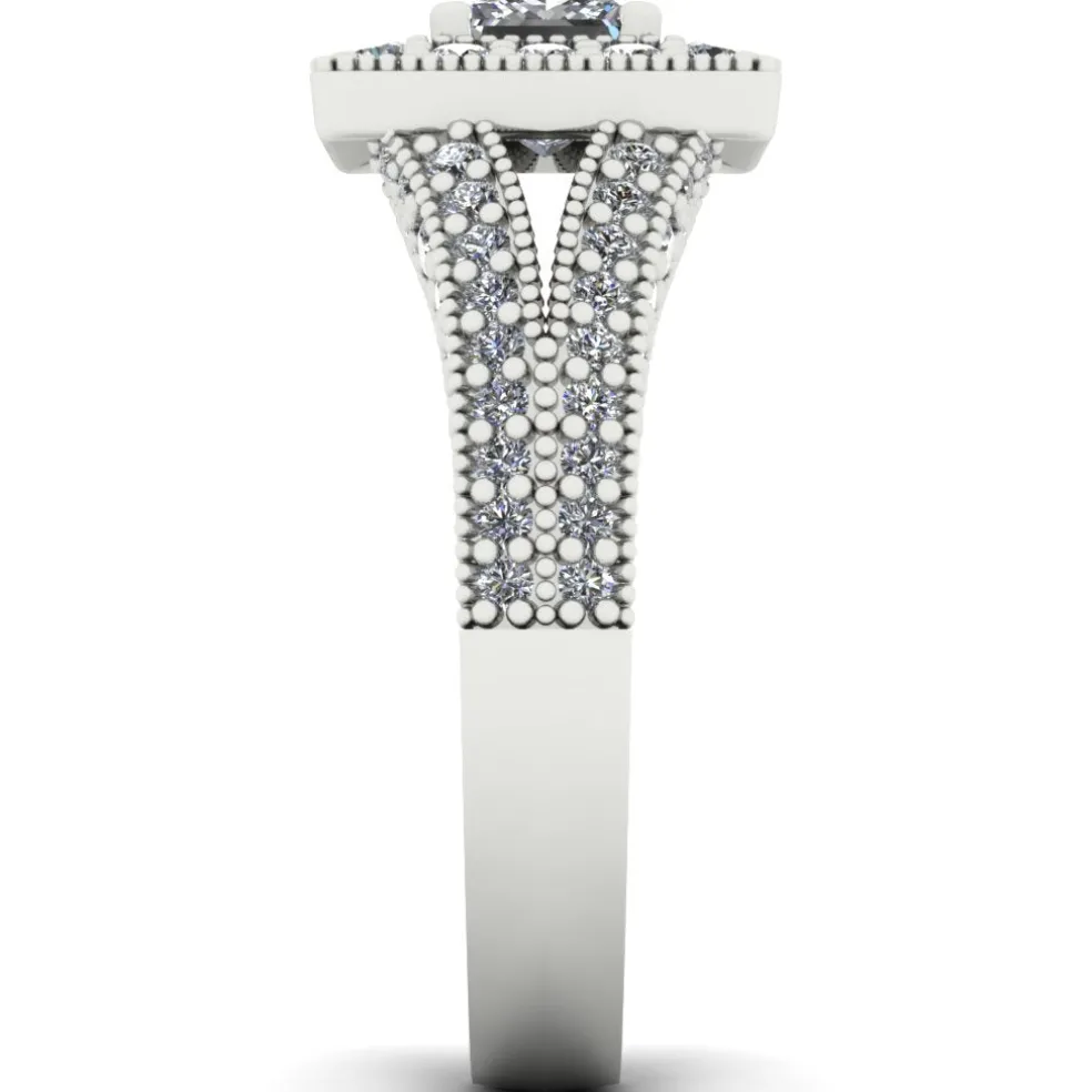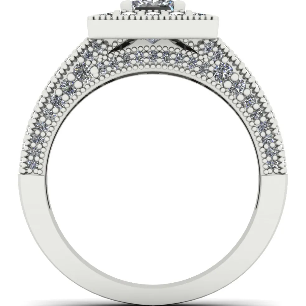 Elevate your look with the Fendera, the perfect choice for the modern and sophisticated bride. Crafted in lustrous 14kt white gold, this ring features a stunning center princess cut diamond of approximately 1/2ct, surrounded by 110 round brilliant accent diamonds with an approximate total weight of 0.75cts. With a total diamond weight of 1.25cts, this ring is a true showstopper that will take your breath away. Weighing 5.4g, the Fendera is a sleek and stylish addition to any jewelry collection. Its timeless design and attention to detail make it the perfect symbol of your everlasting love and commitment.