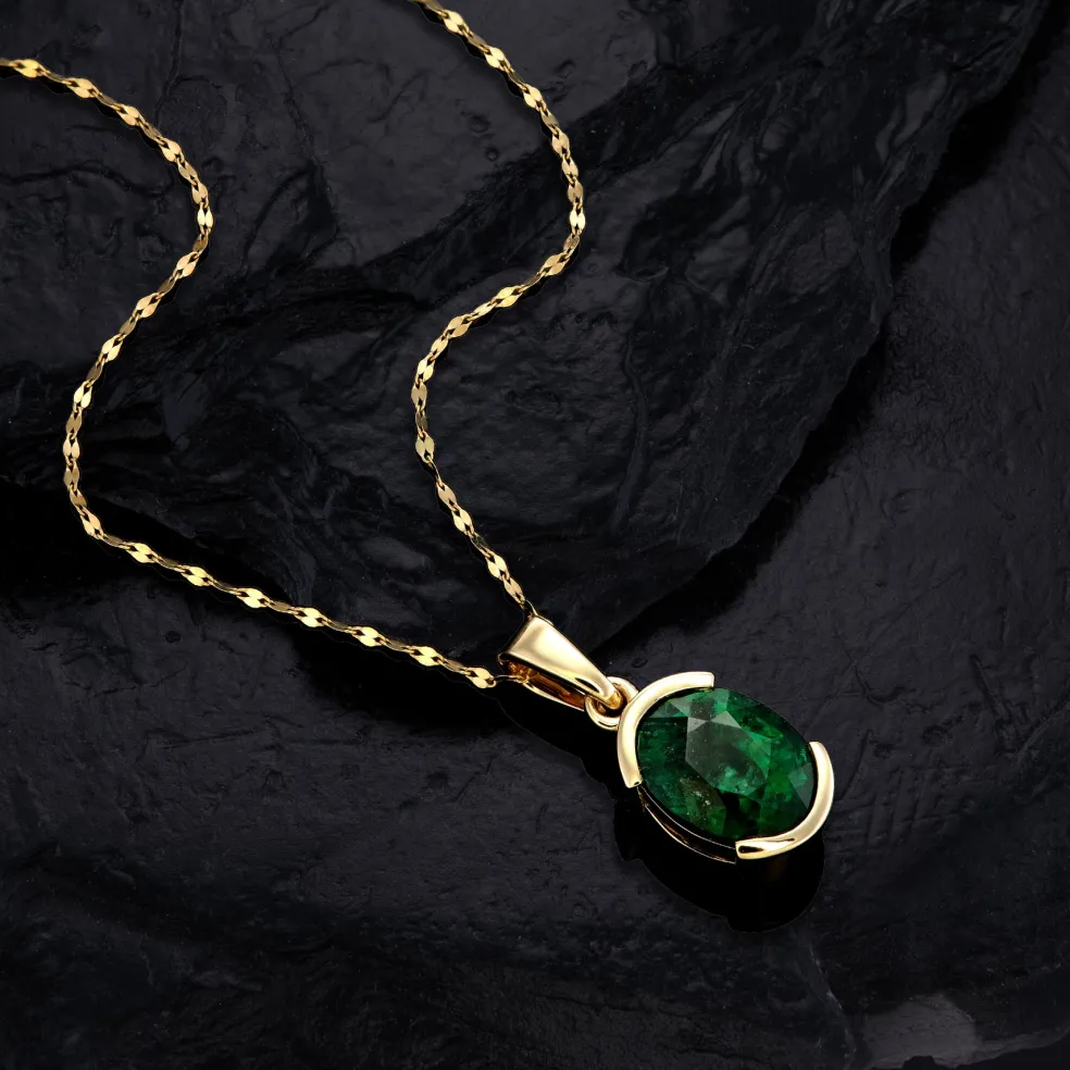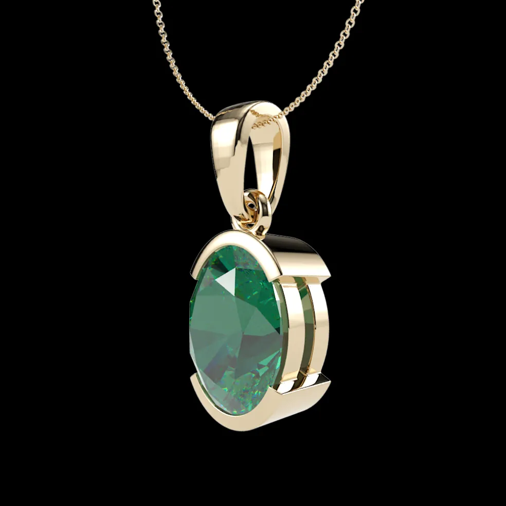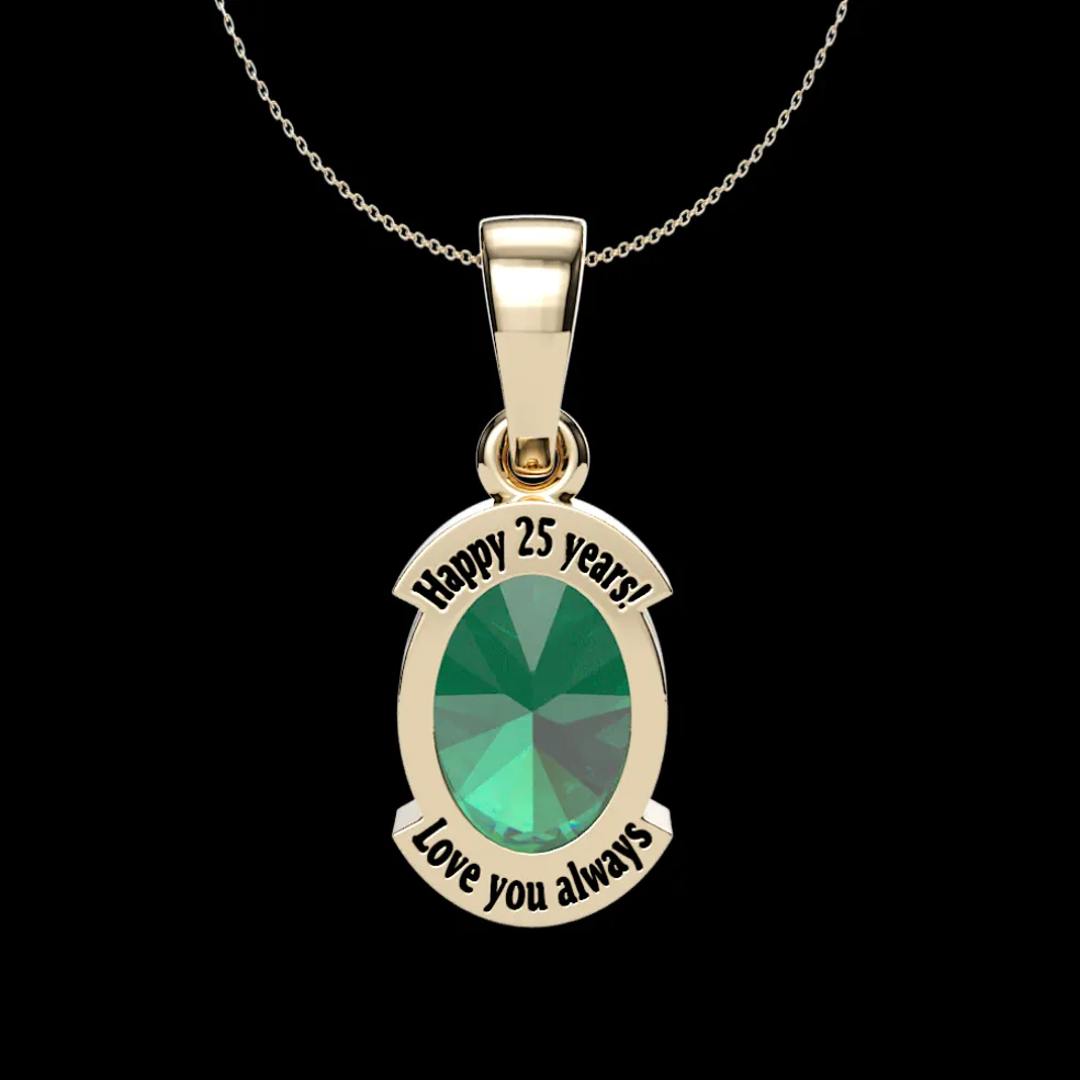Embark on a journey through time and treasure with this bespoke pendant, a radiant celebration of love and milestones, the Ferris. Crafted from 14KT yellow gold, weighing 2.67 grams, this pendant is a beacon of elegance and sentimentality. At its center gleams a resplendent oval-cut tsavorite, 3.55 carats of verdant brilliance, symbolizing growth, renewal, and the enduring beauty of love. On the back, a heartfelt message awaits, etched on a custom plate: ‘Happy 25 years! Love you always.’ It’s not just a pendant; it’s a precious keepsake, capturing the essence of cherished memories and the promise of forever.