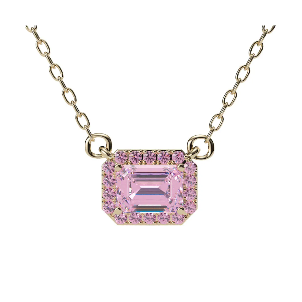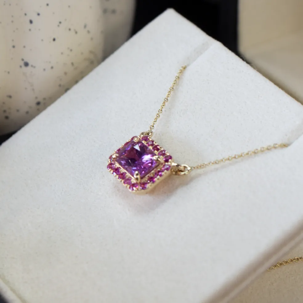 Introducing the enchanting Giovanna pendant, a masterpiece that showcases a stunning Radiant-Cut Pink Tourmaline center stone weighing approximately 1.59cts. Framed by a sparkling halo of 18 Round Pink Sapphires weighing approximately 0.30ct, this pendant exudes sophistication and elegance. The total pink tourmaline and pink sapphire weight of approximately 1.89cts. is set in a luminous 14kt yellow gold that weighs approximately 1.71 grams, offering a warm and inviting touch.