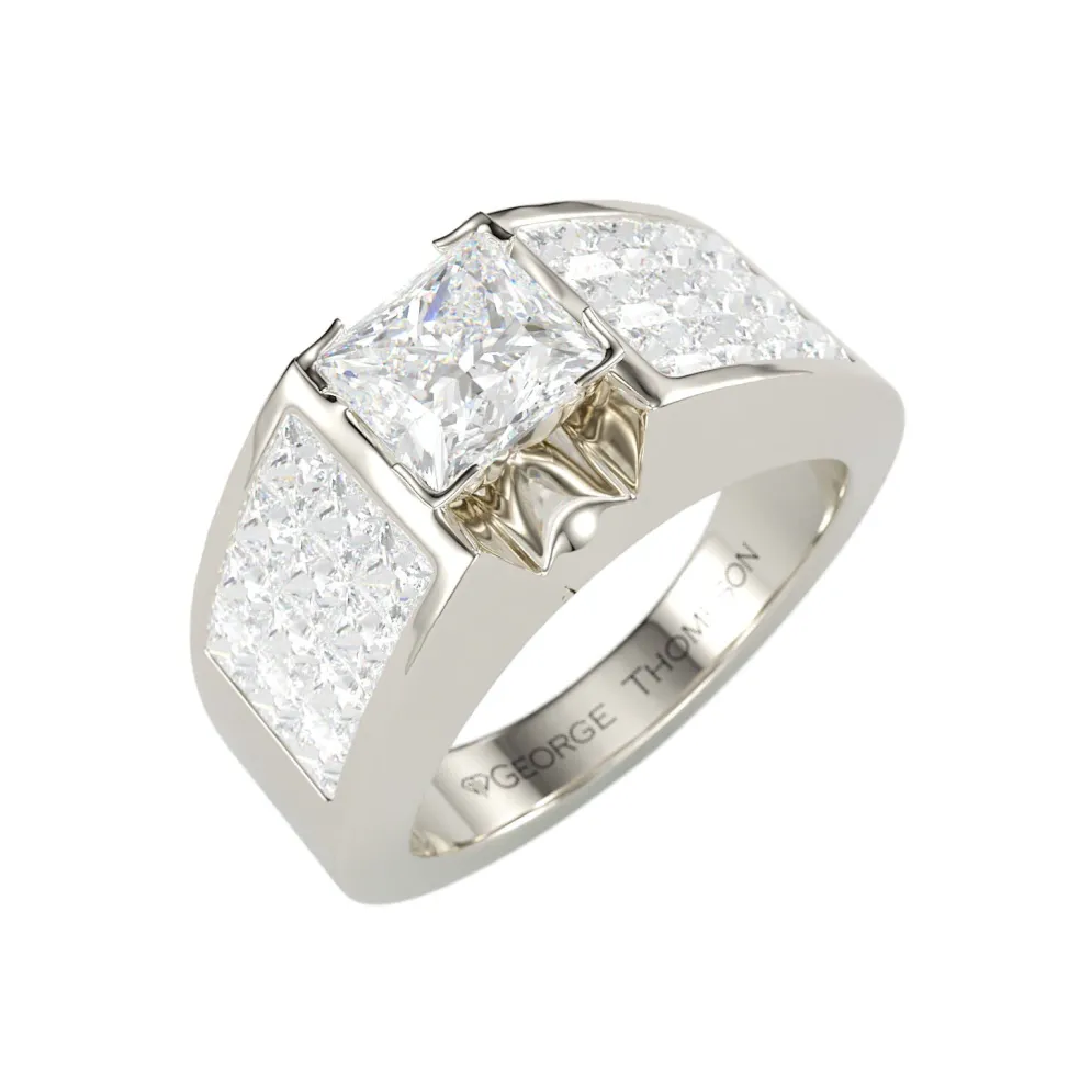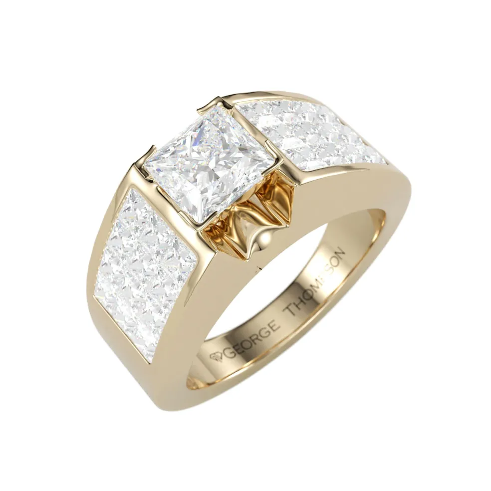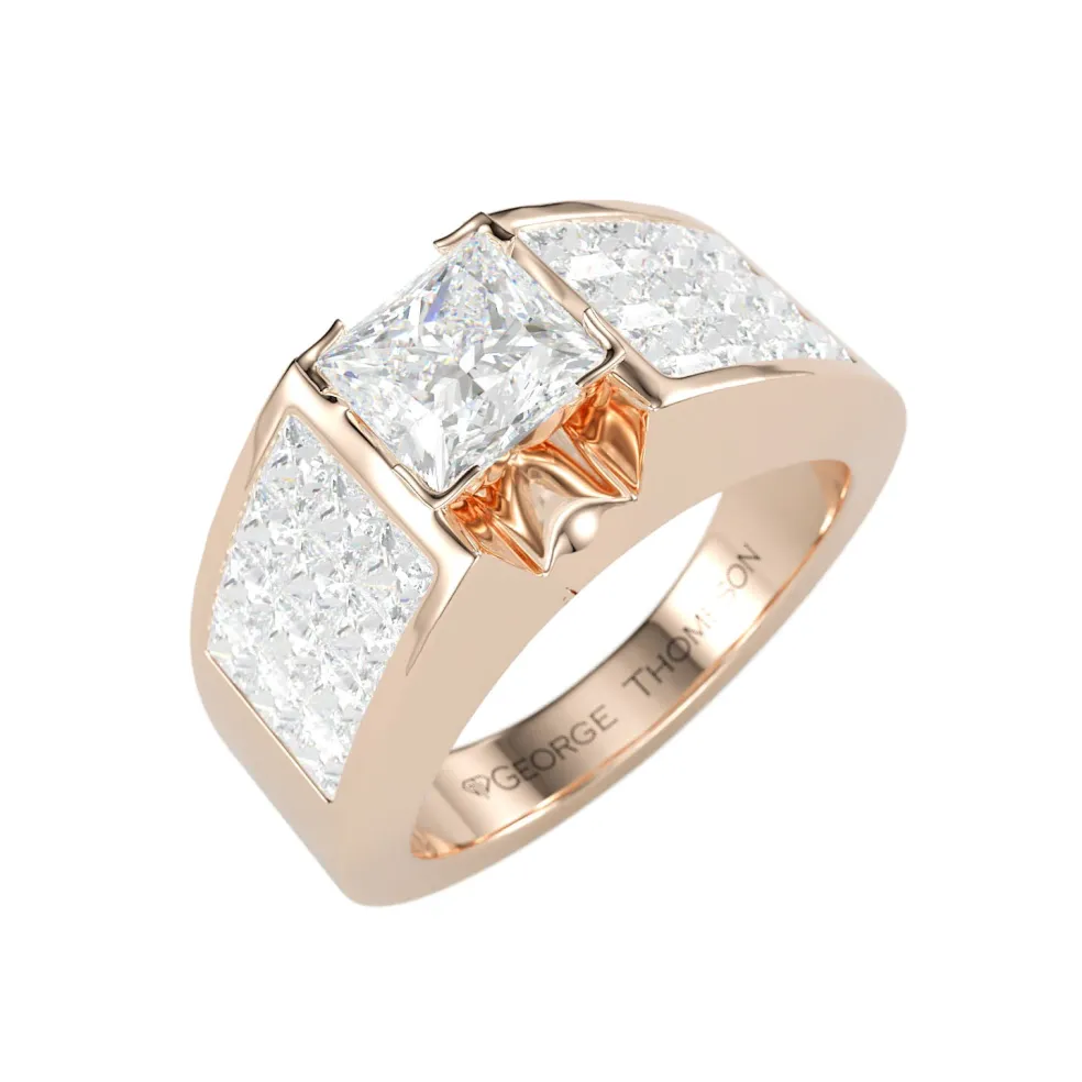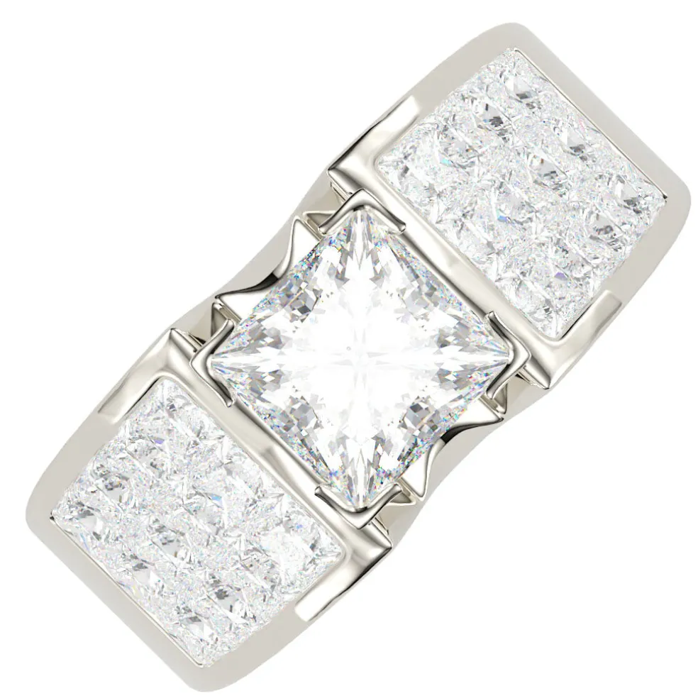 But this ring’s magic doesn’t stop there, 24 princess-cut diamonds form a heavenly halo, cascading like a waterfall of light, totaling an astonishing 1.20 cts. These side diamonds are like a choir of angels, harmonizing to elevate the central diamond’s brilliance to celestial heights.