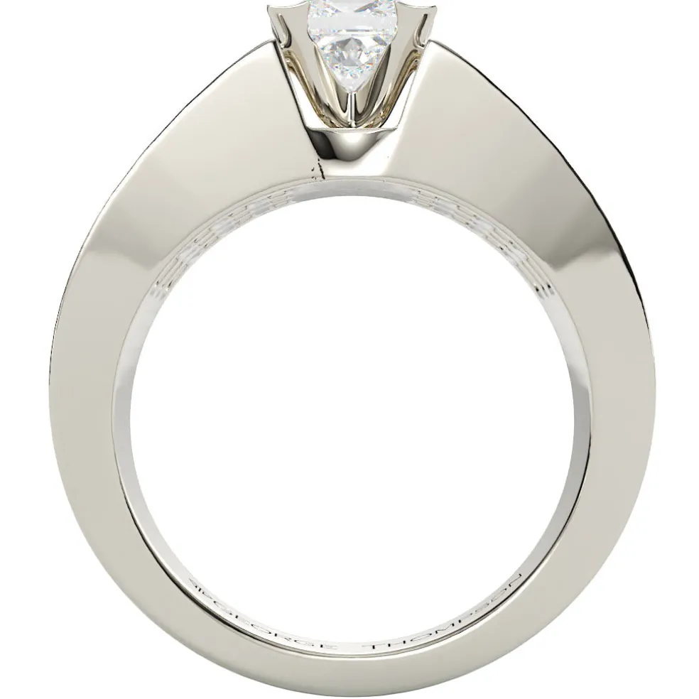Step into a realm of enchantment with this custom 14kt White Gold diamond engagement ring, the Hemina. At its heart lies a majestic princess-cut diamond, a brilliant 1.00 ct. gem that reigns supreme in its grace and radiance. This center stone is a symbol of your love’s regal splendor, commanding attention and admiration with every flicker.