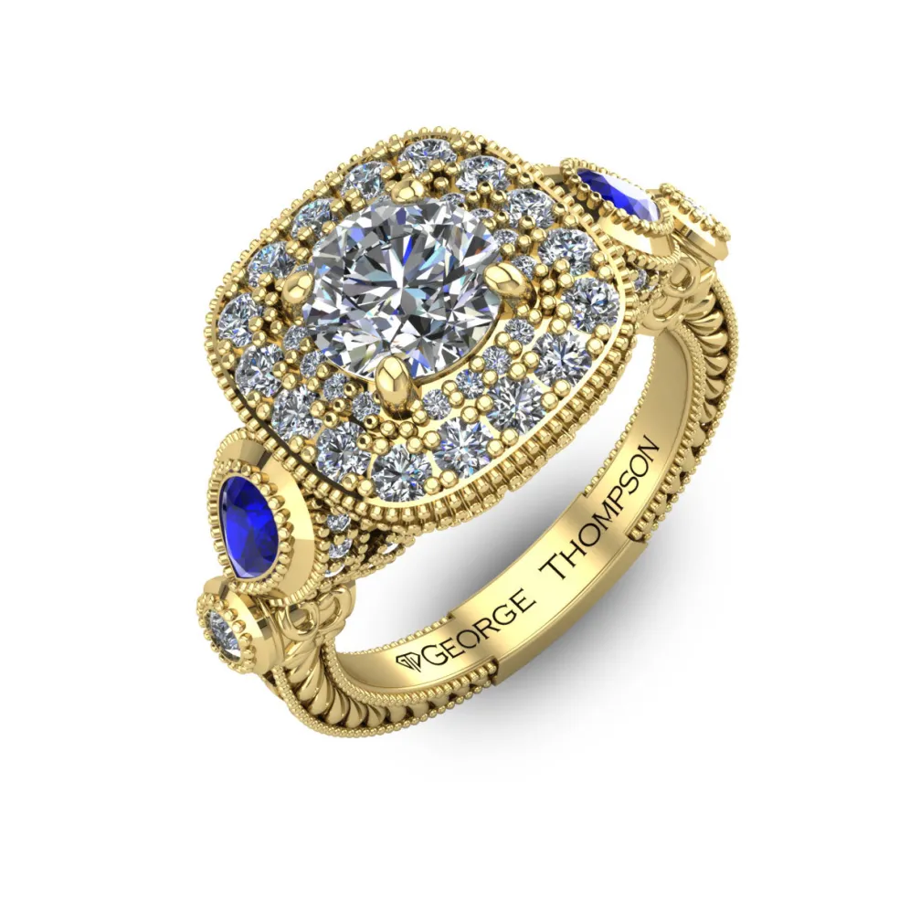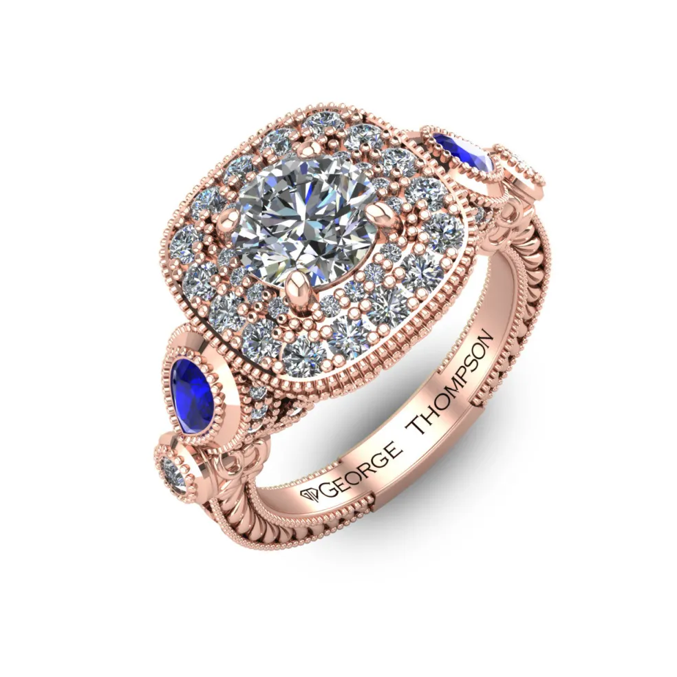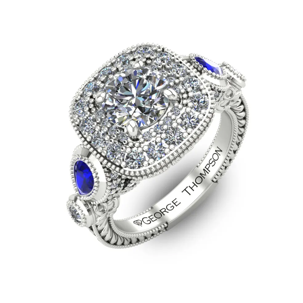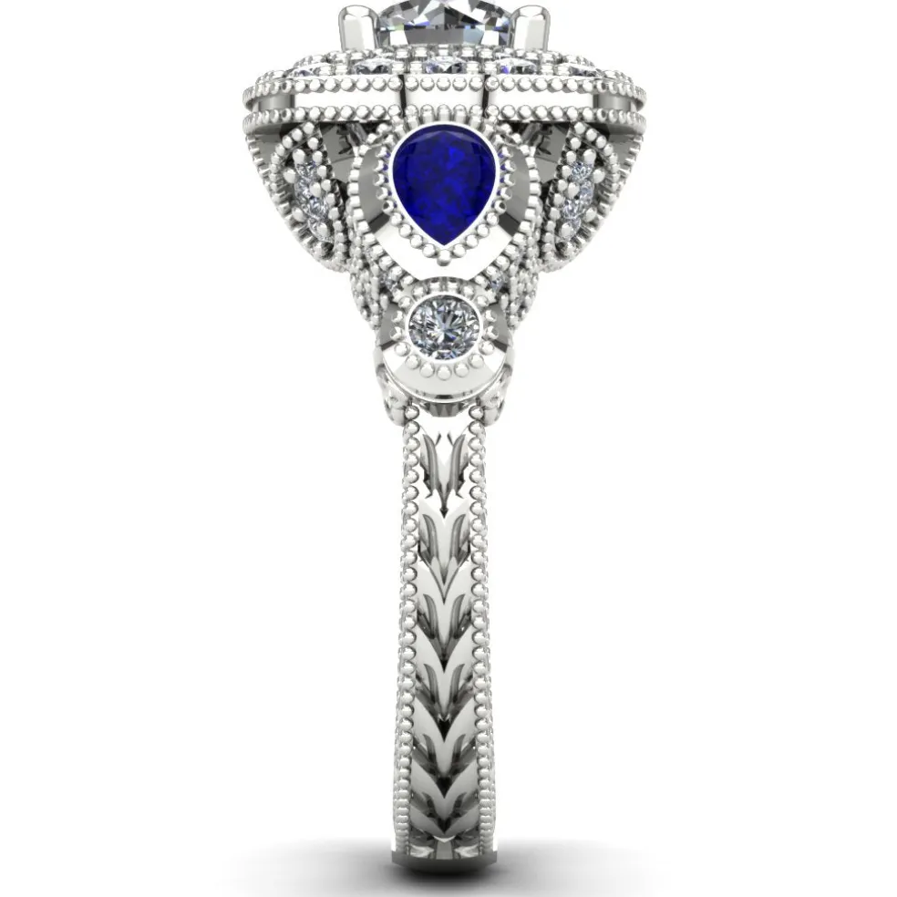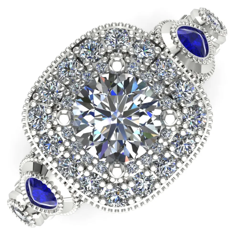 Step back in time with this vintage inspired diamond engagement ring. The Jovetta embodies the perfect blend of vintage charm and contemporary elegance. This one-of-a-kind piece features a breathtaking center Round Brilliant Diamond of approximately 0.80ct., accented by 86 Round Brilliant diamonds with an approximate total weight of 0.65ct. and two pear-shaped sapphires with an approximate total weight of 0.25cts. The result is a stunning total diamond weight of 1.45cts. and total sapphire weight of 0.25cts.