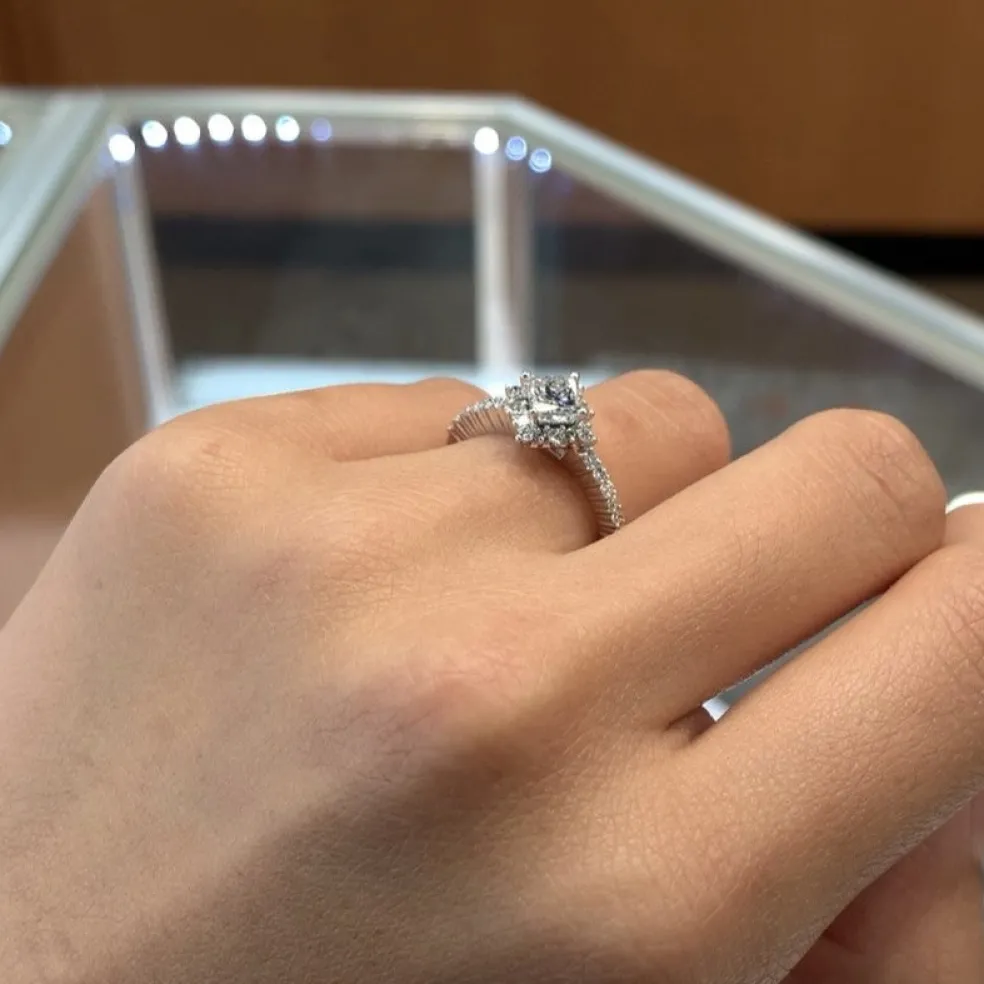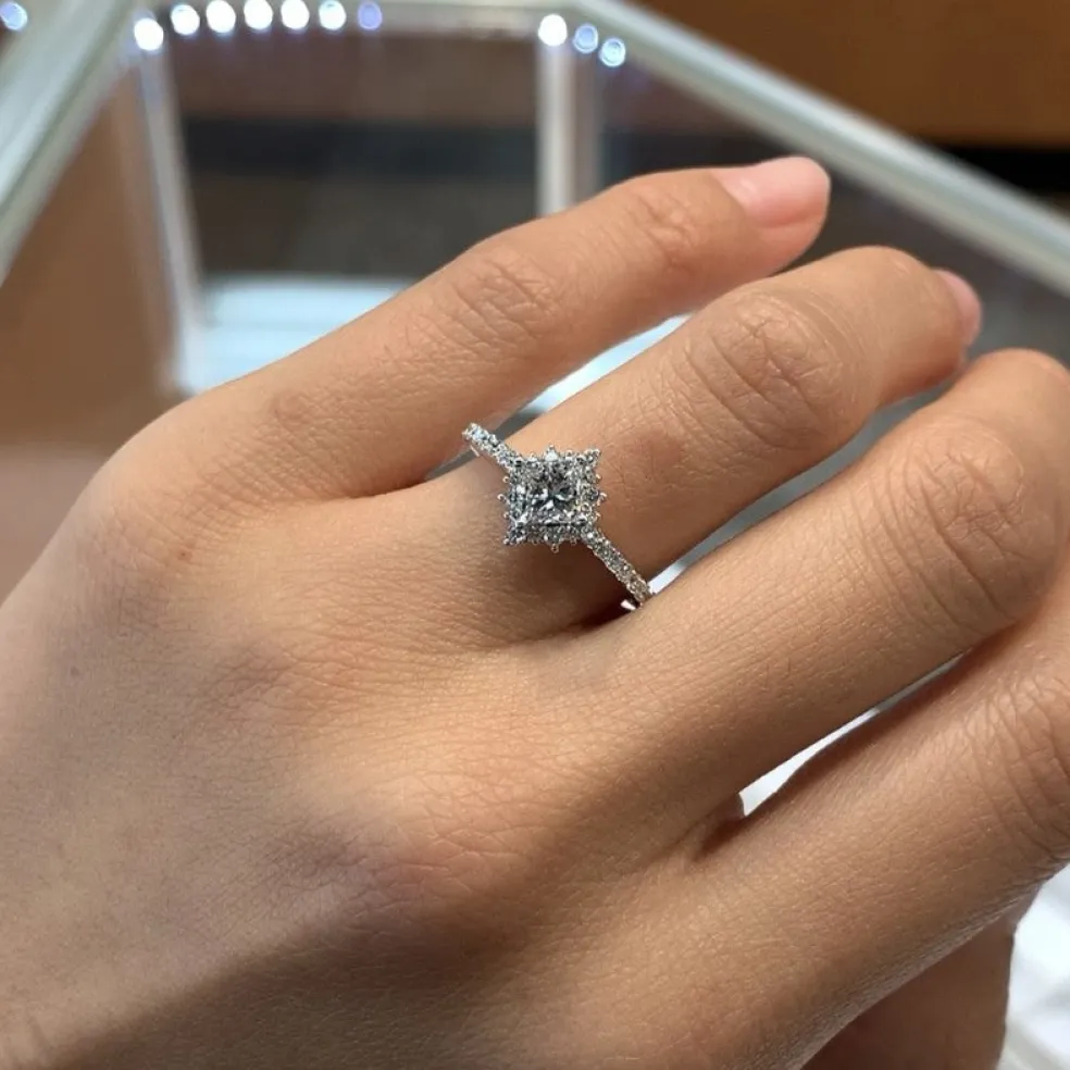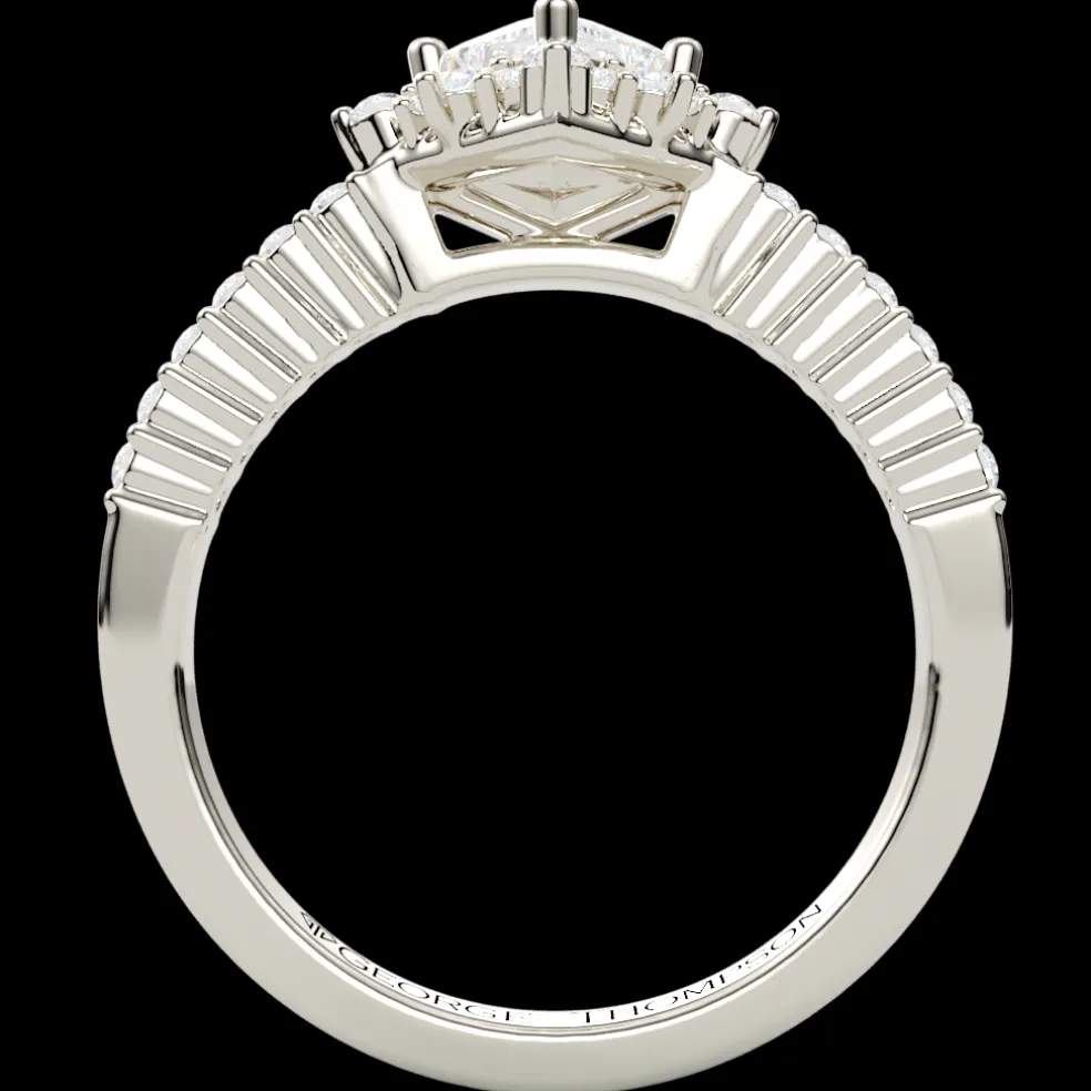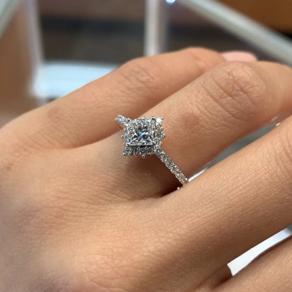 Prepare to dazzle your way into forever with this engagement ring – a sparkling testament to your love story, the Lysandra. Crafted from 14KT white gold, weighing 3.35 grams, it’s a feather-light symbol of your profound connection. At its core reigns a petite yet powerful princess-cut diamond, 0.40 carats of pure enchantment, symbolizing the brilliance of your love. Surrounding it are 29 round brilliant-cut diamonds, each one a sparkling tribute to the journey that brought you here, totaling 0.35 carats of celestial radiance. With this ring, your love story takes center stage, ready to shine brighter than ever before.