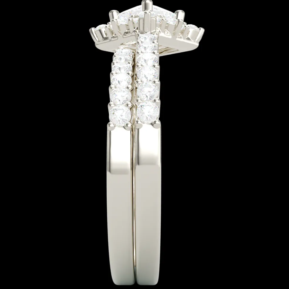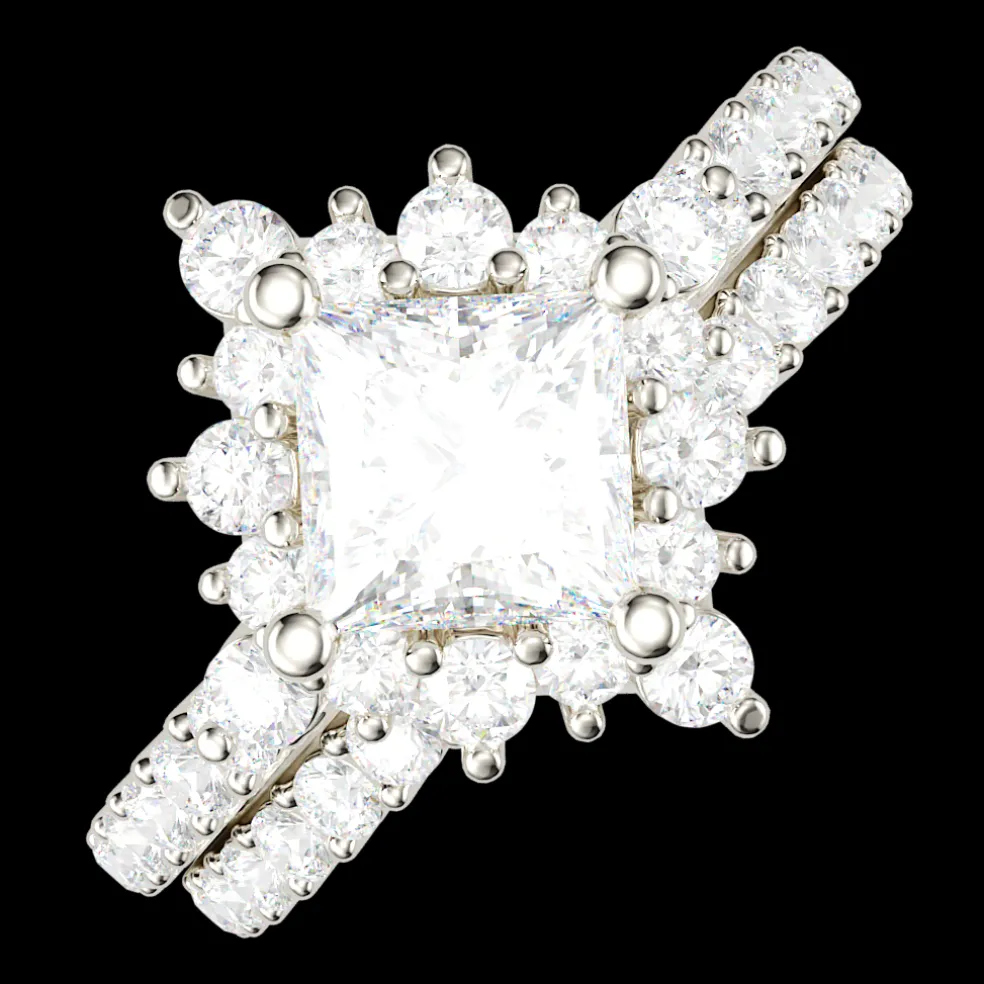 Behold, a wedding set that’s not just a match made in heaven, but a dazzling declaration of your eternal bond, the Lysandra. Crafted from 14KT white gold, weighing 4.91 grams, this set is a harmonious symphony of elegance and grace. At its heart reigns a petite yet powerful princess-cut diamond, 0.40 carats of pure enchantment, symbolizing the brilliance of your love. Surrounding it are 45 round brilliant-cut diamonds, each one a sparkling tribute to the countless moments that led you to this day, totaling 1.01 carats of celestial radiance. With this set, your love story takes center stage, shining brighter than ever before. It’s not just a wedding set; it’s a masterpiece in the making, ready to be worn as you embark on your next chapter together.