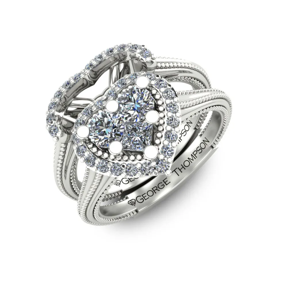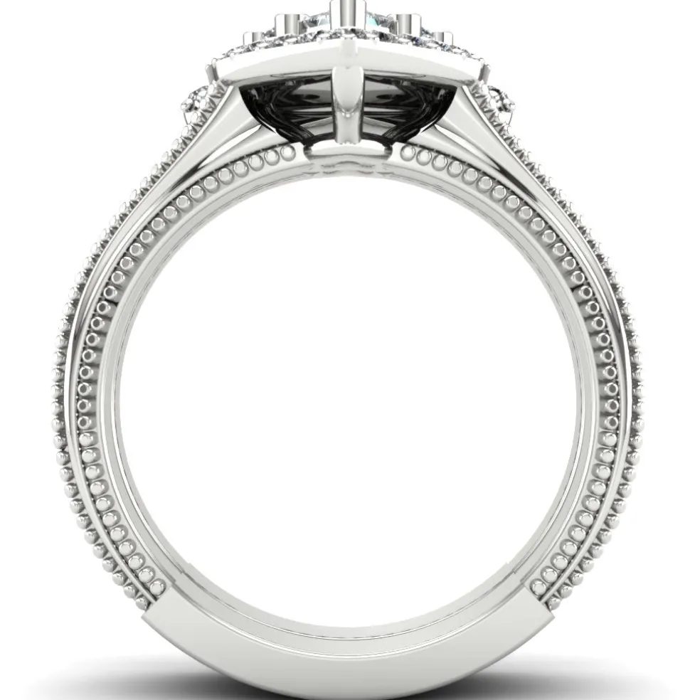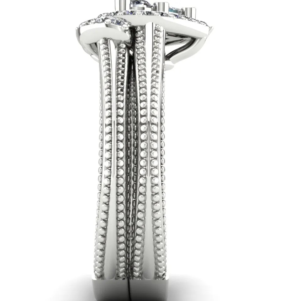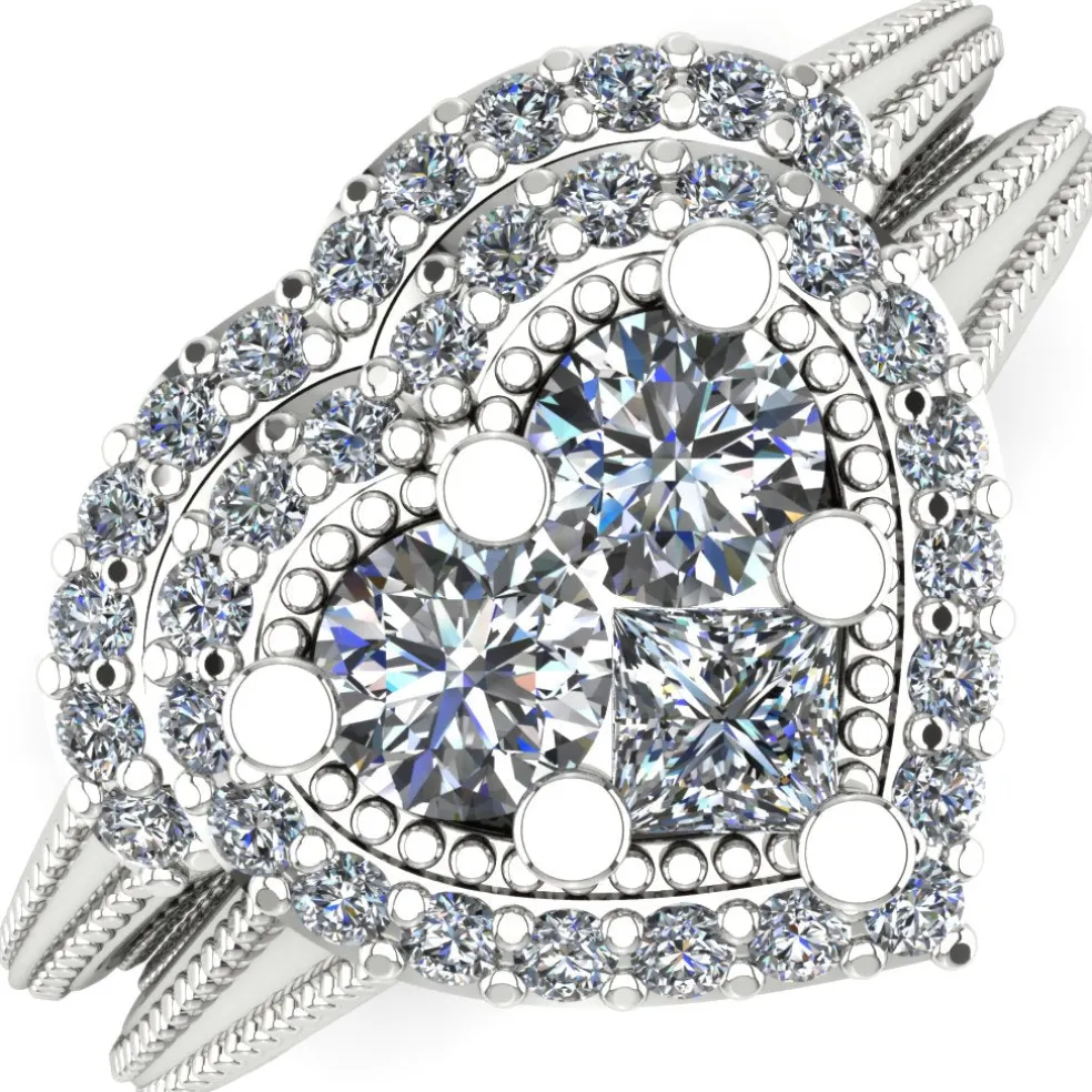 Meet the Malica, a diamond wedding set that is both gorgeous and chic. Crafted with 14kt white gold, this ring boasts a unique center cluster of 2 Round Brilliant diamonds and a Princess Cut diamond that sparkle with a brilliance of approximately 1/2ct. The center cluster is accented by 33 Round Brilliant accent diamonds with an approximate total weight of 0.20cts, adding a touch of shimmer to the ring.