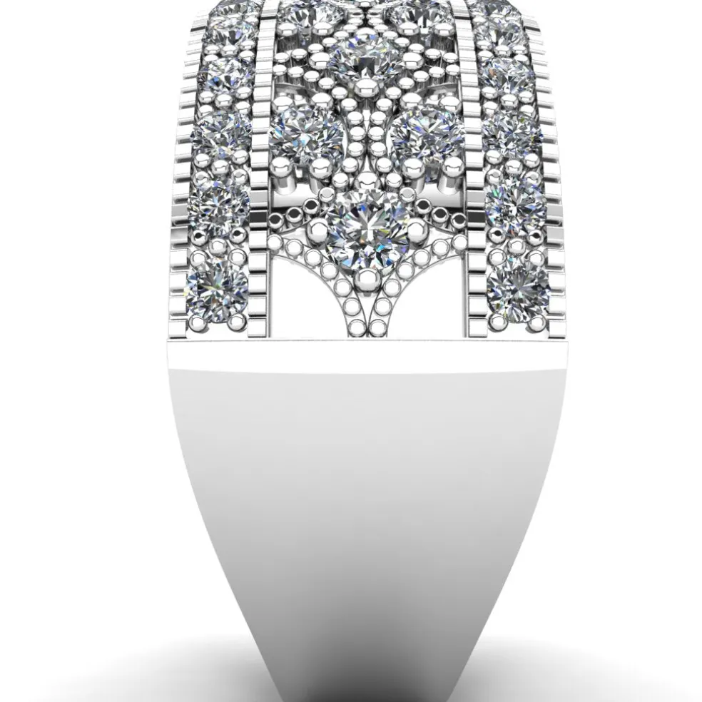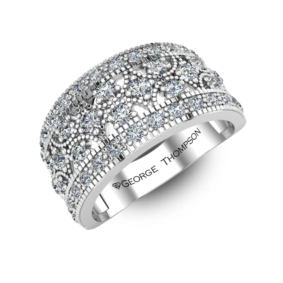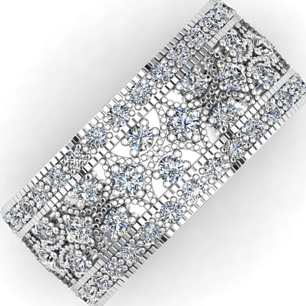 If you’re a vintage-loving bride in search of the perfect wedding band, look no further than our stunning vintage-inspired band with a modern twist. The band features 46 round brilliant accent diamonds with an approximate total weight of 0.90cts, making for a band that sparkles with every move you make. With a total diamond weight of approximately 0.90cts and a weight of approximately 6.40 grams in 14kt white gold, this band has a substantial feel that’s perfect for the bride who wants to make a statement.