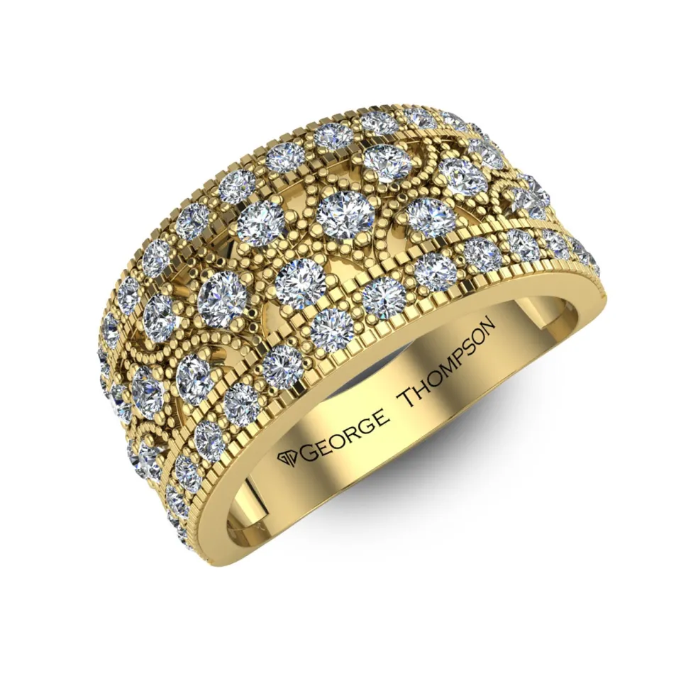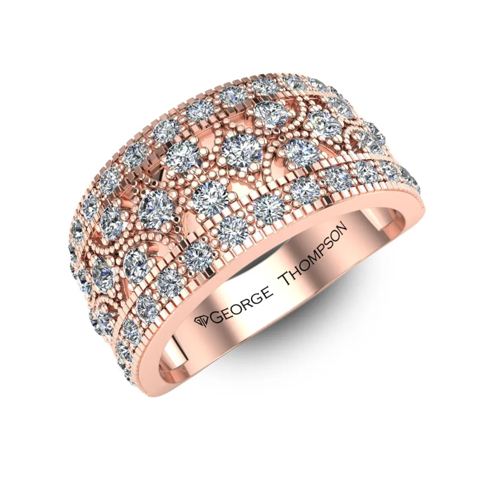 Plus, with options for yellow gold, rose gold, palladium, and platinum, you can customize the band to match your unique style. We can make it to fit any size, ensuring a perfect fit for your special day. Whether you’re looking for a vintage-inspired band that’s both timeless and trendy, this unique wedding band will perfectly suit your style.