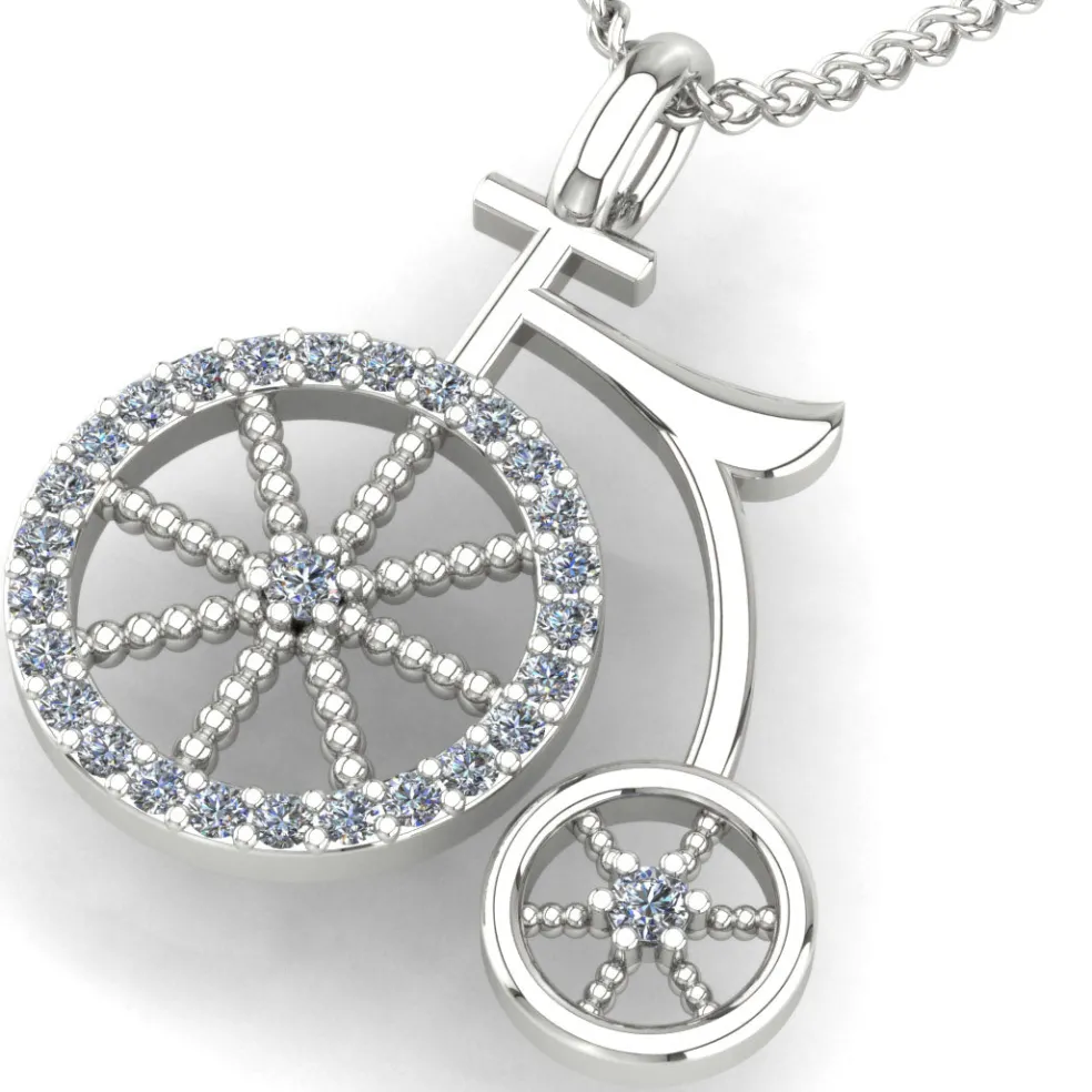 Ride in style with The Penca! Featuring a playful bicycle design, this pendant is adorned with 28 Round Brilliant Diamonds of approximately 0.35cts, adding just the right amount of sparkle to your look. Crafted with 14kt White Gold and weighing approximately 2.1 grams,