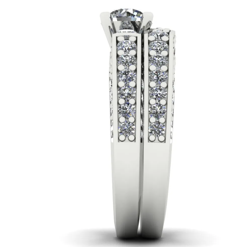 The Salita, a White Gold Diamond Wedding Set. A Center Round Brilliant Diamond of approximately 2/3ct. and 134 Round Brilliant accent diamonds with an approximate total weight of 1.00cts. This Wedding set has a total diamond weight of approximately 1.70cts and weighs 7.4g in 14kt White Gold.