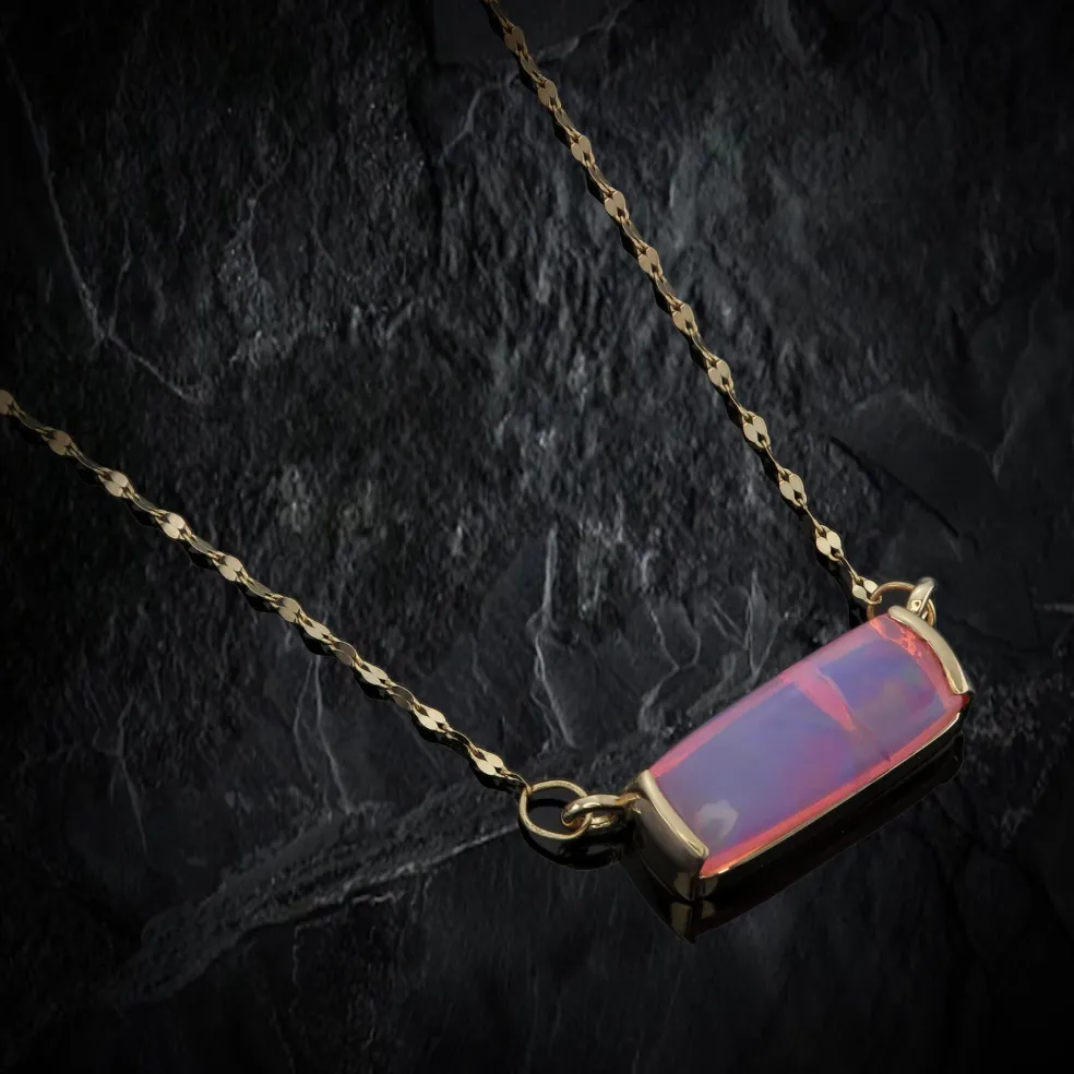 Introducing a pendant that radiates elegance and whimsy, the Sevasta! This 14KT Yellow Gold pendant, weighing 1.20 grams, showcases a stunning 1.60-carat pear-shaped pink opal. Perfectly blending sophistication with a playful splash of color, this pendant is a captivating addition to any jewelry collection. Let its unique charm and delicate design light up your look and your day!