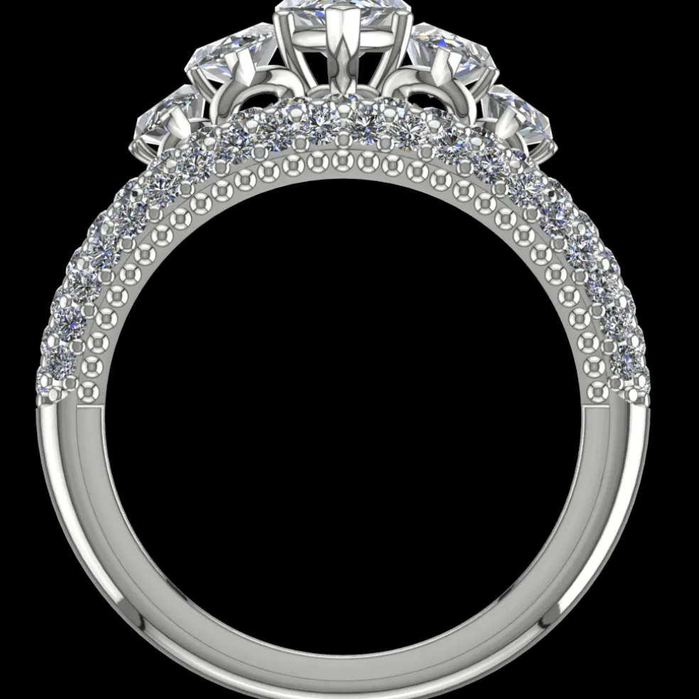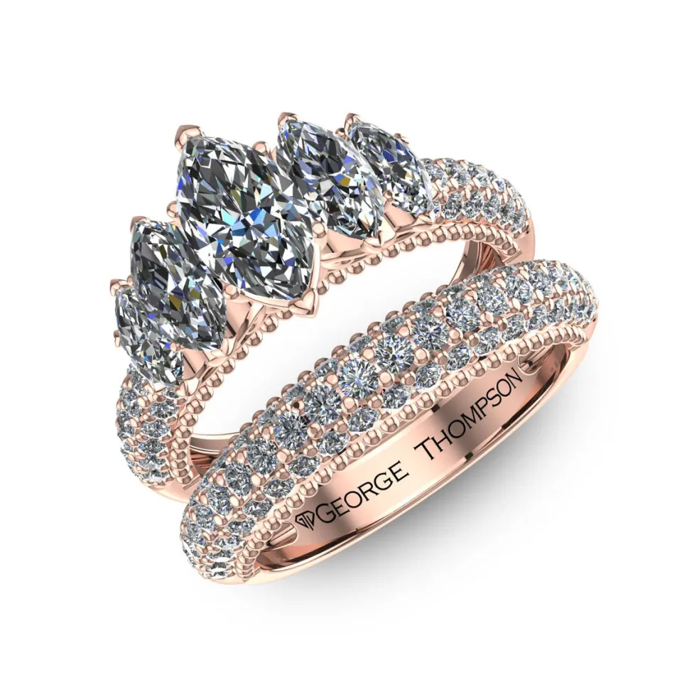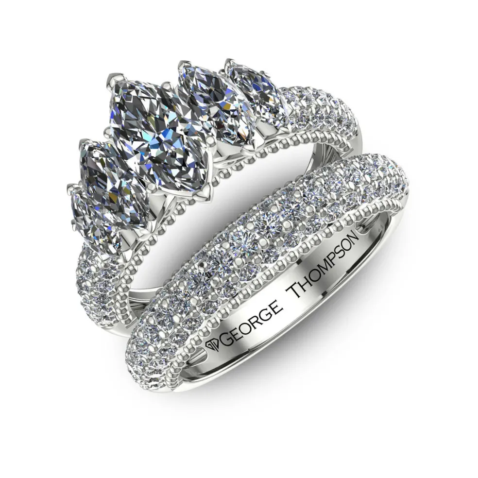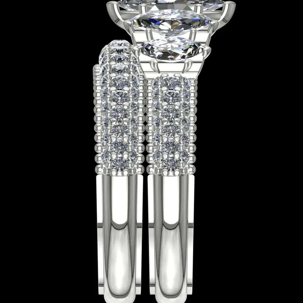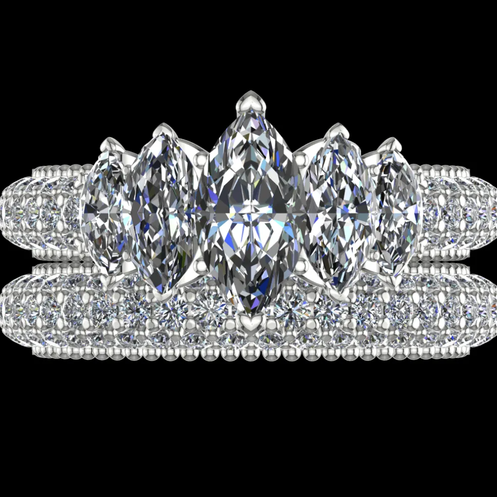 Get ready to turn heads with the Suha, a diamond wedding set that exudes opulence and sleekness. With a center marquise cut diamond of approximately 0.60ct, surrounded by 4 marquise cut diamonds and 97 round brilliant accent diamonds with a total weight of approximately 1.90cts, this ring is a true work of art. With a total diamond weight of approximately 2.50cts, this ring is a statement piece that will leave a lasting impression. The ring is crafted in white gold and weighs approximately 8.80 grams in 14kt, but is also available in yellow gold, rose gold, palladium, and platinum.