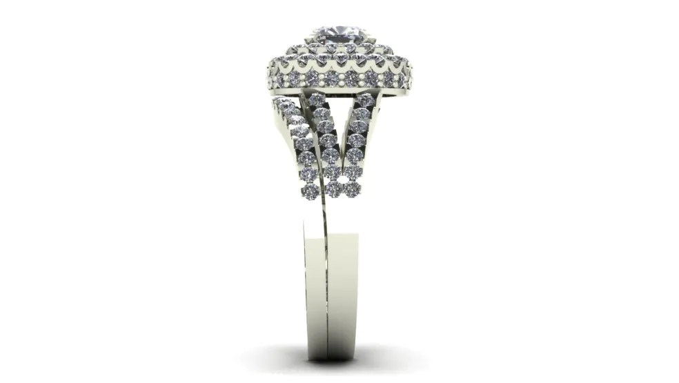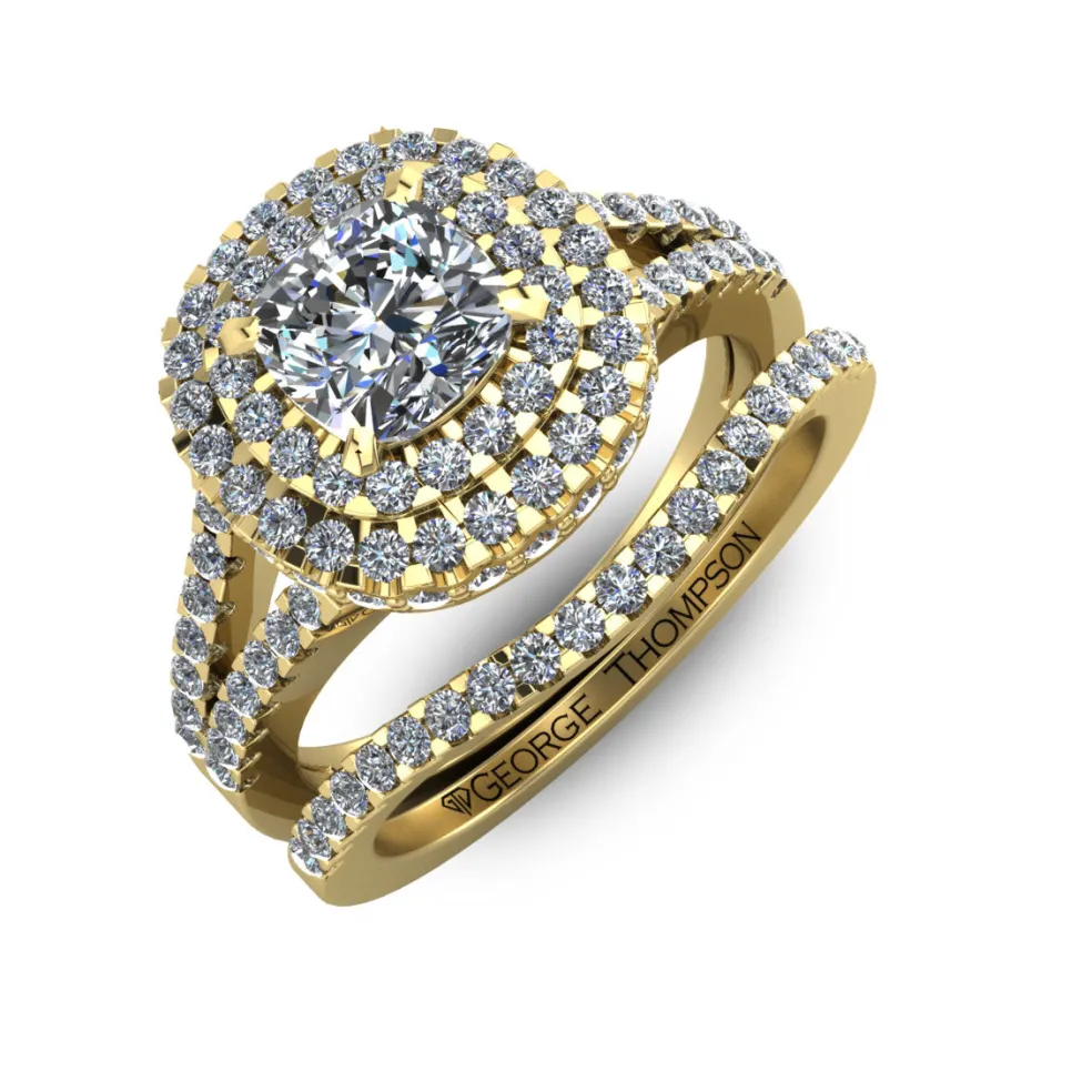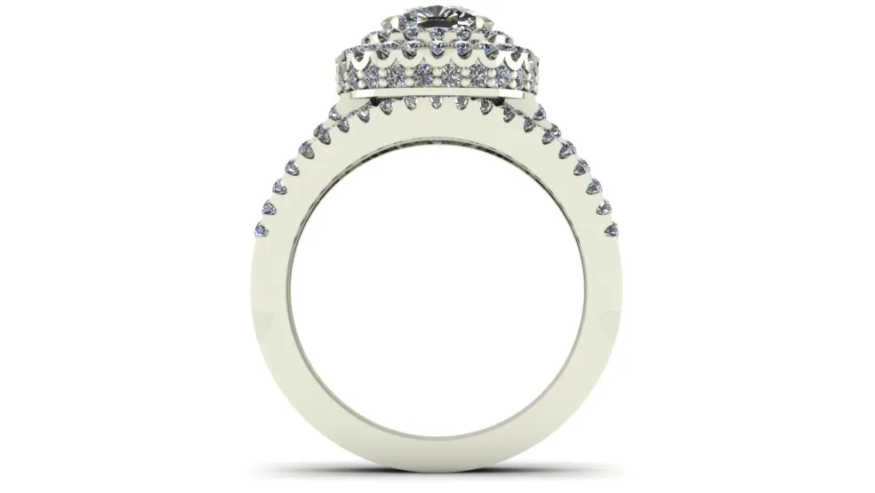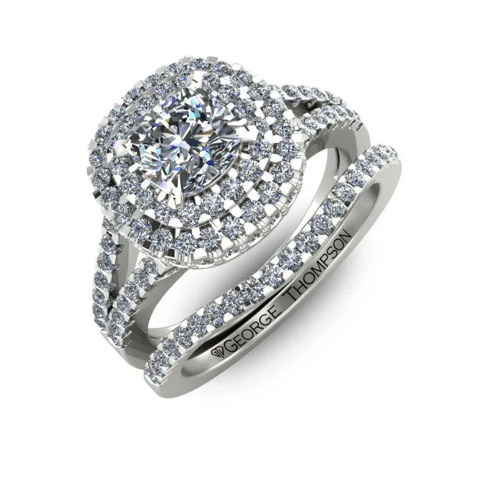 The Sultiana, a dazzling White Gold Diamond Wedding Set that exudes elegance and sophistication. This enchanting piece features a mesmerizing center Cushion Cut Diamond of approximately 0.75ct., perfectly complemented by 115 Round Brilliant accent diamonds with an approximate total weight of 0.85ct. This stunning ring has a total diamond weight of 1.60cts., making it a true showstopper.