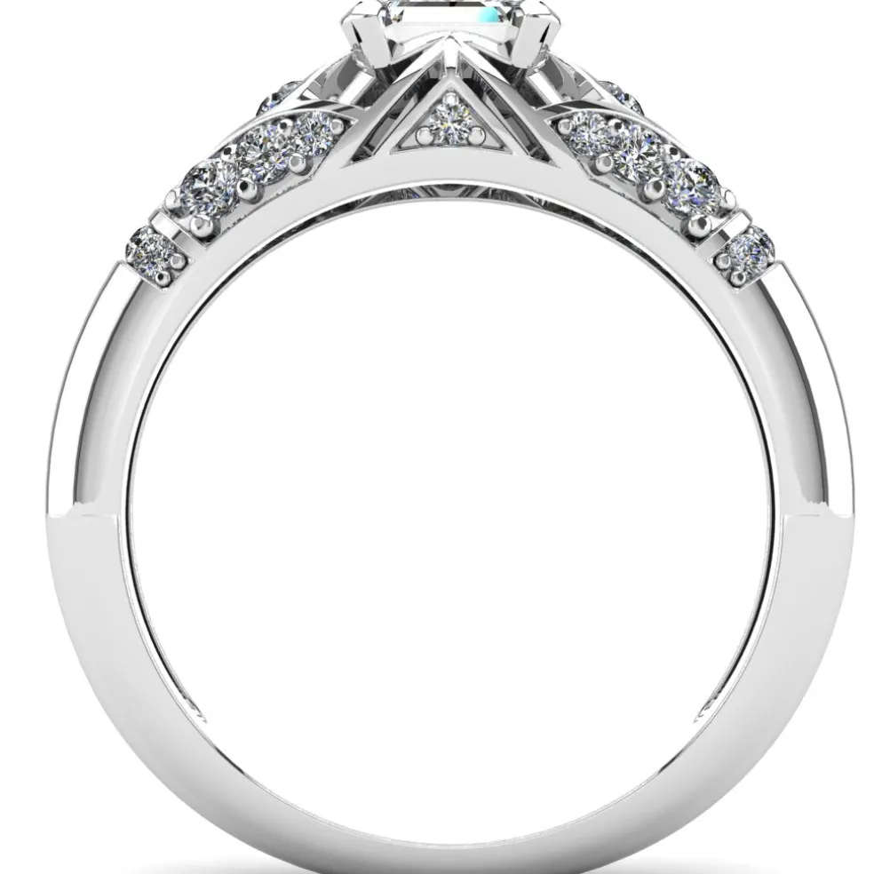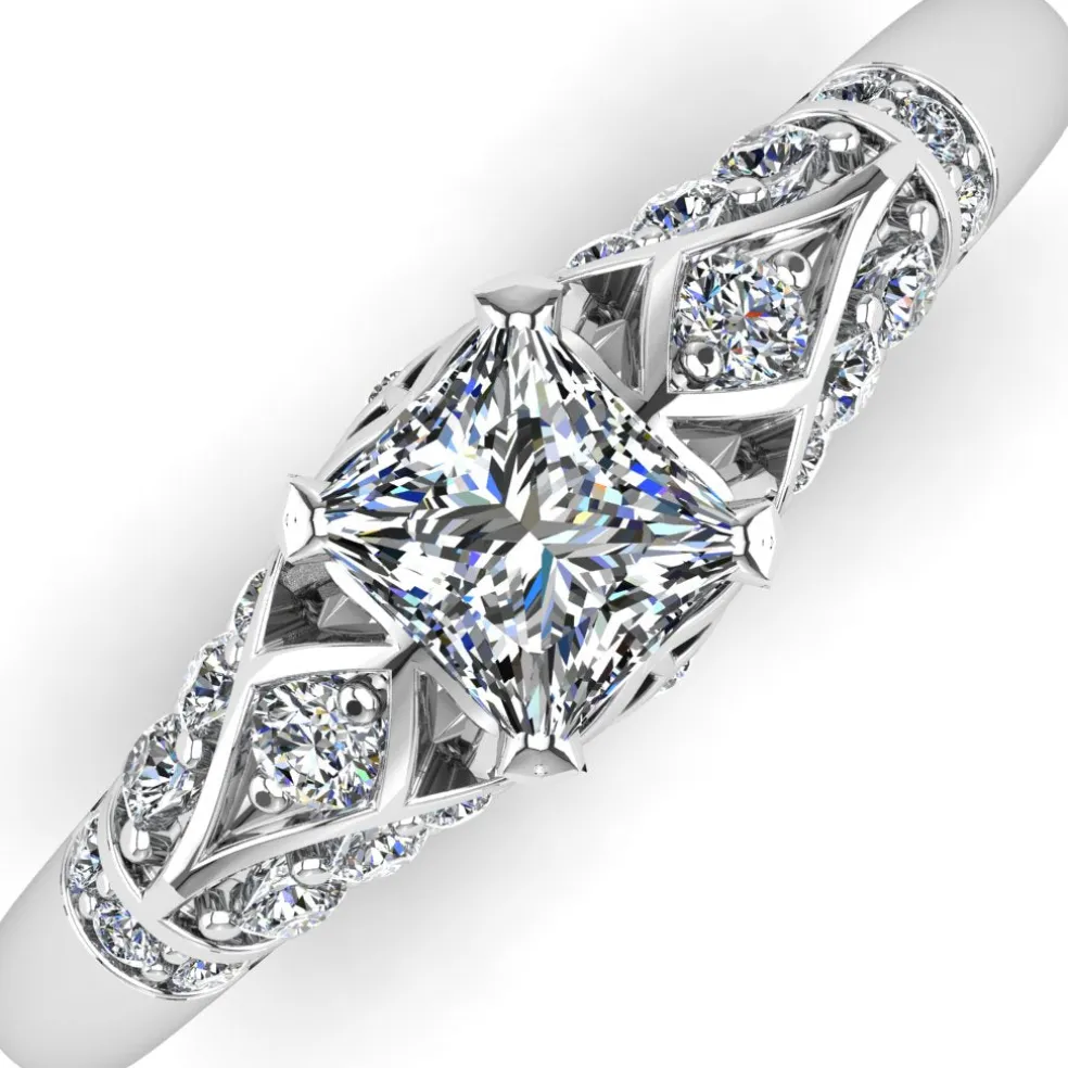Meet the Susanna, a breathtaking vintage diamond ring that radiates with glamour and charm. Crafted in 14kt white gold, this ring features a center princess cut diamond of approximately 1/2ct., surrounded by 22 round brilliant accent diamonds with an approximate total weight of 0.20cts. The total diamond weight of this stunning piece is approximately 0.70cts, making it a truly mesmerizing choice for any bride-to-be.