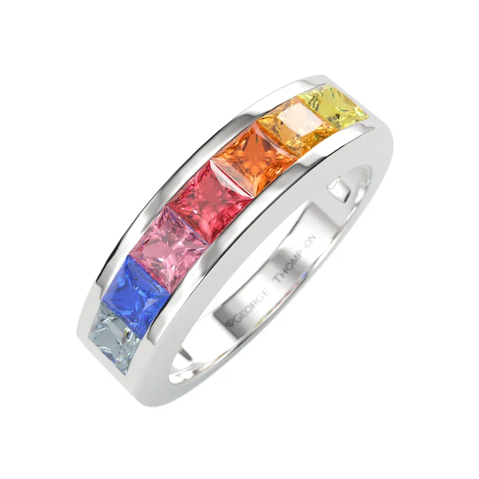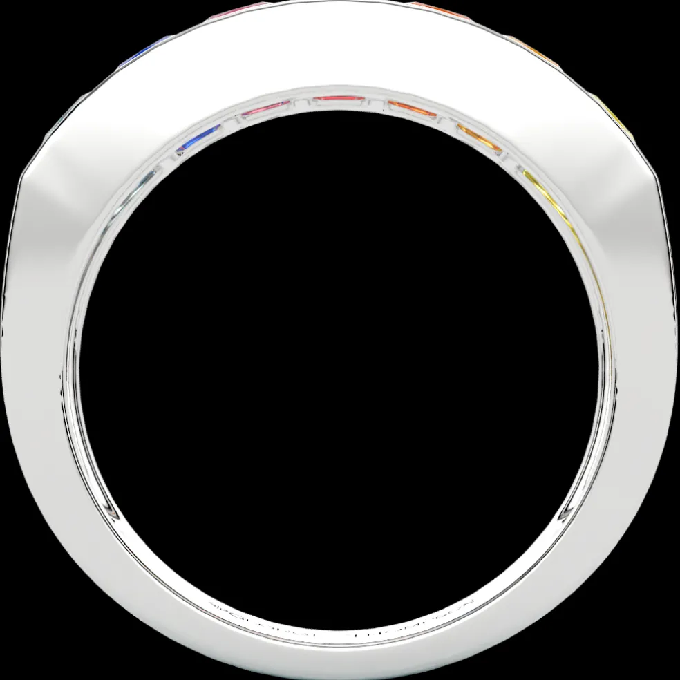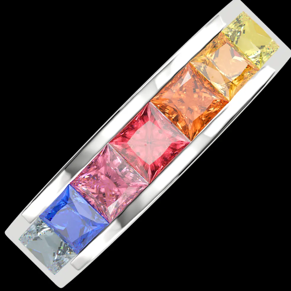 Whether you’re looking for a stylish addition to your everyday wardrobe or a special occasion piece, The Sybila band is the perfect choice. This beautiful band features 7 gorgeous Princess Cut Sapphires that sparkle and shine with a total weight of approximately 1.30 carats. The band is crafted with 14kt white gold that weighs approximately 4.60 grams and is also available in Yellow Gold, Rose Gold, Palladium, and Platinum. The band is designed to fit any finger size and can be customized with any kind of gemstone of your choice.