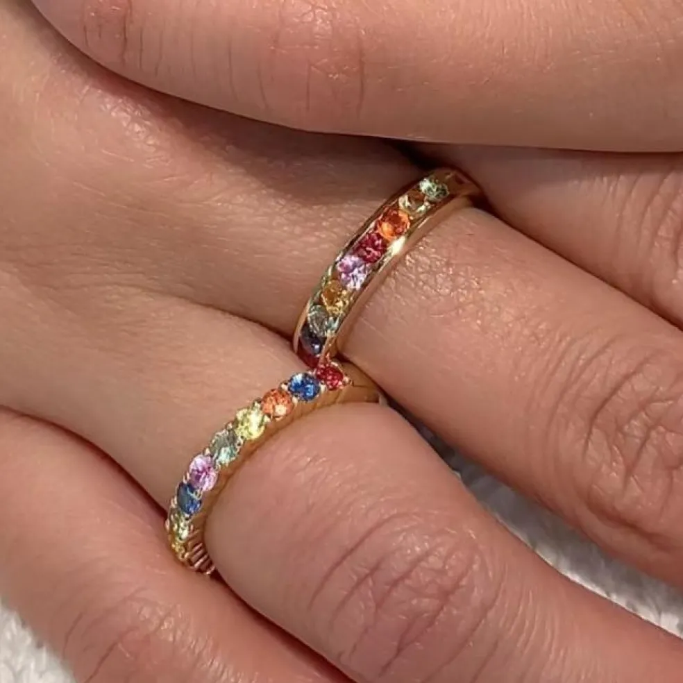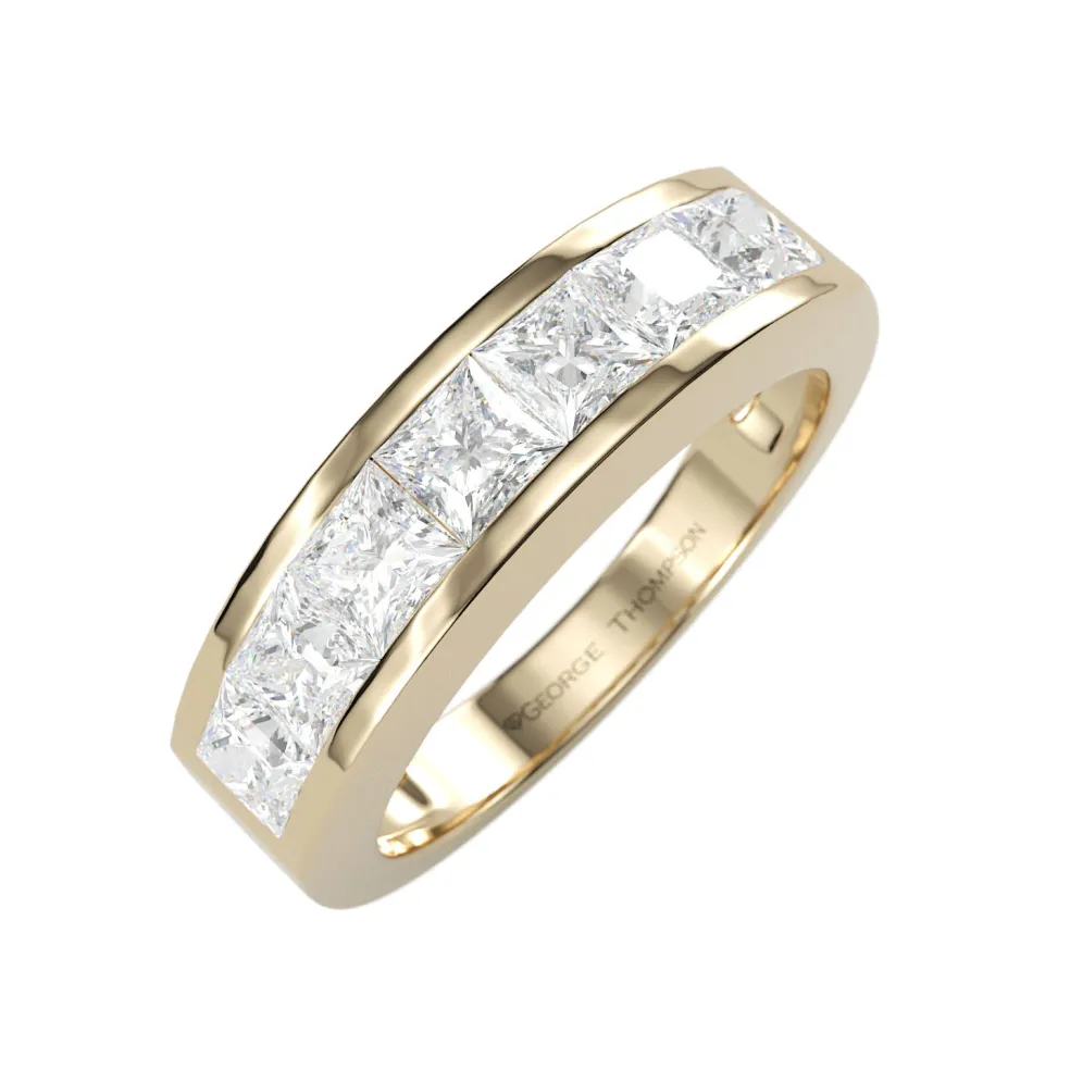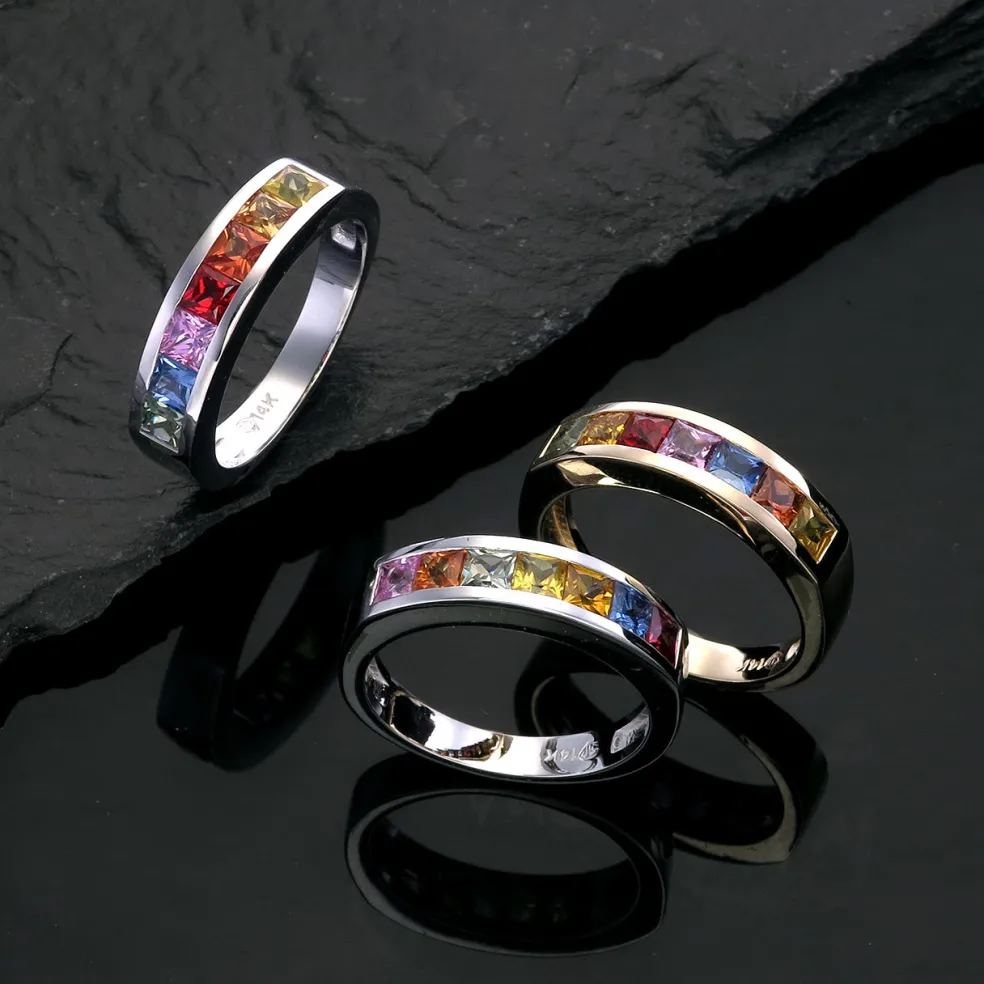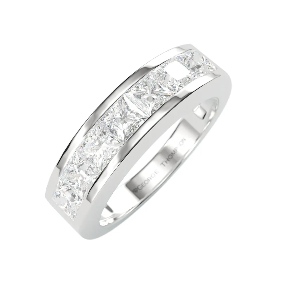 Whether you’re looking for a stylish addition to your everyday wardrobe or a special occasion piece, The Sybila band is the perfect choice. This beautiful band features 7 gorgeous Princess Cut Sapphires that sparkle and shine with a total weight of approximately 1.30 carats. The band is crafted with 14kt white gold that weighs approximately 4.60 grams and is also available in Yellow Gold, Rose Gold, Palladium, and Platinum. The band is designed to fit any finger size and can be customized with any kind of gemstone of your choice.