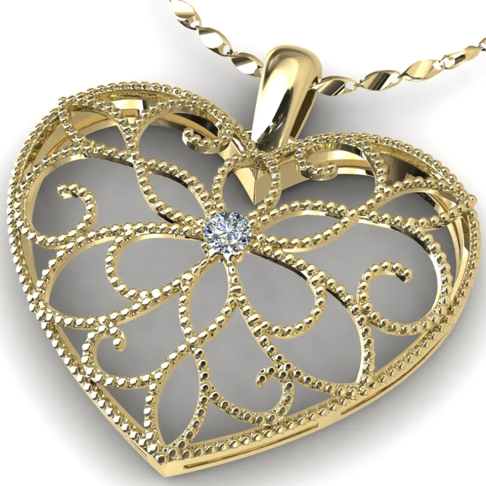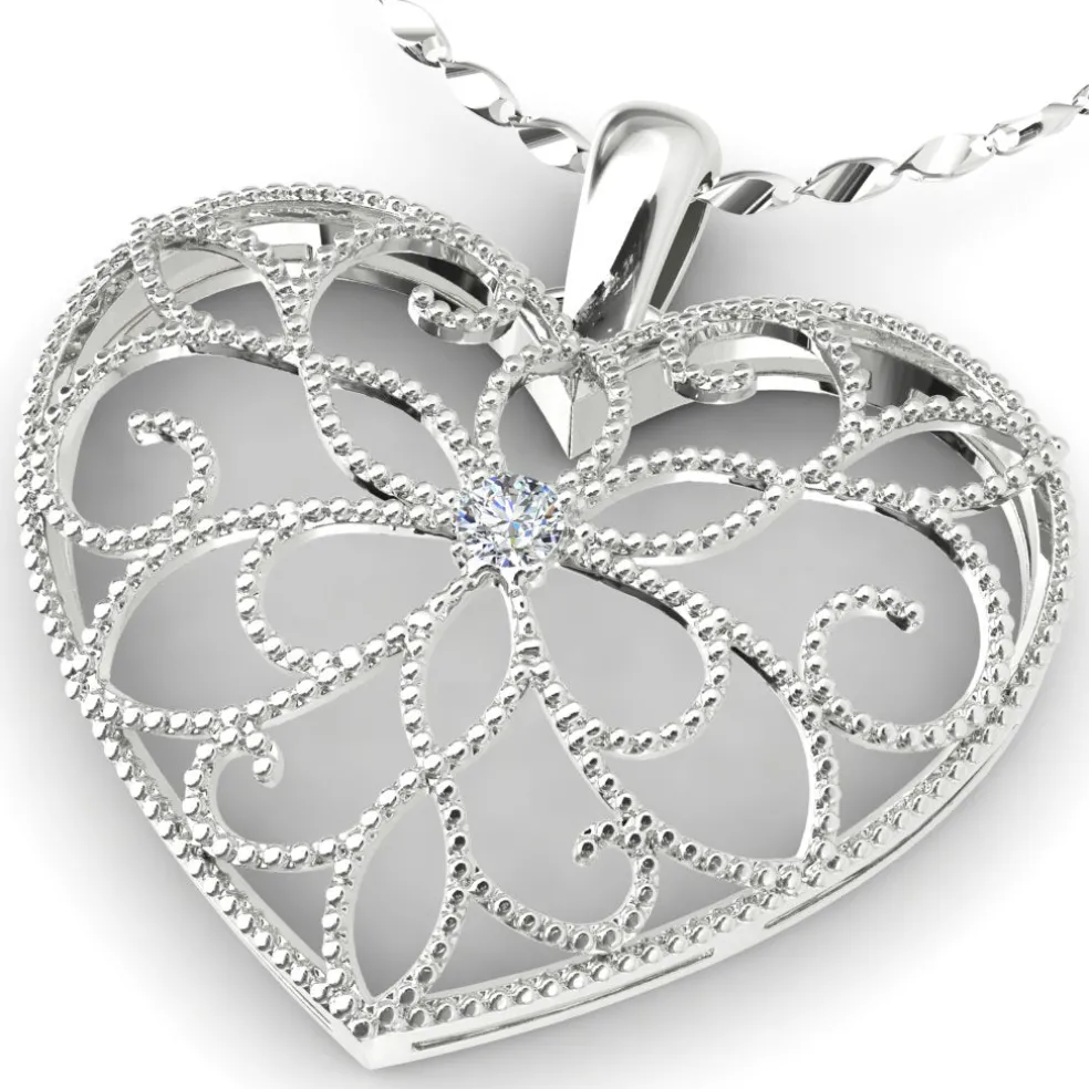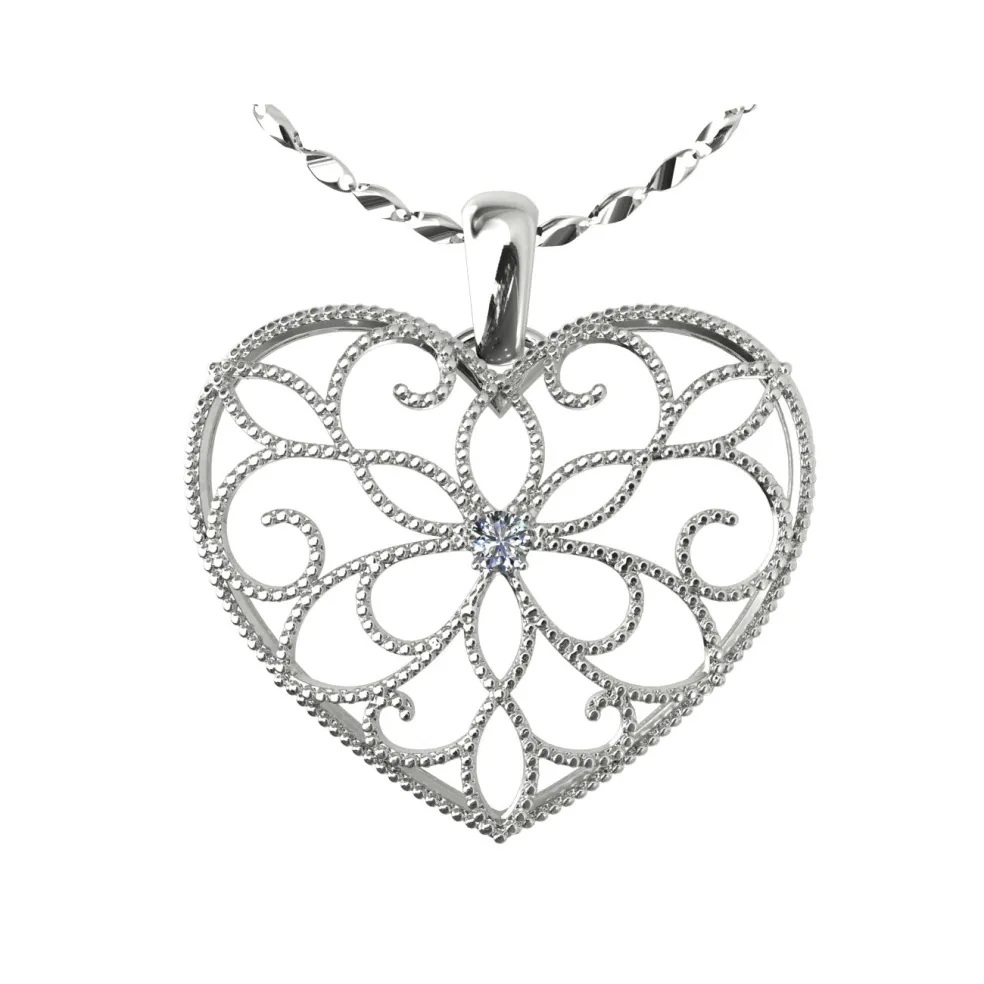 An exquisite diamond heart pendant that boasts an intricate and unique design, the Tamala. Crafted from 14kt white gold, this pendant features 1 stunning round brilliant diamond with a weight of approximately 0.07 ct. The intricate design of the pendant adds to its elegance and makes it a perfect accessory for any occasion. The total weight of diamonds in this pendant is approximately 0.07 ct., making it a beautiful and affordable piece of jewelry.