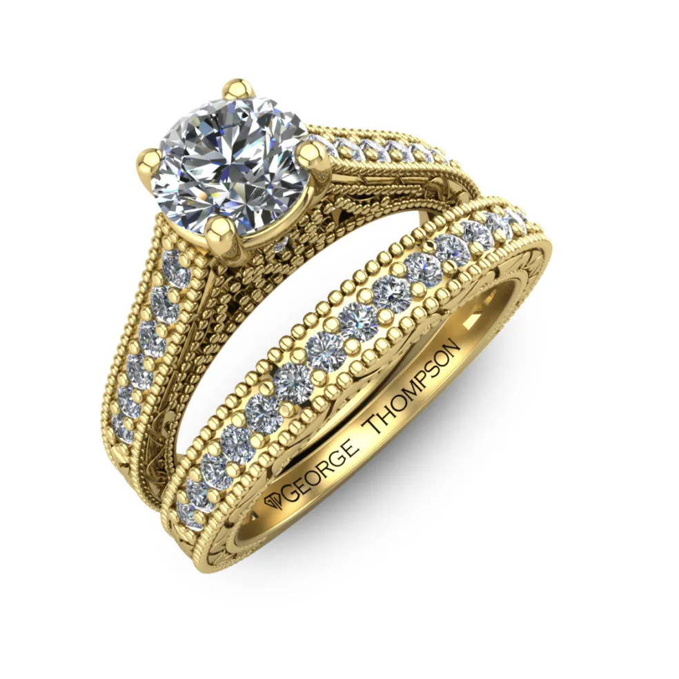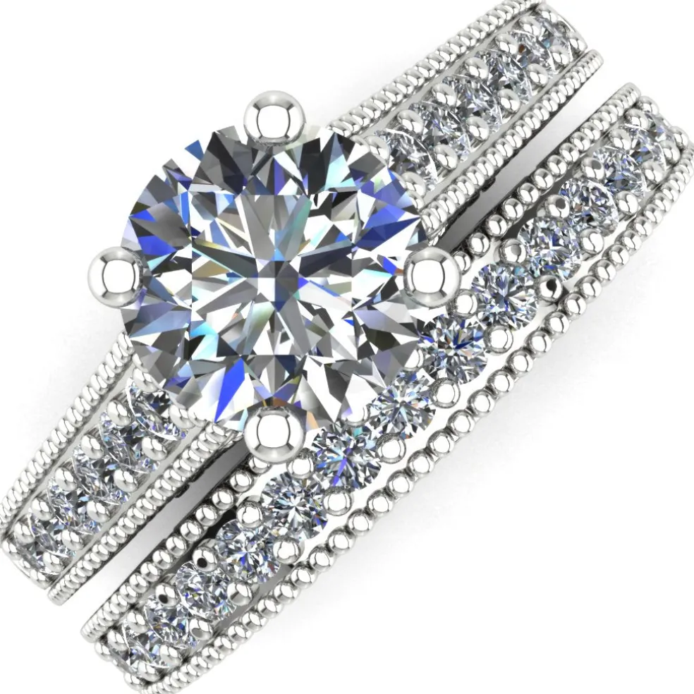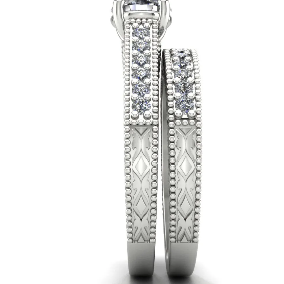Elevate your style with the Tamia, a captivating wedding set that emanates charm and elegance. This enchanting piece features a center round brilliant diamond of approximately 2/3ct, radiating with unparalleled beauty and brilliance. Surrounding the centerpiece are 31 round brilliant accent diamonds, with an approximate total weight of 0.40cts, carefully placed to enhance the overall aesthetic of the ring. With a total diamond weight of approximately 1.10cts, the Tamia is a dainty and delicate piece that is perfect for any occasion. The ring is crafted with 14kt white gold, weighing approximately 6.0 grams, and is also available in Yellow Gold, Rose Gold, Palladium and Platinum, providing a variety of options to suit your unique taste and style.