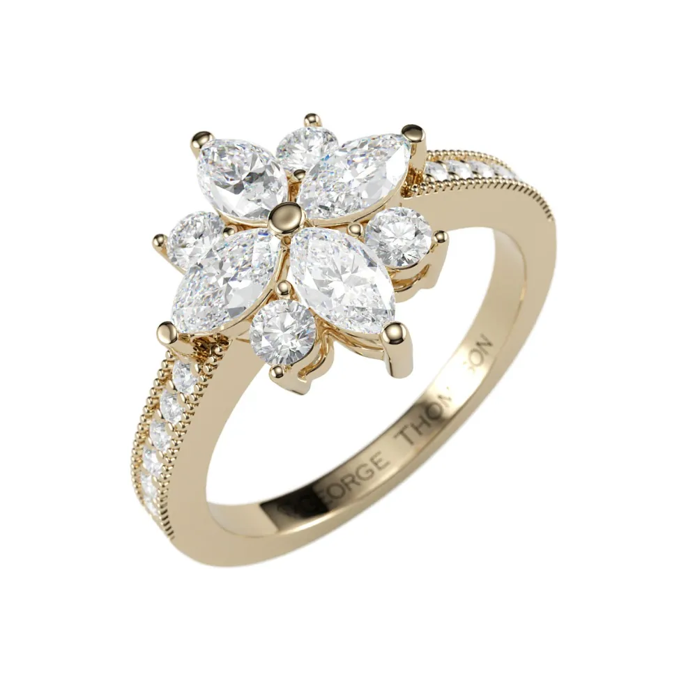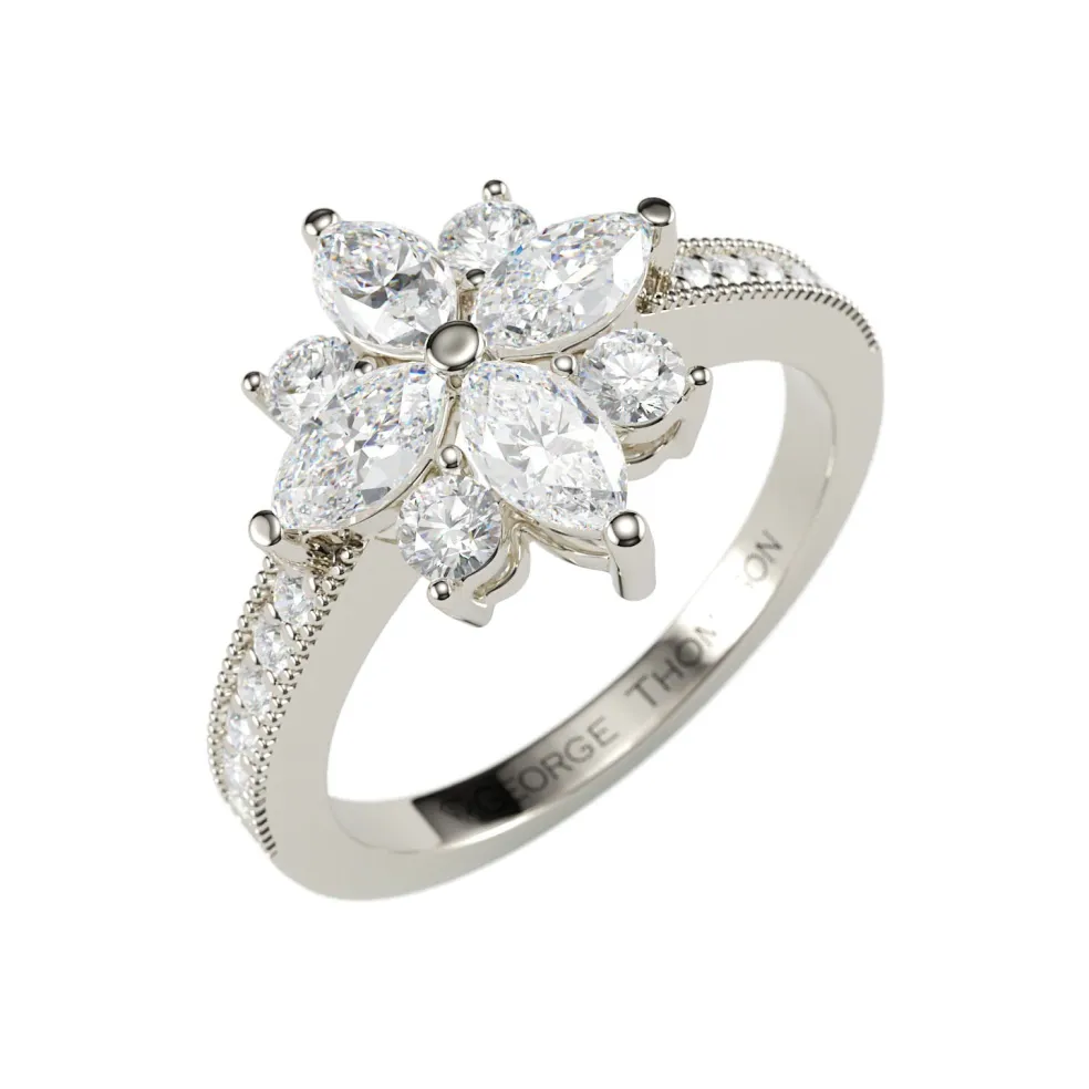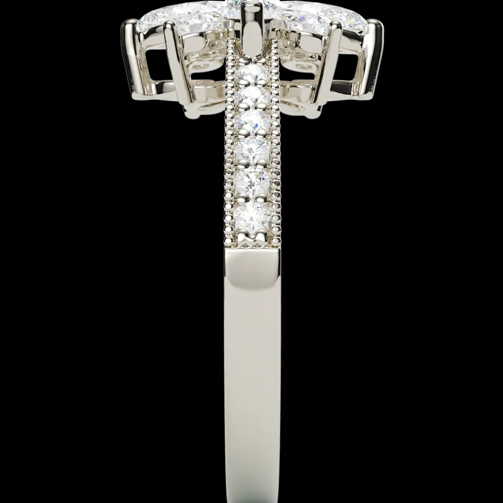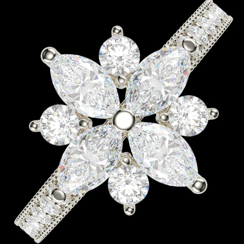 Celebrate your love with the Taveena, a stunning floral-inspired diamond engagement ring that’s sure to take your breath away. The center marquise illusion head is composed of 4 gorgeous marquise cut diamonds and 4 round brilliant accent diamonds of approximately 0.75 ct, creating a unique and striking design. The shank of the ring features an additional 12 round brilliant accent diamonds of approximately 0.10 ct that add a touch of elegance and sparkle. With a total diamond weight of 0.85cts, this ring is a true showstopper. Crafted in 14kt white gold, it weighs just 3.15 grams, making it comfortable to wear all day long. Also available in Yellow Gold, Rose Gold, Palladium, and Platinum, the Taveena can be customized to fit any size.