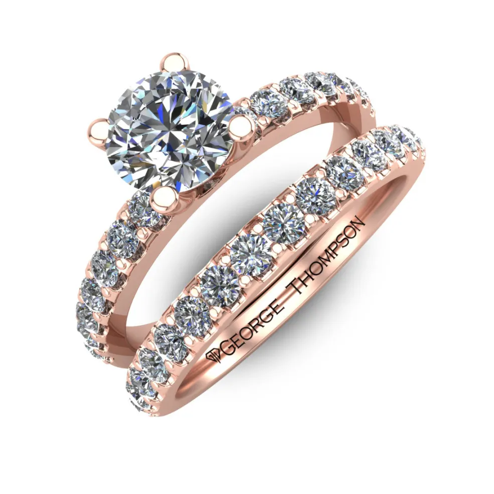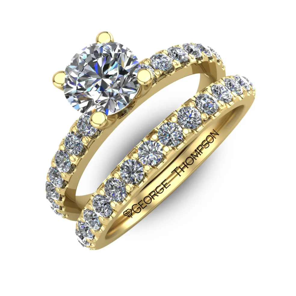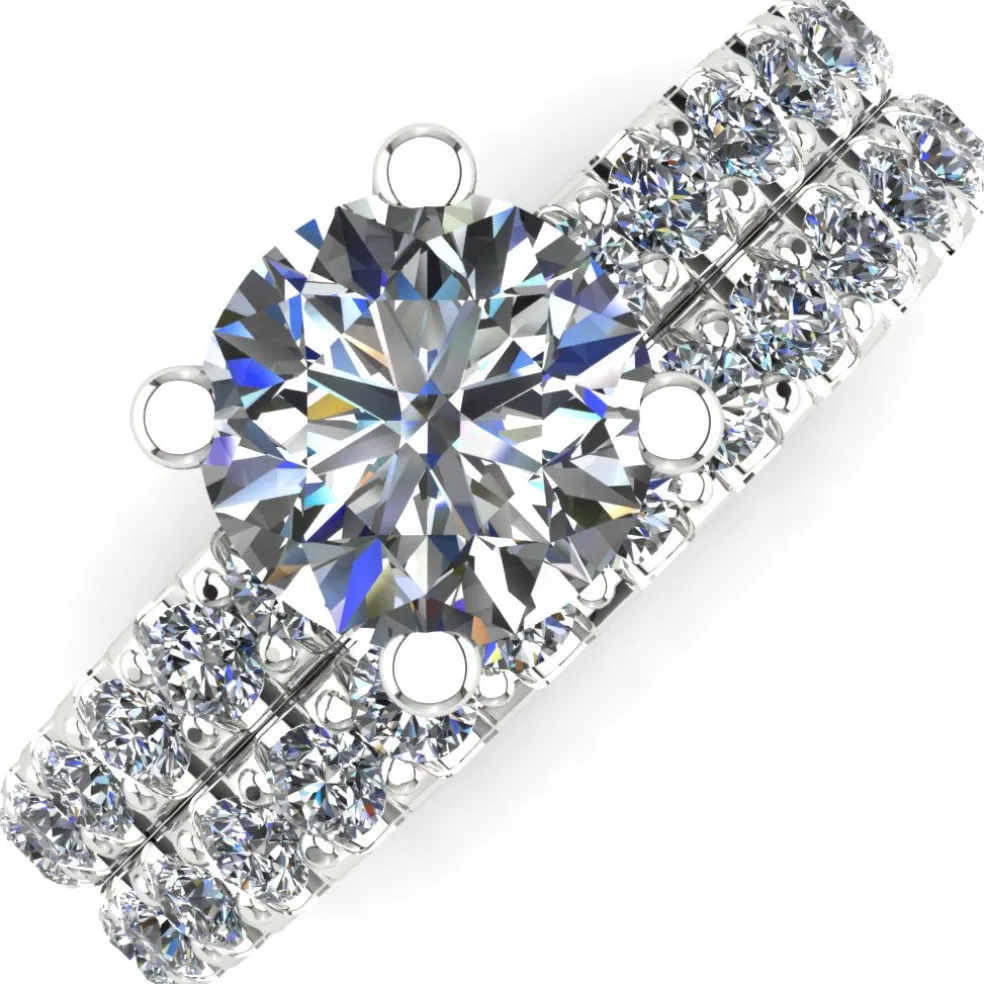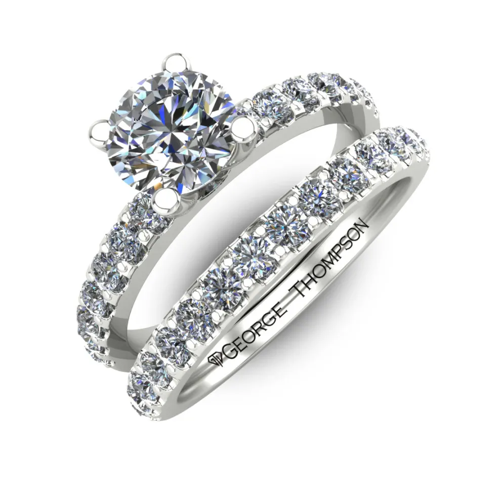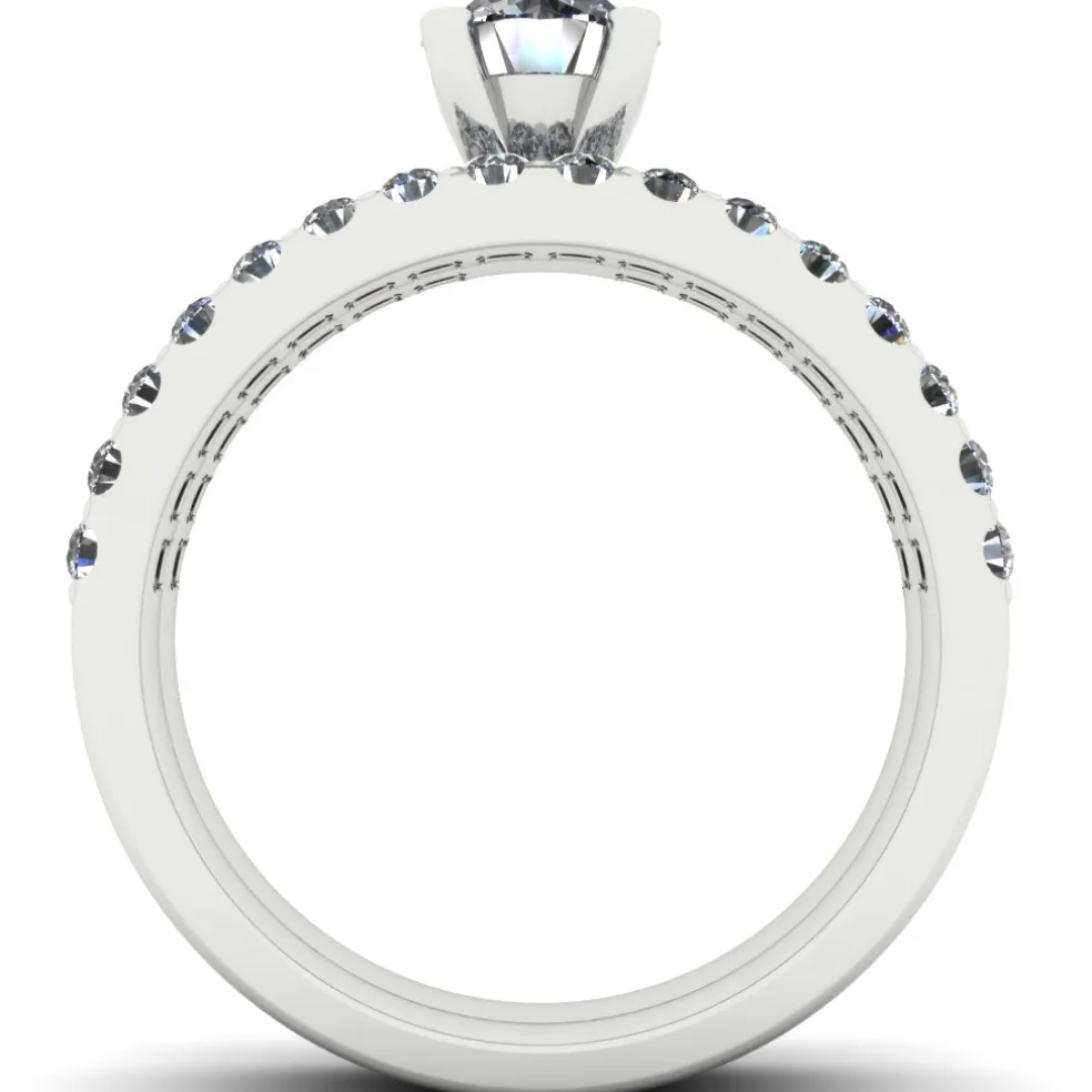 The Torda is the ultimate symbol of chic and elegance. This simple yet breathtaking wedding set is crafted with the finest quality 14kt white gold and adorned with a center Round Brilliant Diamond of approximately 1.00ct., 30 Round Brilliant accent diamonds with an approximate total weight of 0.40cts. and has a total diamond weight of approximately 1.40cts. Weighing approximately 4.2 grams, this ring is delicately designed to fit any size, ensuring that it is comfortable and snug for a lifetime of wear.