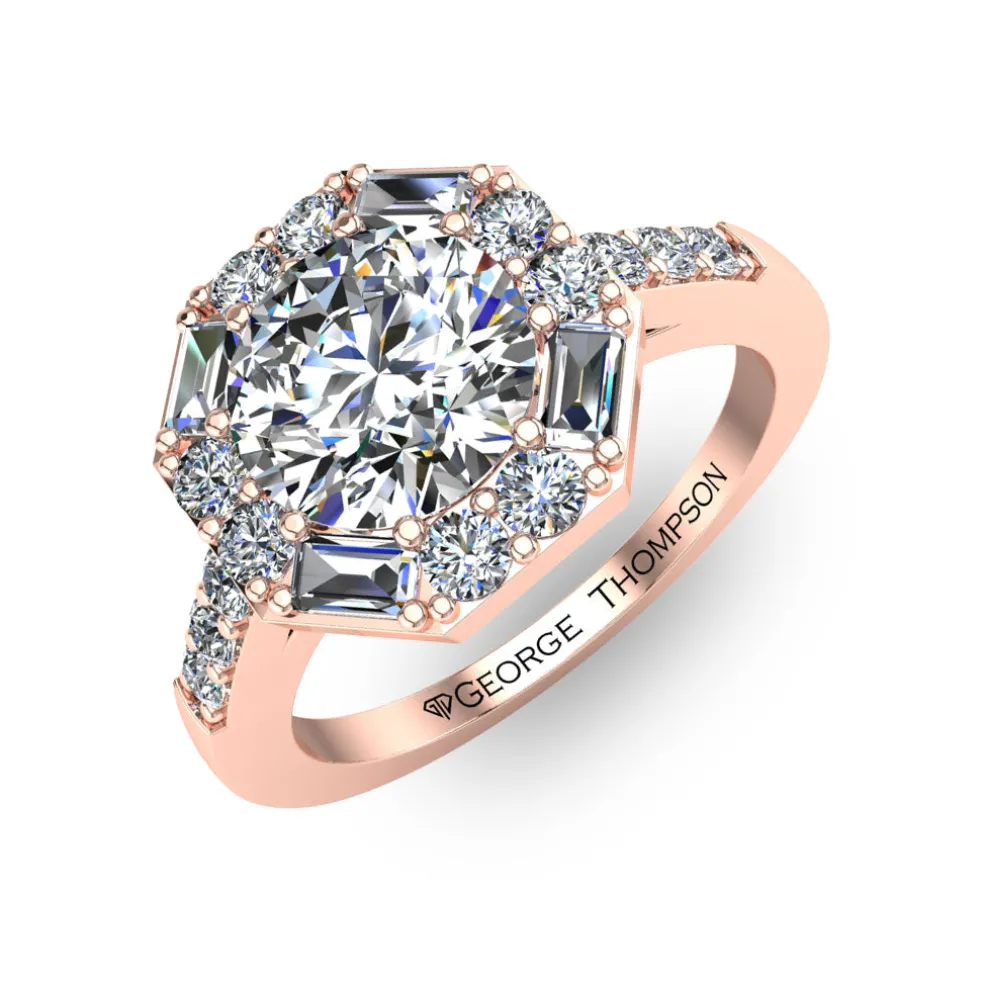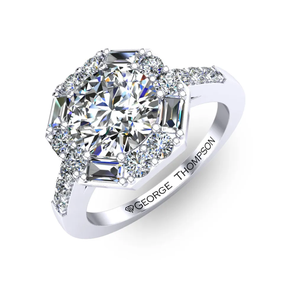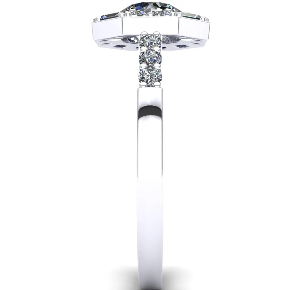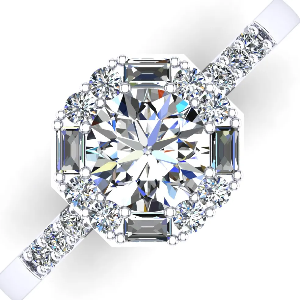 The Vadima is a unique Diamond Engagement Ring that will catch everyone’s attention. It features a stunning center Round Brilliant Diamond of approximately 0.85 carats, which is beautifully accentuated by 14 Round Brilliant accent diamonds and 4 baguette cut diamonds with an approximate total weight of 0.60 carats.