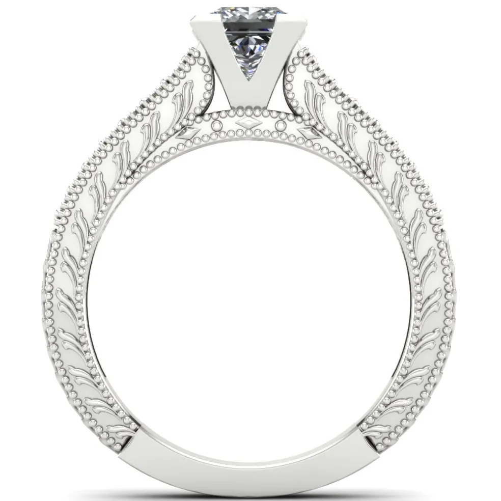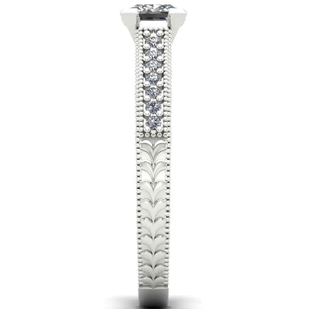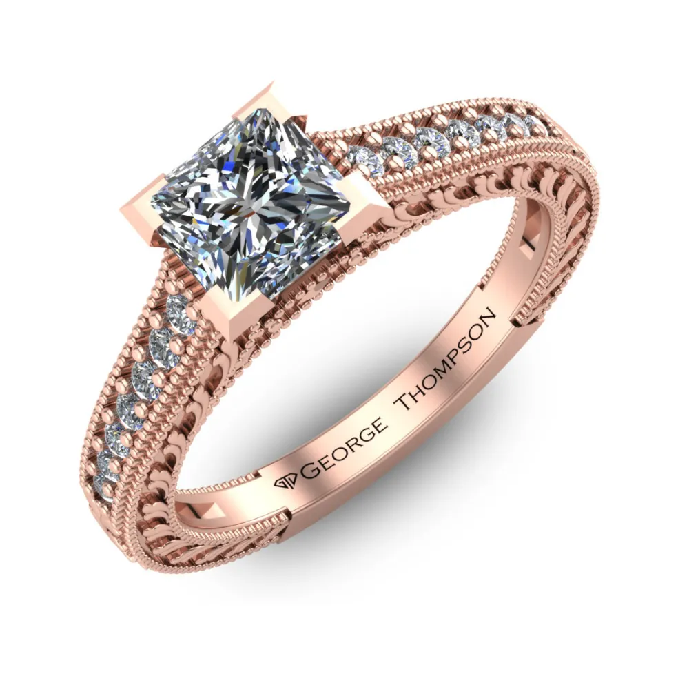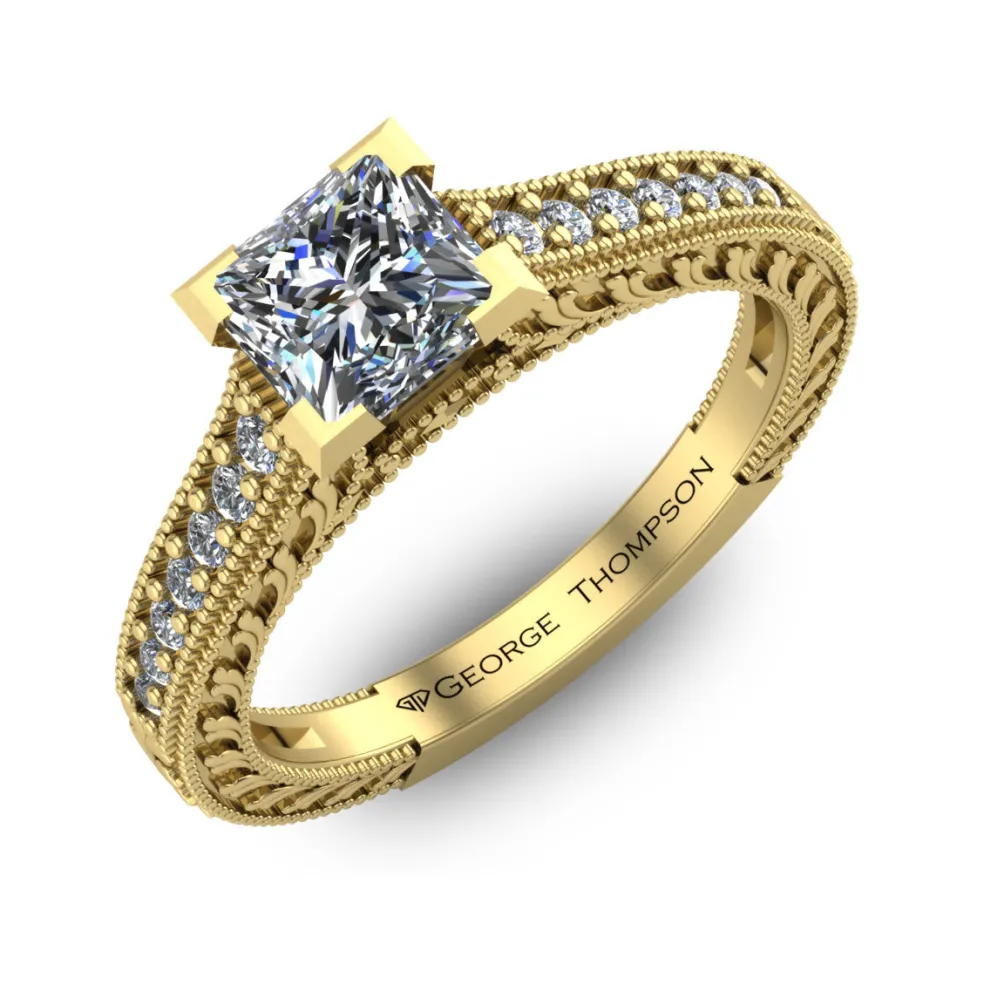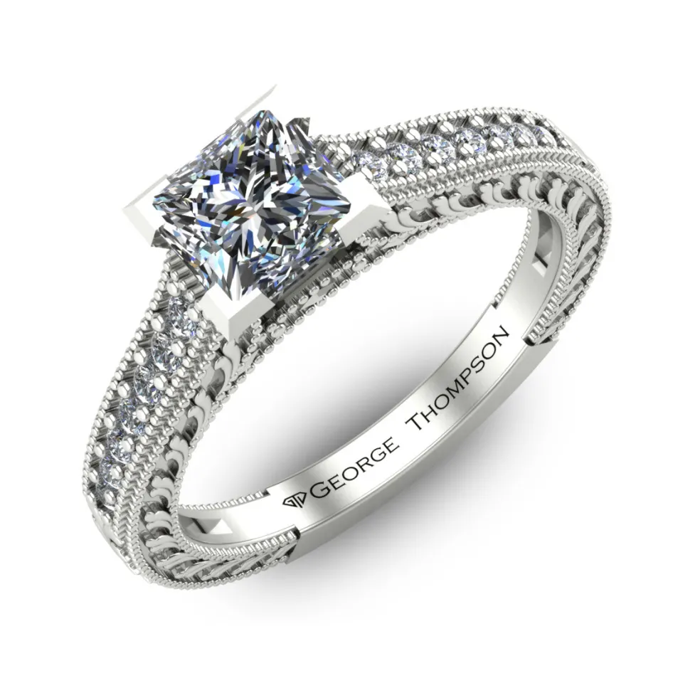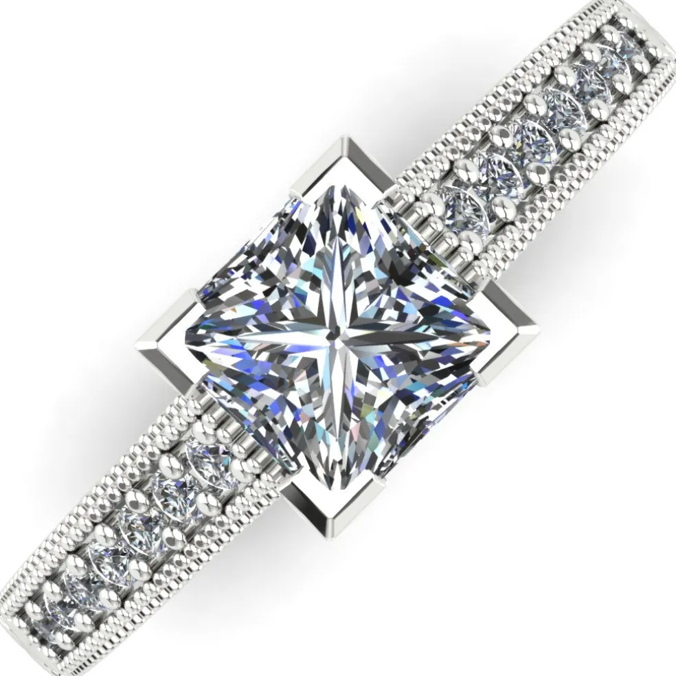 Elevate your style with the Vasca, a sleek and modern engagement ring that is sure to turn heads. This stunning piece features a center princess-cut diamond, approximately 3/4ct in weight, that adds a touch of sophistication and elegance to the overall design. The Vasca is further enhanced with 14 round brilliant accent diamonds, with an approximate total weight of 0.15cts, that add a touch of sparkle and shine.