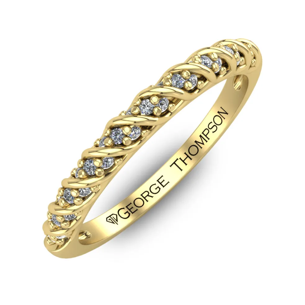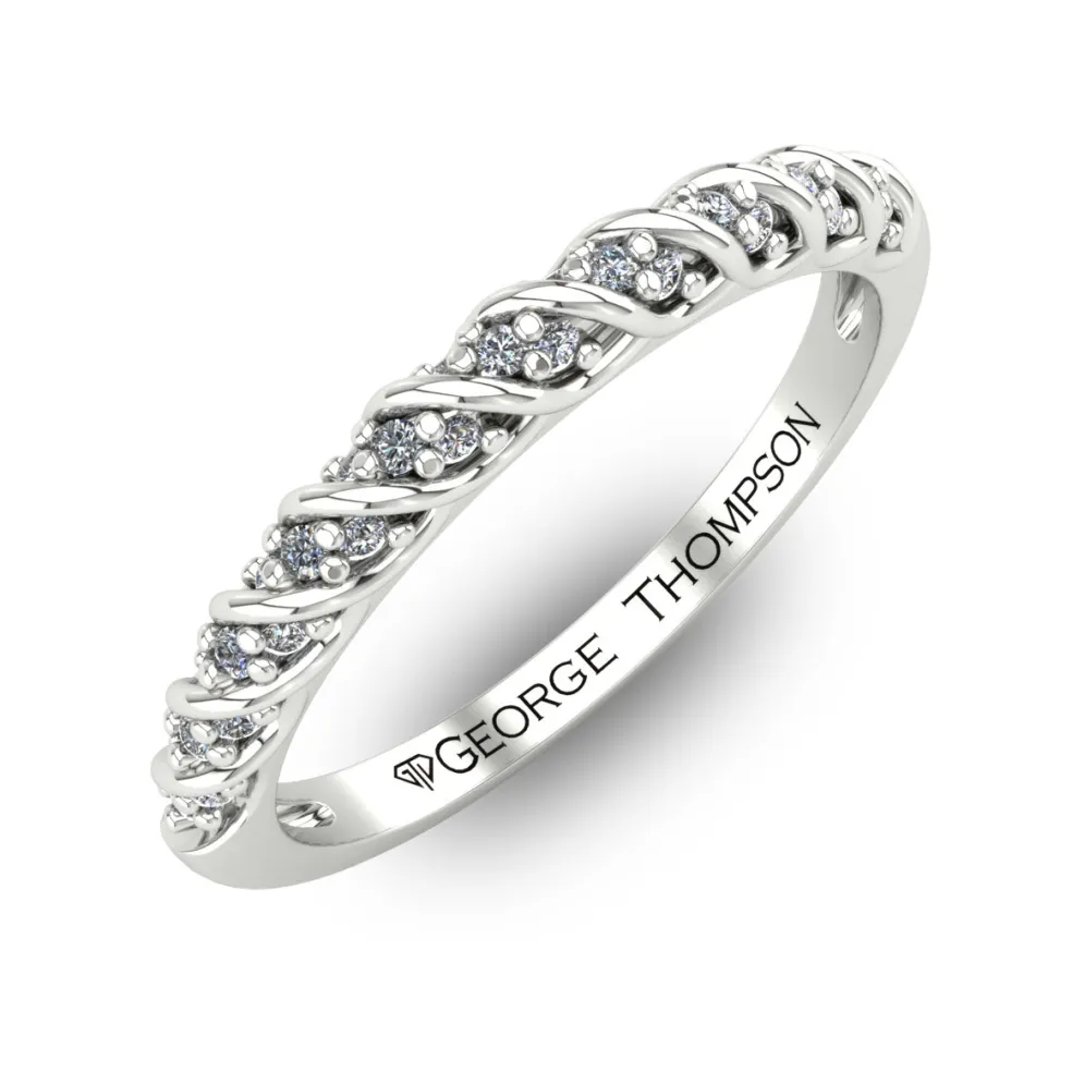 The Vortecia, a wedding band that’s as feminine as it is breathtaking! Crafted from 14kt white gold, this ring features 30 Round Brilliant diamonds of approximately 0.20cts. And at just 2.2g, it’s light enough to wear comfortably all day long.